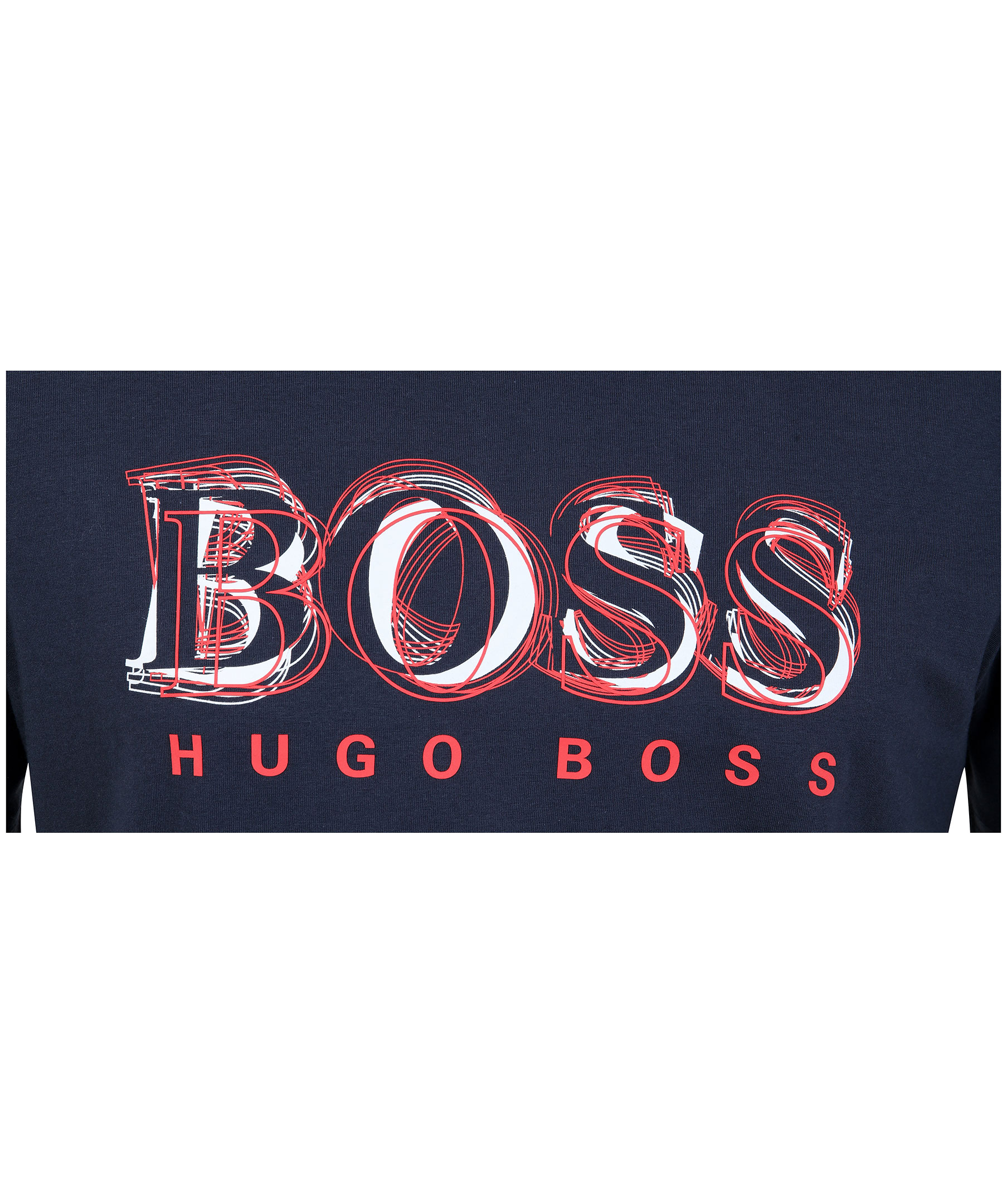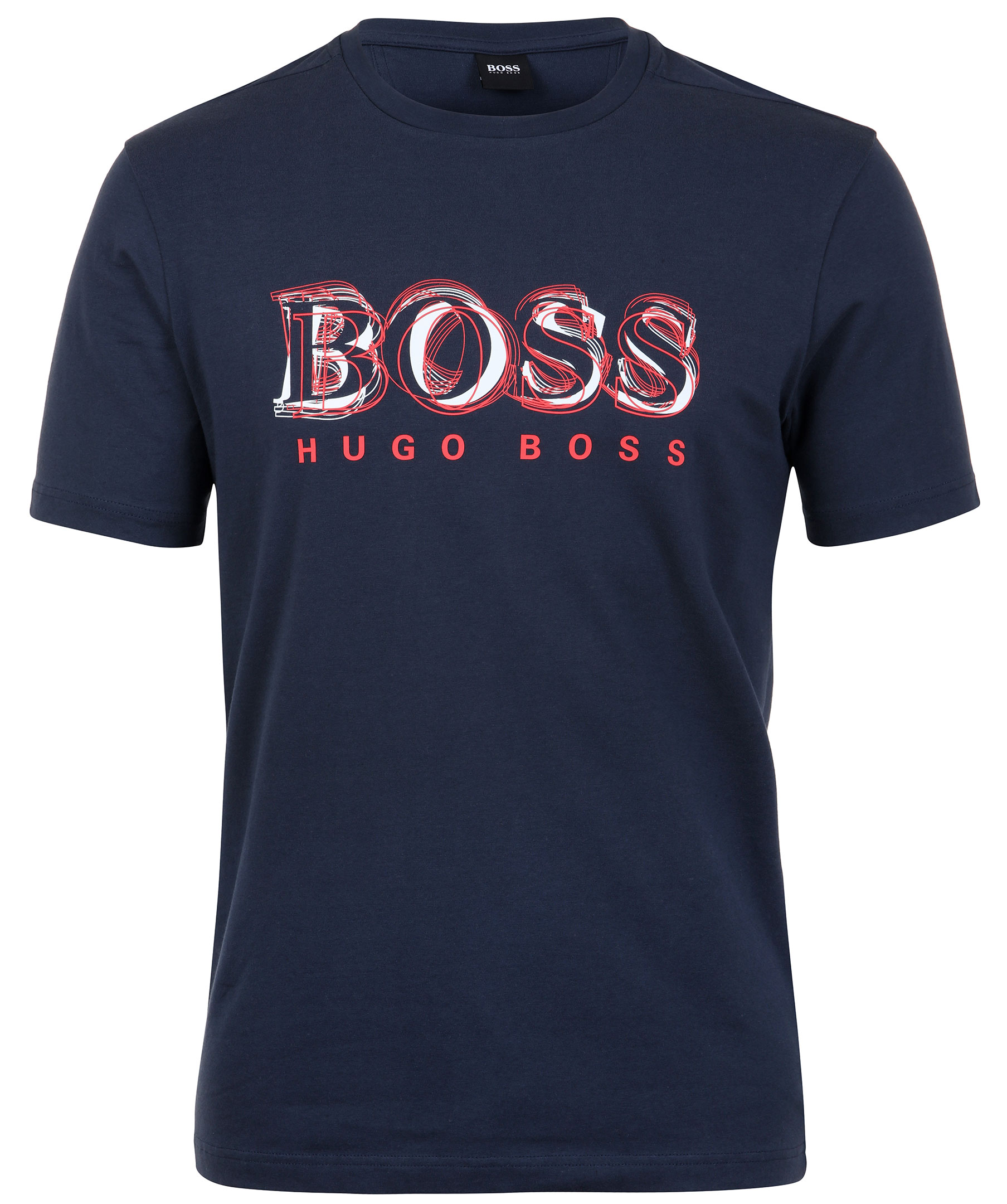 Marinblå t-shirt i stretchig fit från Hugo Boss. Tillverkad i ett mjuk bomullstyg. Tvåfärgad gummerad logga på bröstet.