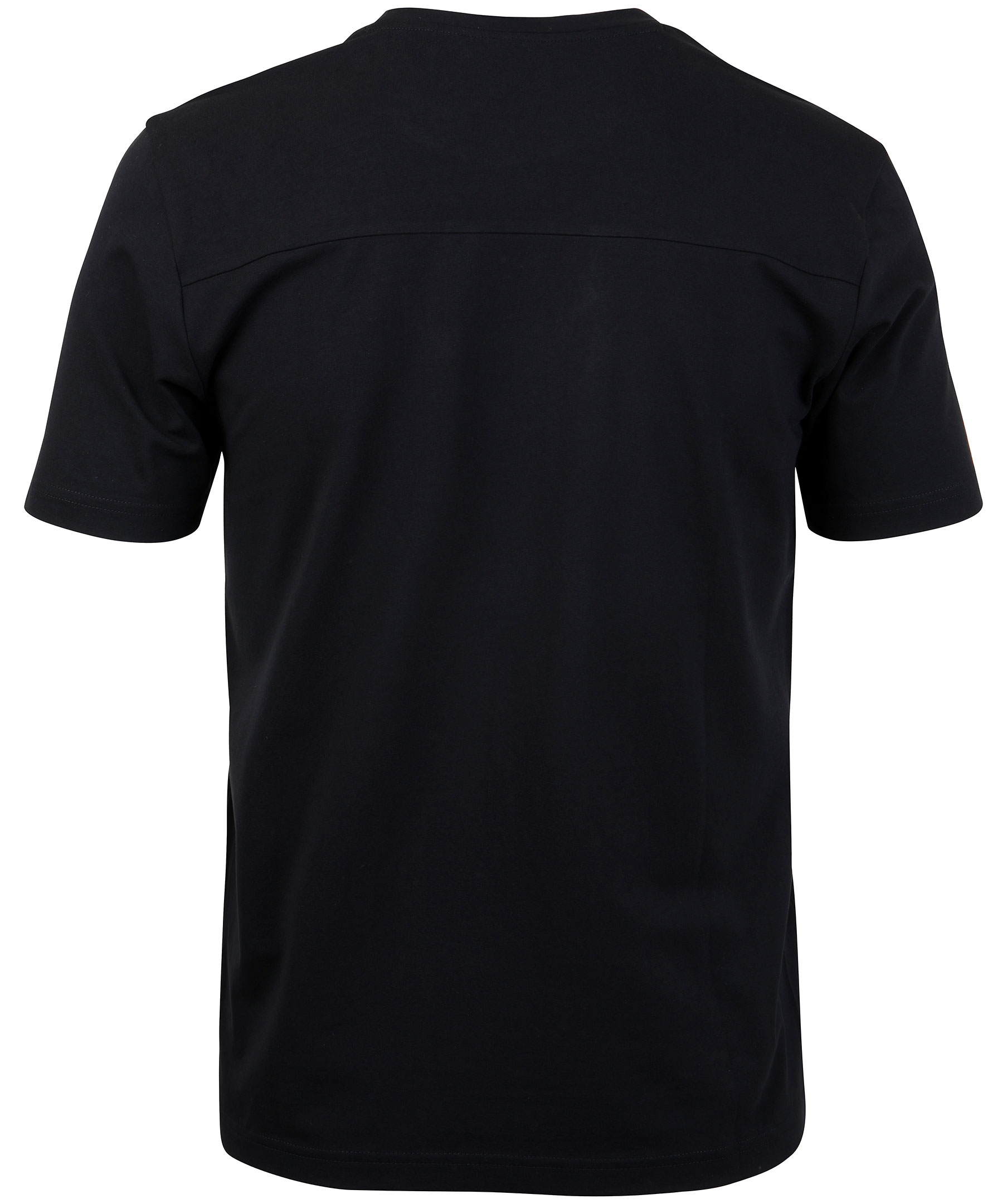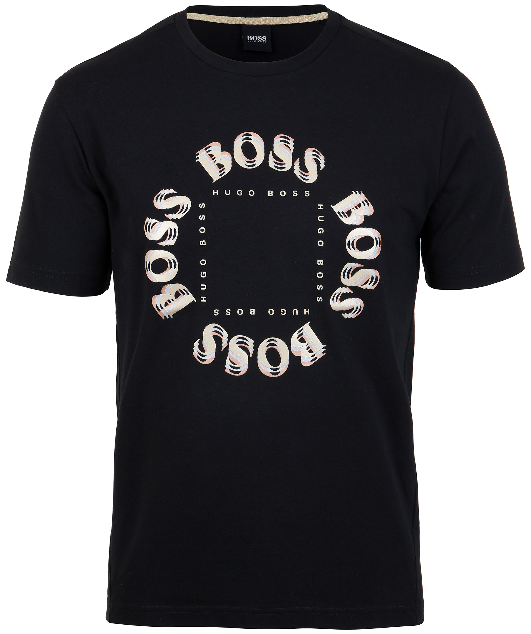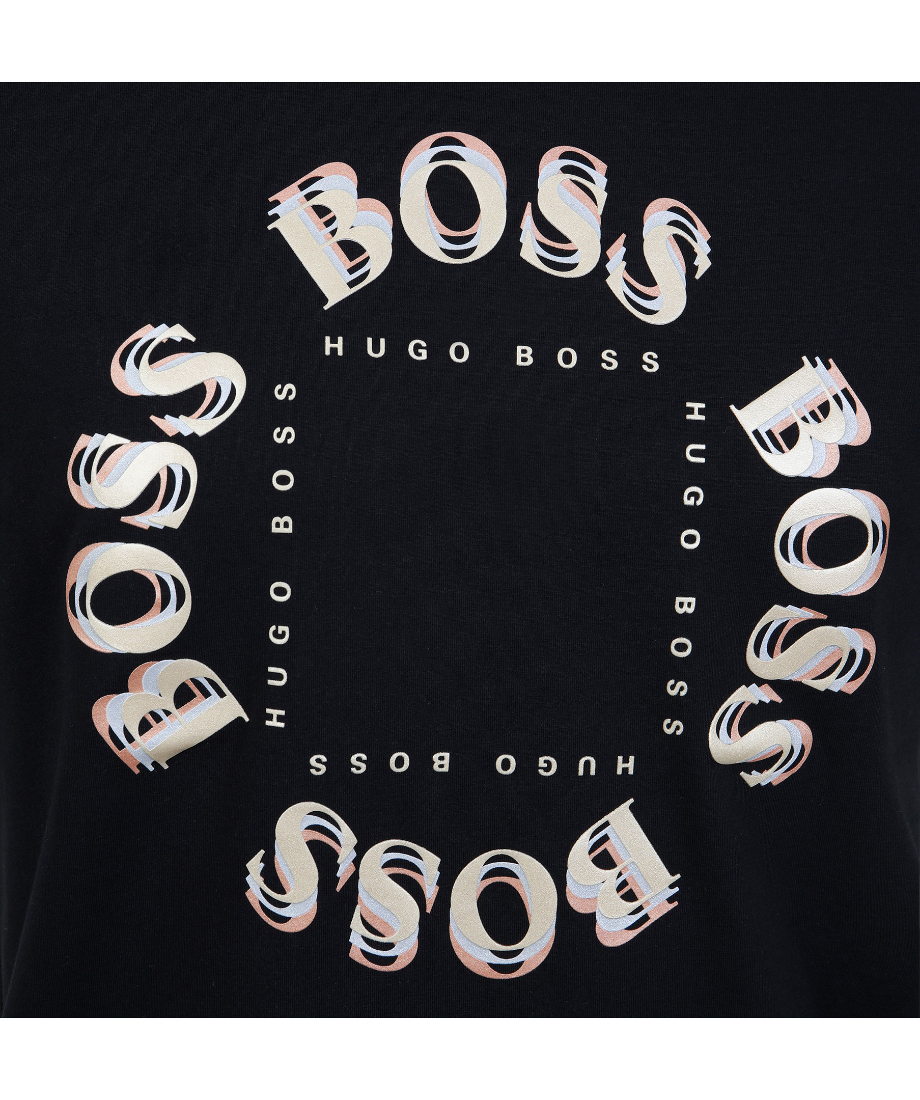 Svart, rundhalsad t-shirt från Hugo Boss. Tryckt logotyp på bröstet i silver, guld och brons. Tillverkad i mjuk bomull.