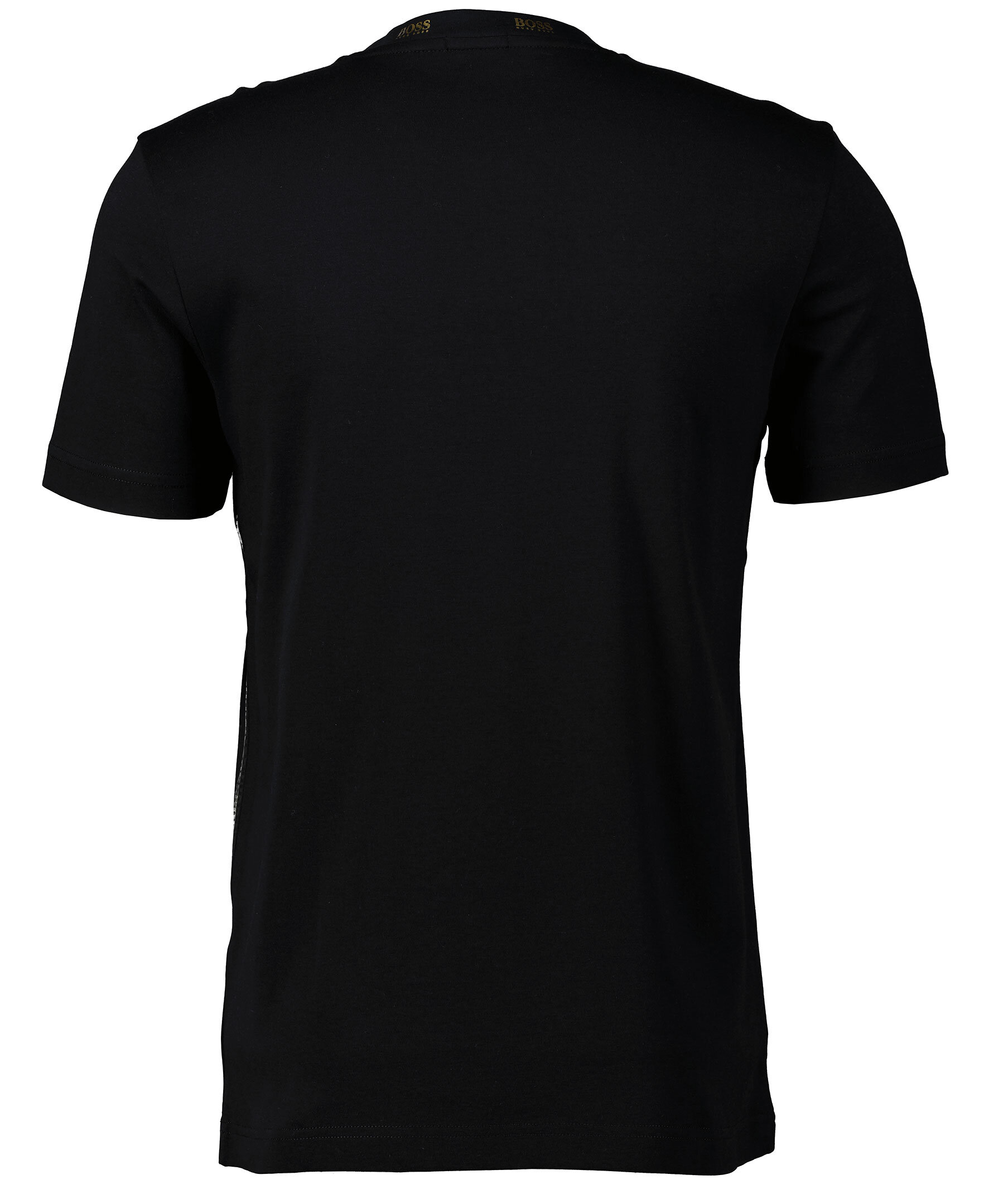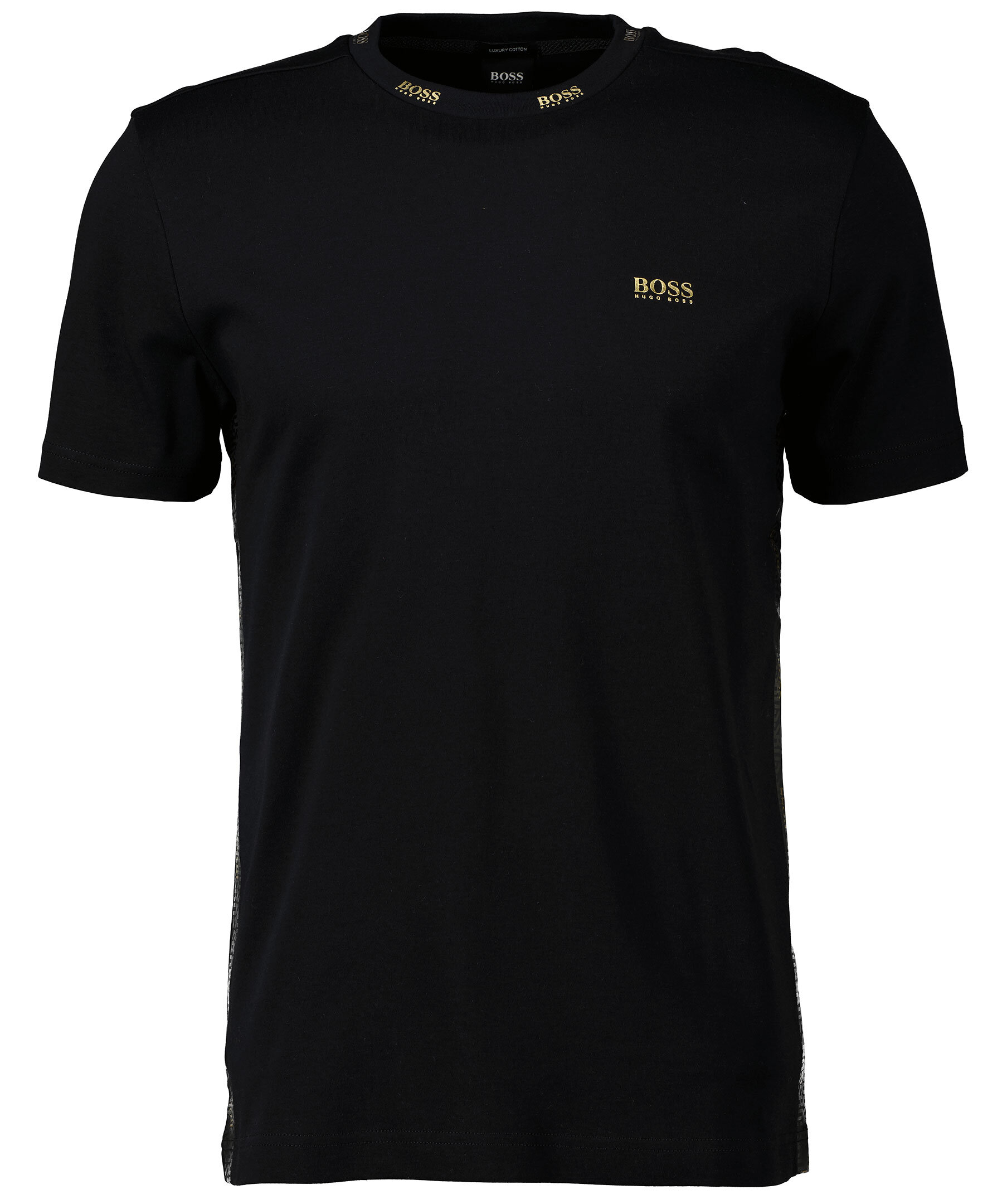 Svart t-shirt från Boss Athleisure. Tillverkad i ett skönt bomullstyg och har rundad halsringning. Guldfärgade logotyper kring halsringning , på vänster sida av bröstet och på revärer längs sidorna.