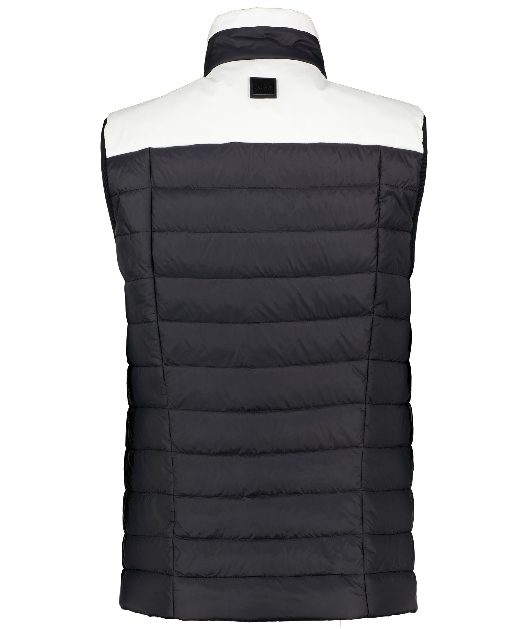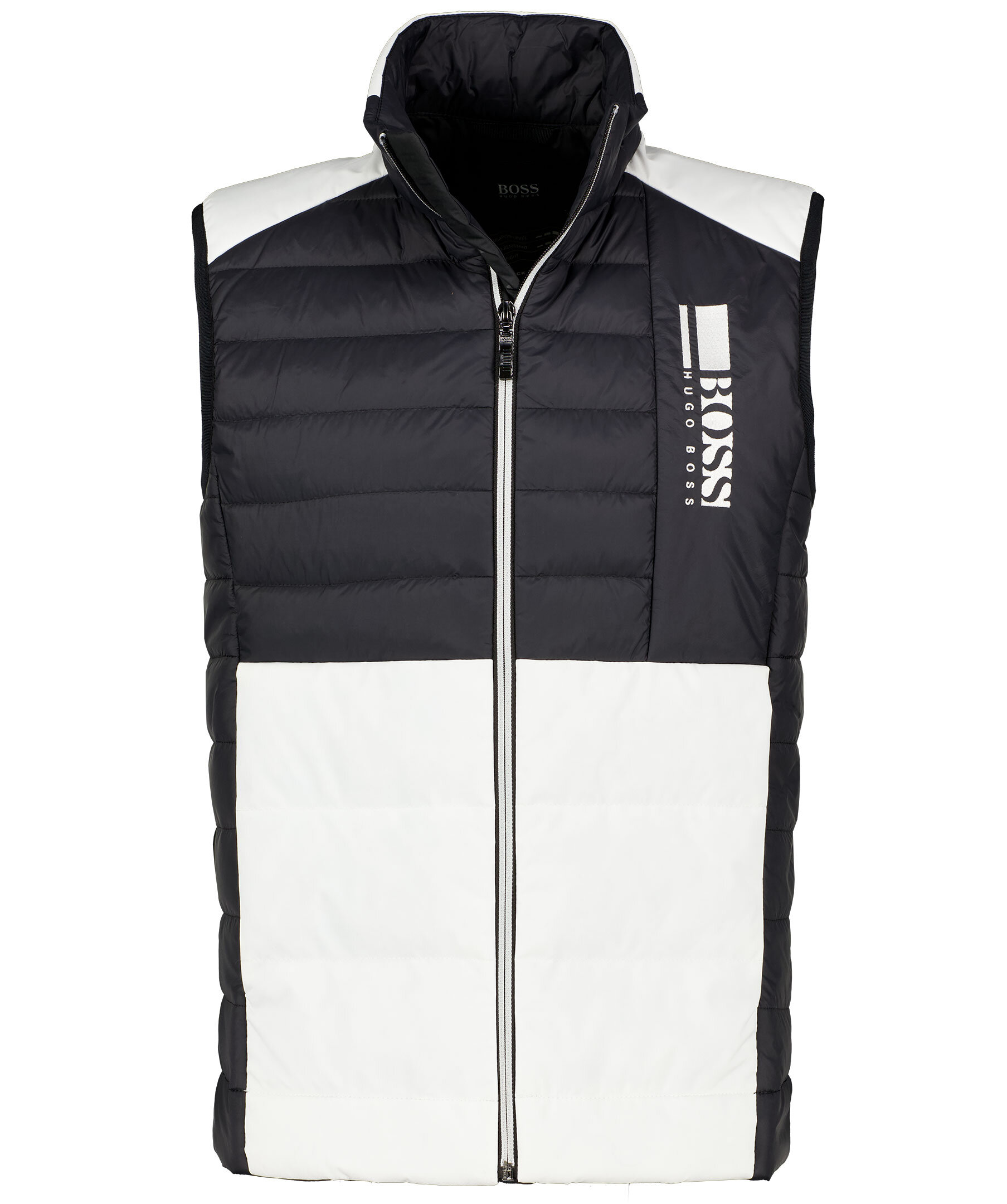 Svart dunväst med vita partier från Boss Athleisure. Tillverkad i polyamidtyg och har ett svart foder på insidan. Vit, broderad logotyp på vänster sida av bröstet. Stängs med dragkedja fram, har två framfickor med tryckknapp och smal mudd i ärmslut. *Broderad logga *Tvåfärgad *Två fickor