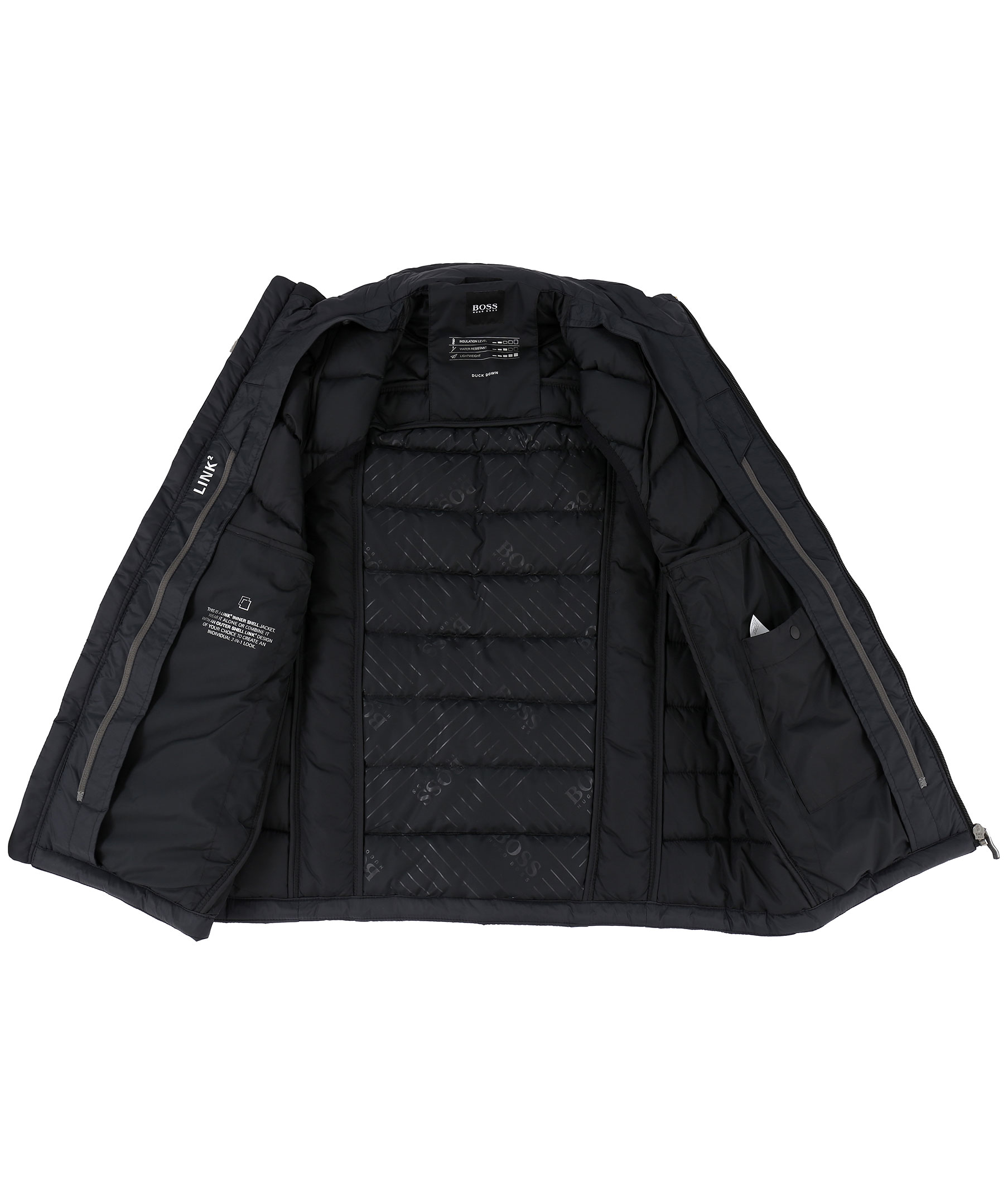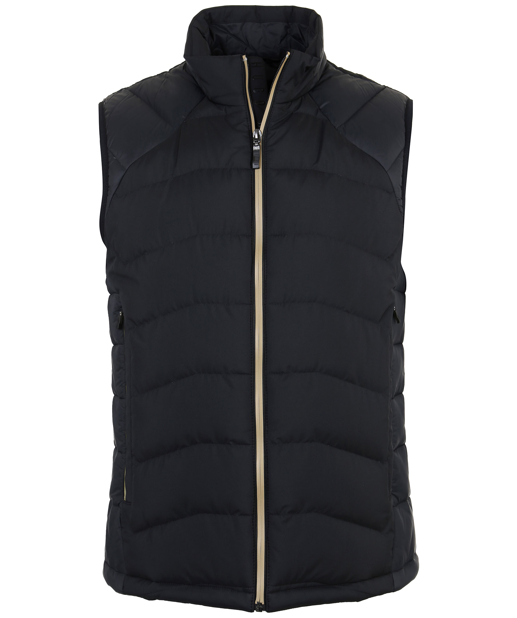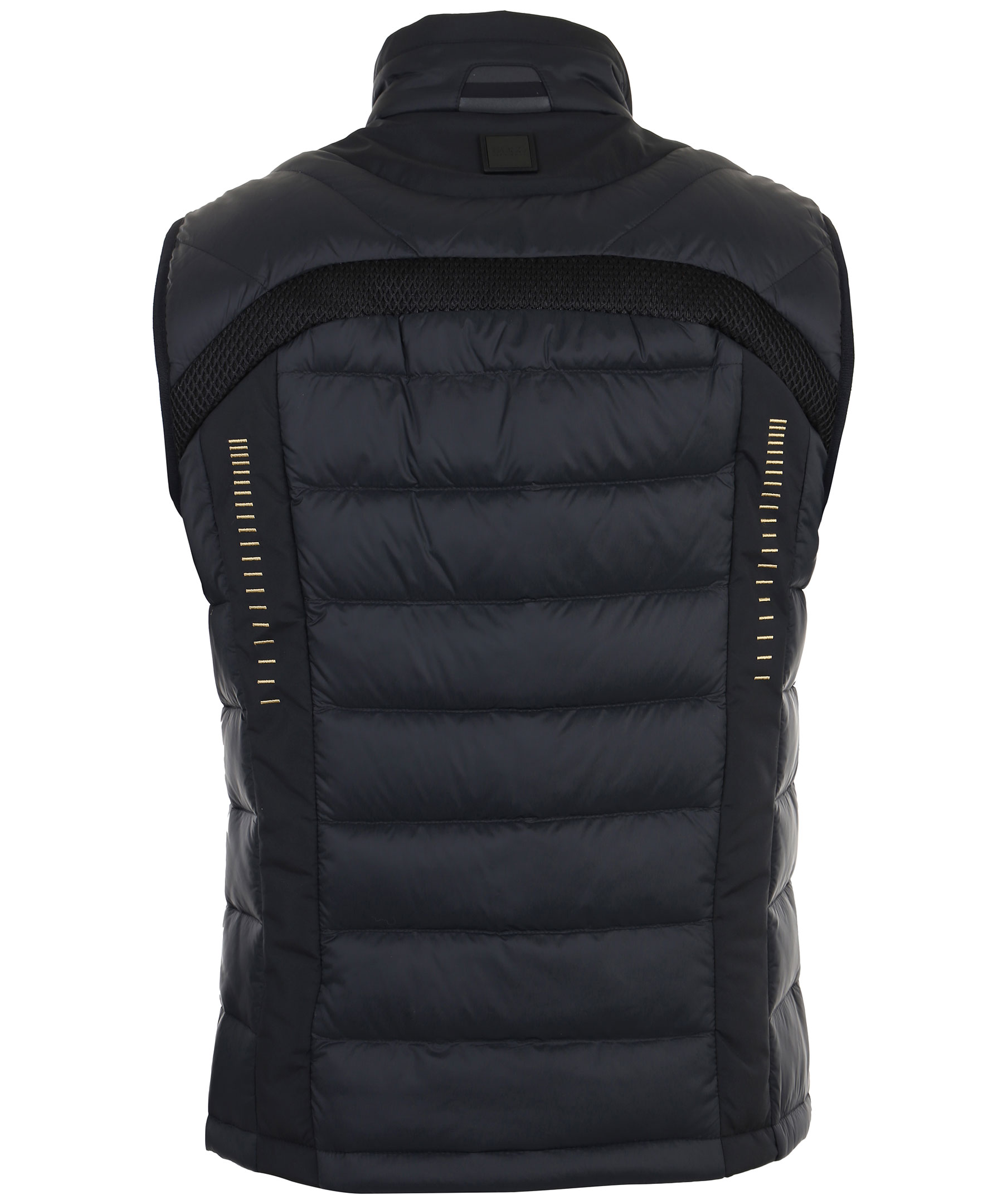 Svart dunväst från Hugo Boss. Tillverkad i vattenavvisande polyamid med dunfyllning. Två framfickor med dragkedja och gulddetaljer längs fickan samt en innerficka. Liten krage och logotyp på vänster ärm. Guldfärgade broderade streck på två lodräta rader på ryggen. Kan användas under rocka/jacka eller som den är.