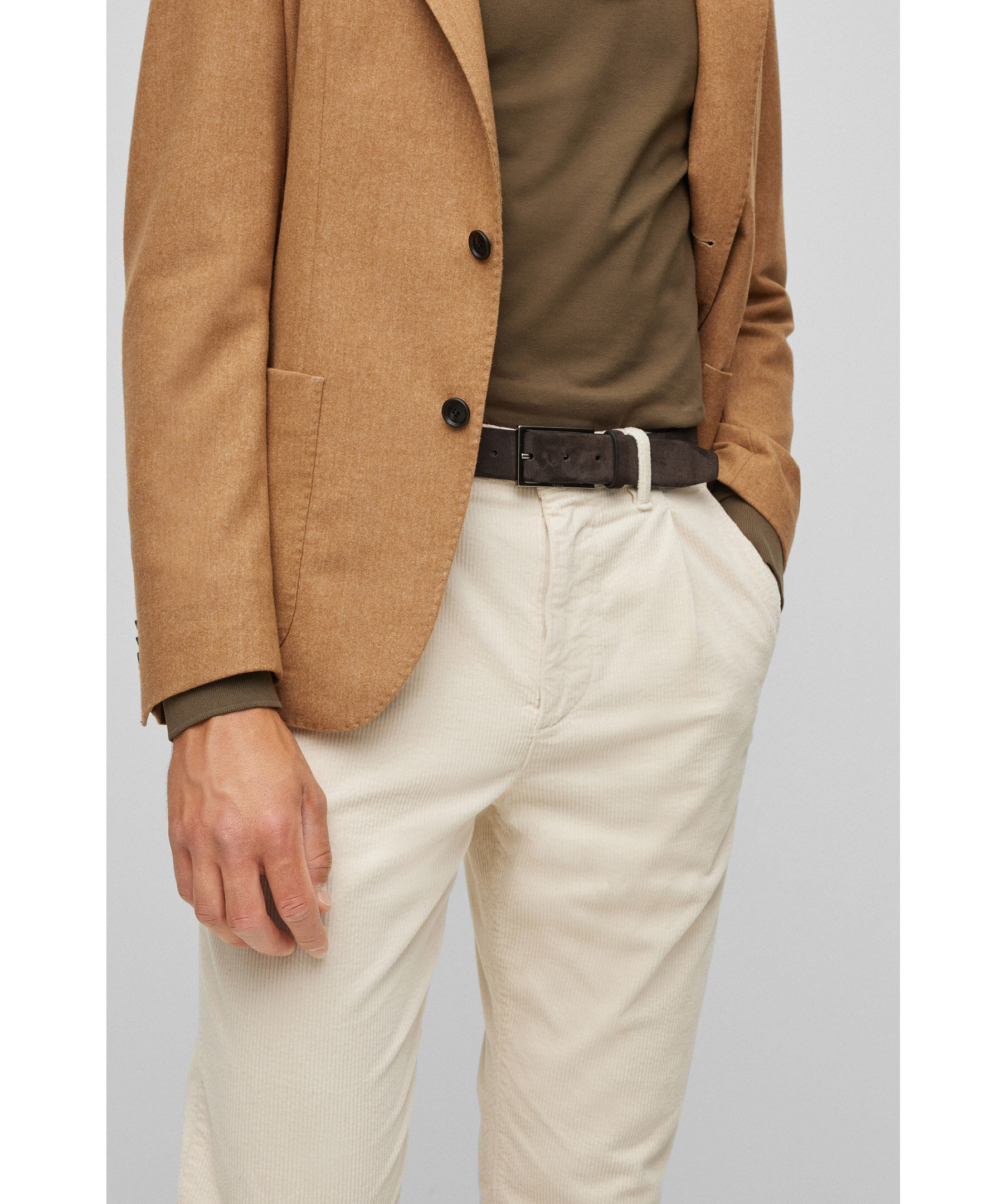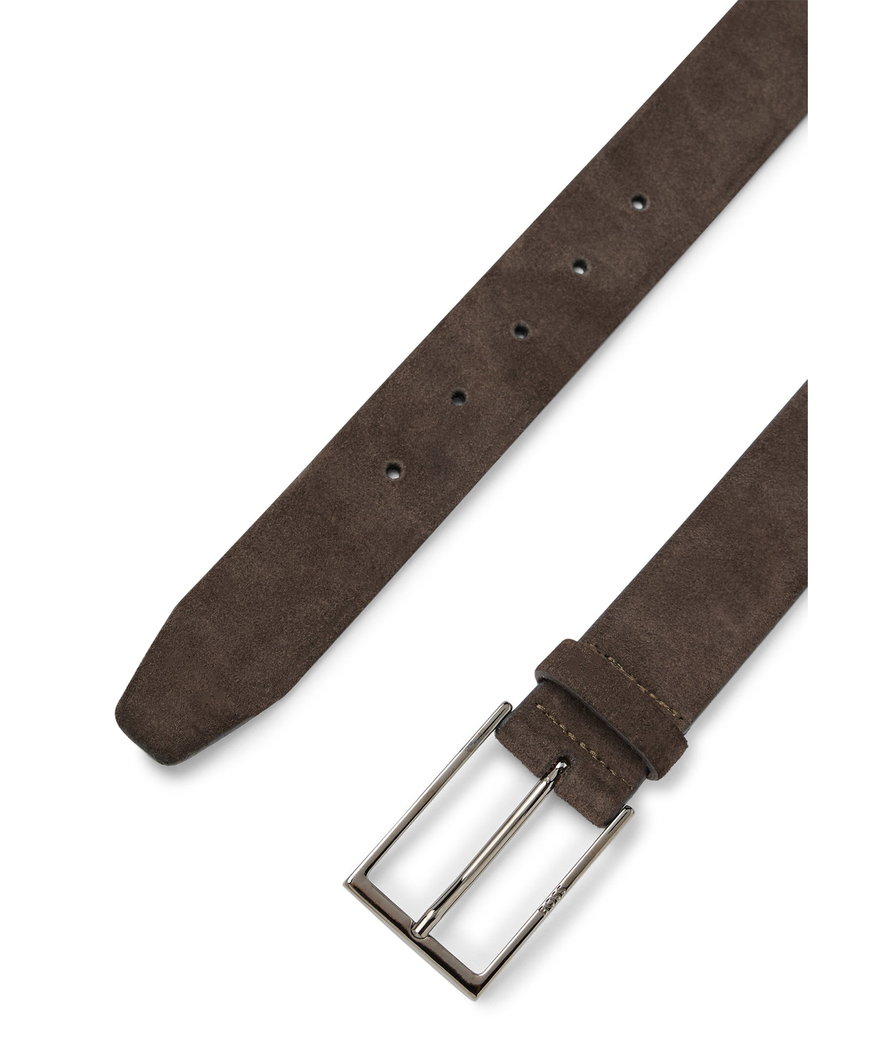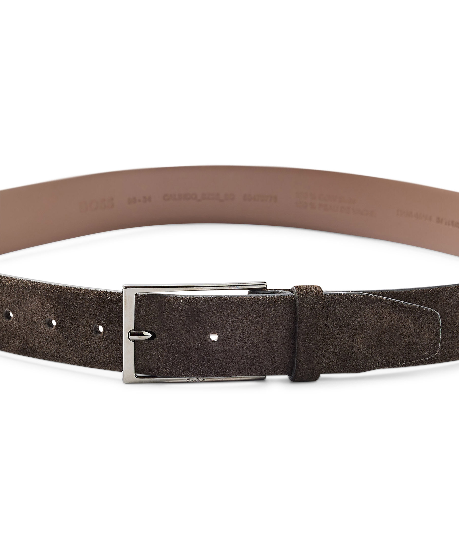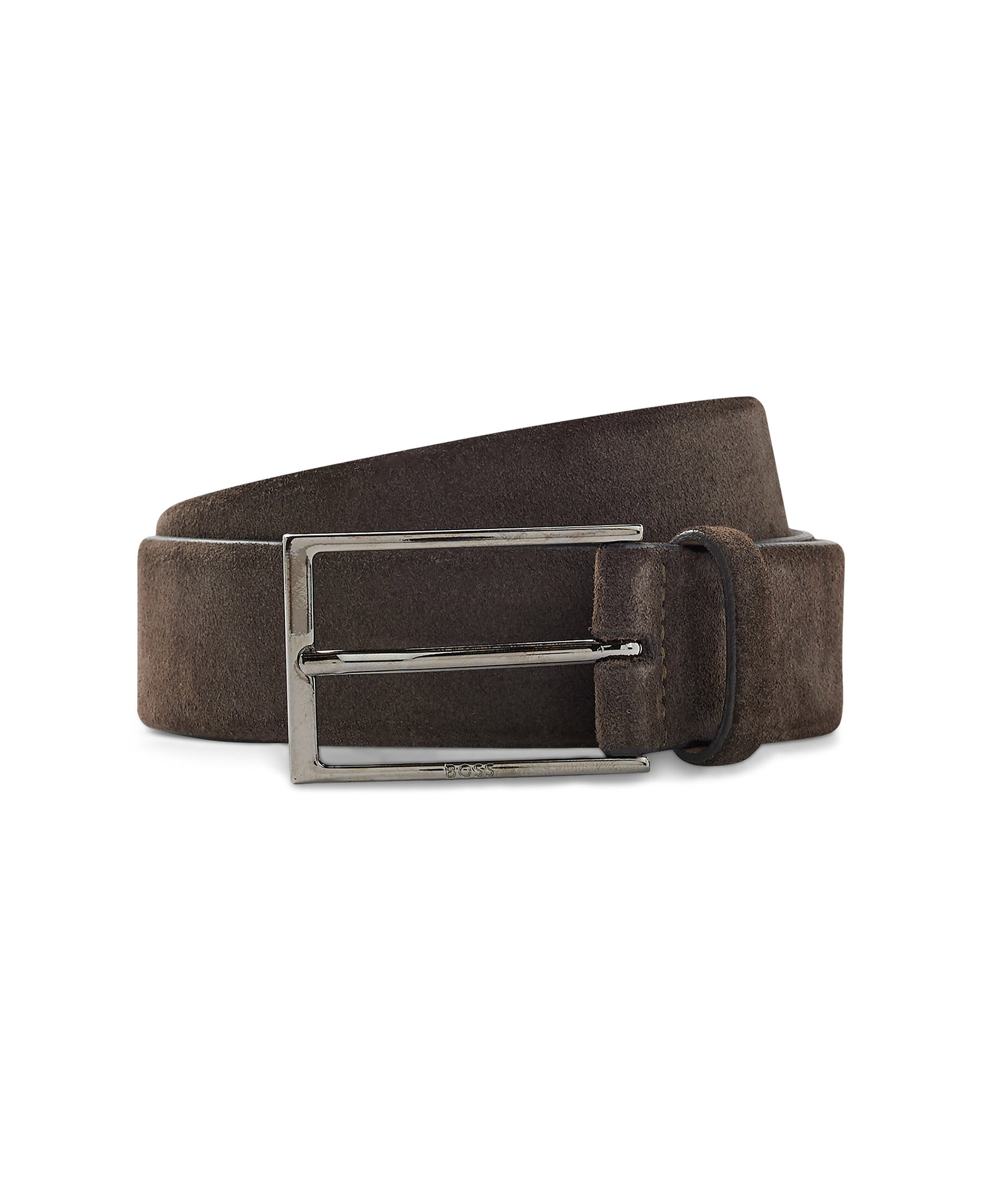 Mörkbrunt bälte från BOSS. Designad i kraftig mocka och spänns med ett polerat spänne i metall som har en BOSS-logo in graverat. För bästa passform rekommenderar vi att du beställer en storlek större än din midjestorlek. Bredd 3,5 cm.