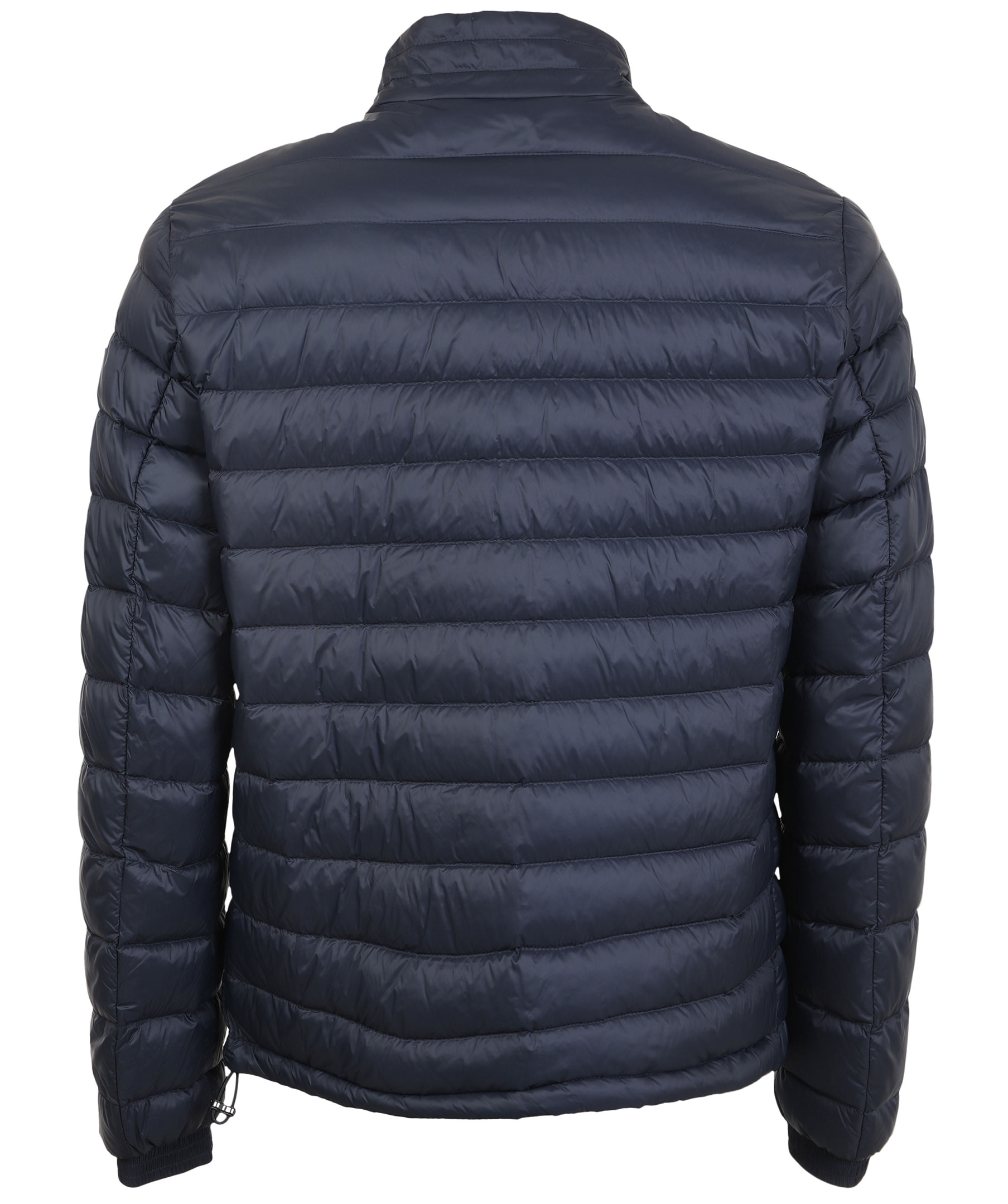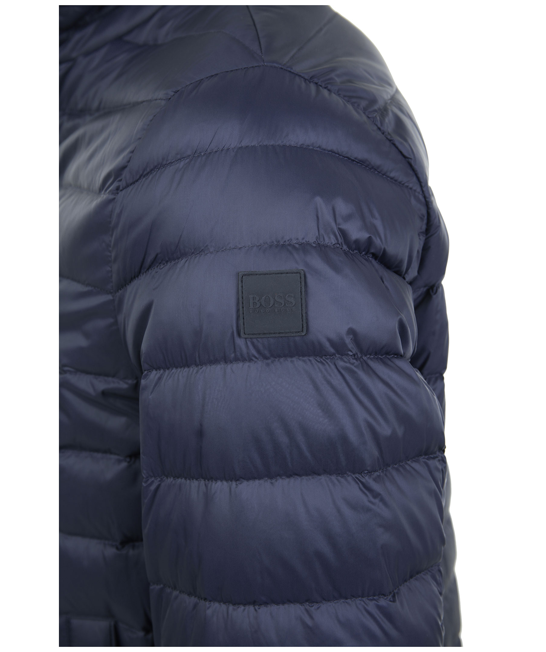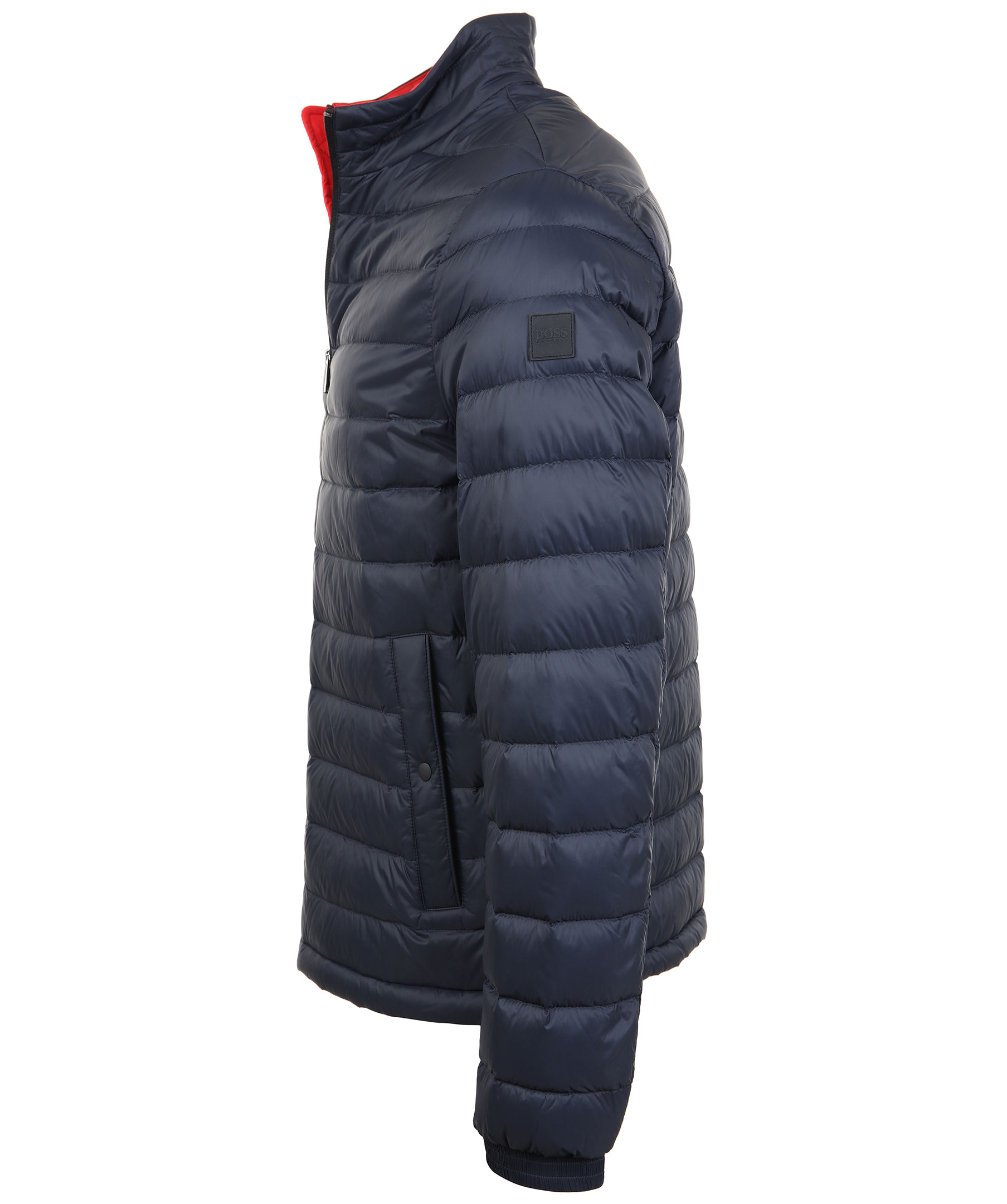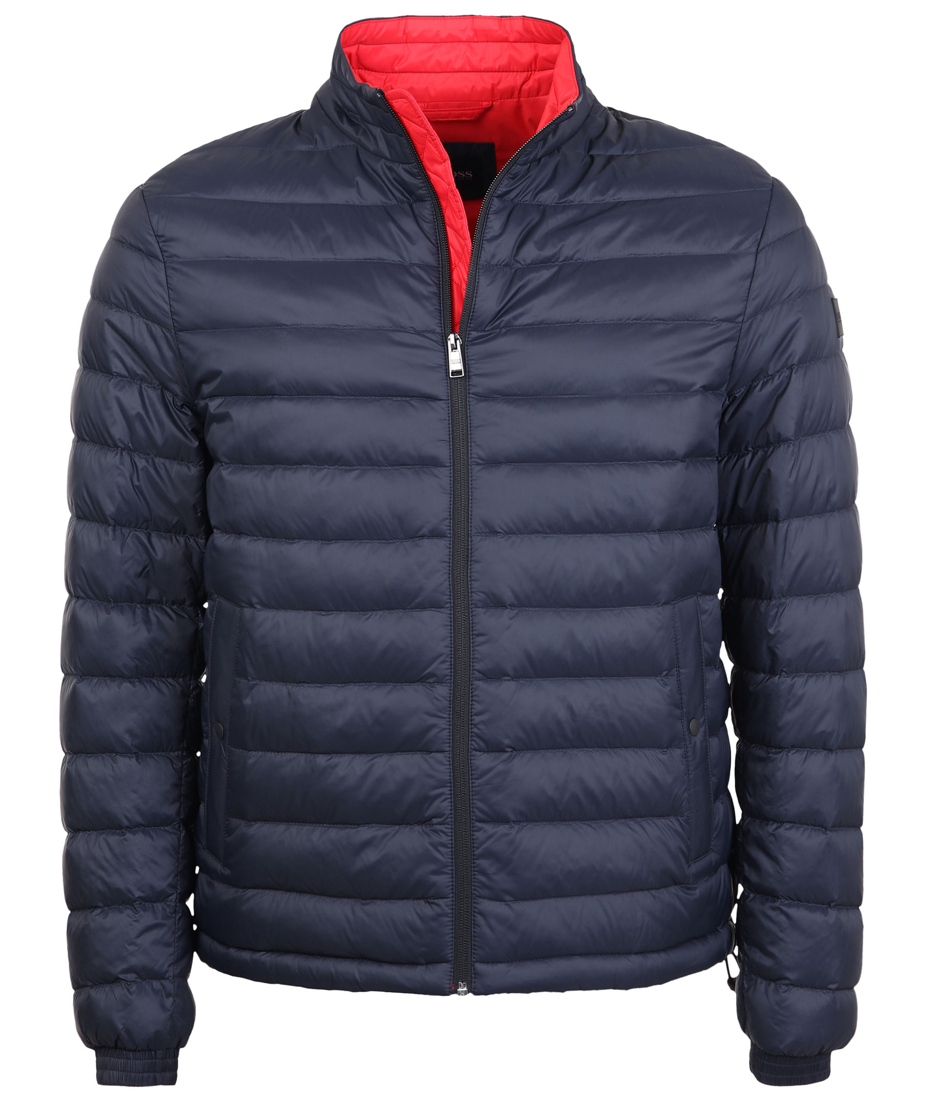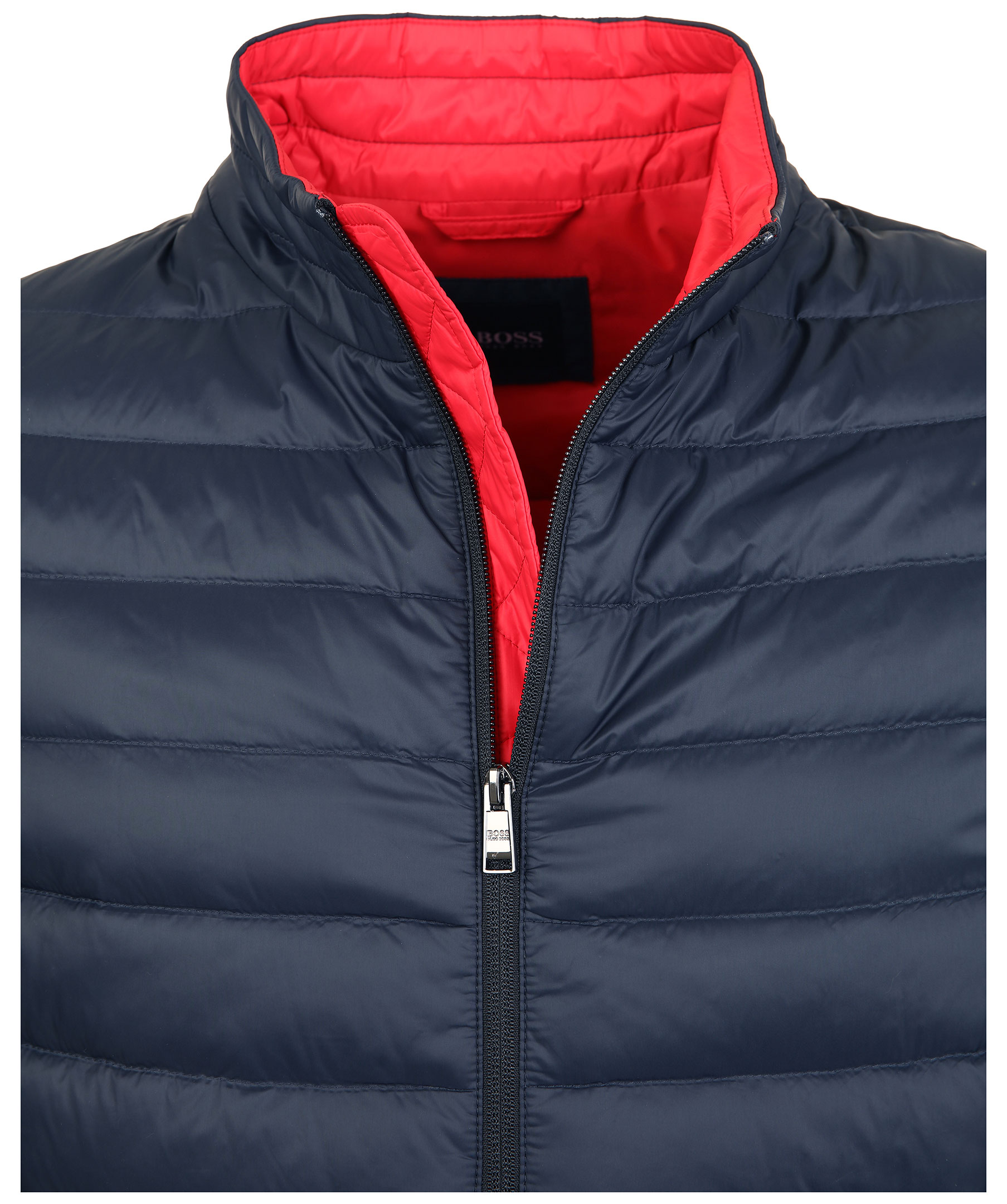 Marinblå, tunt fodrad väst från Hugo Boss med rött foder. Två sidofickor som stänga med tryckknapp, logga på vänster ärm samt en innerficka. Stängs med dragkedja och har en hög krage. Lätt att packa ner i väskan. Tillverkad i vattenavvisande polyamid.