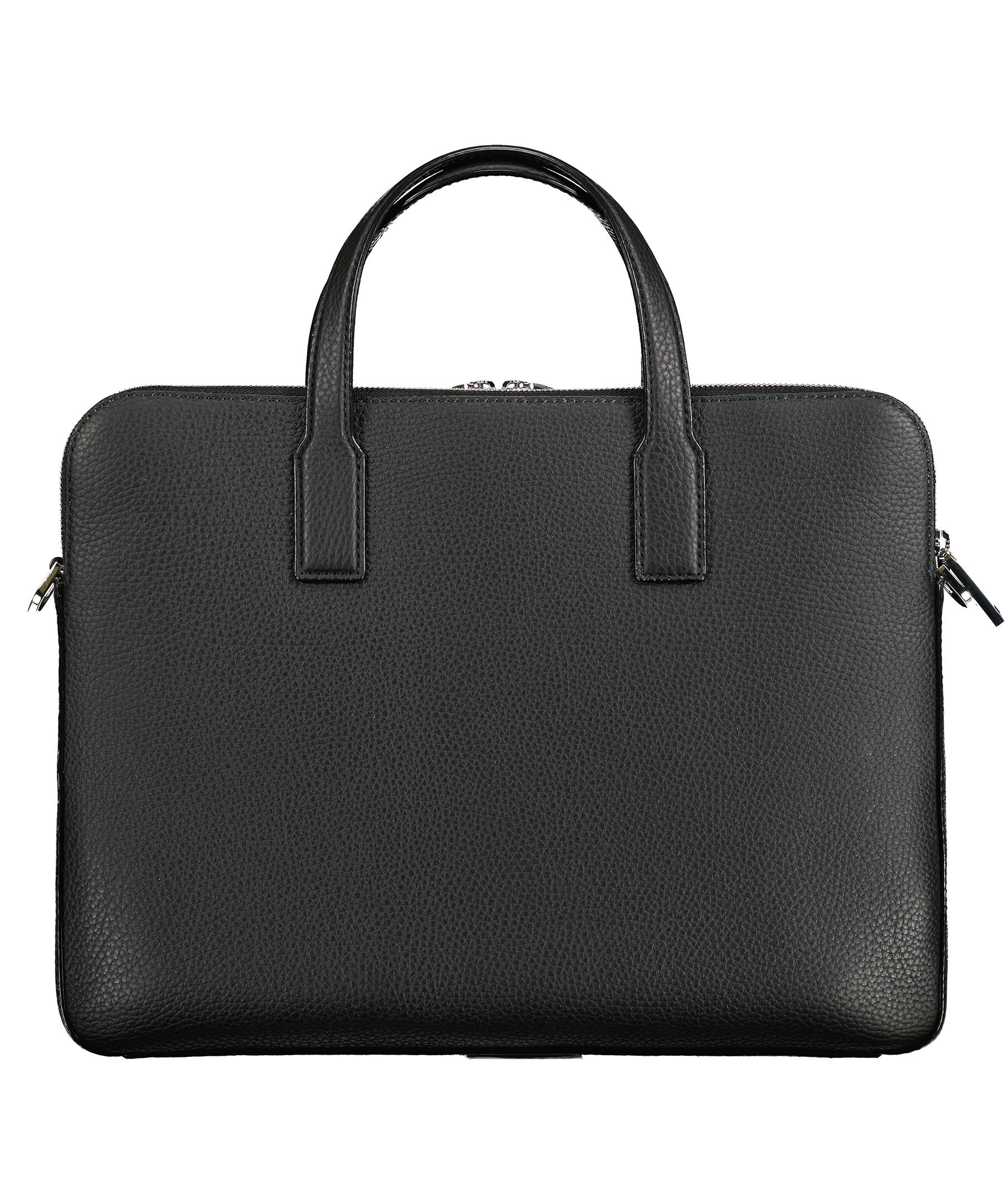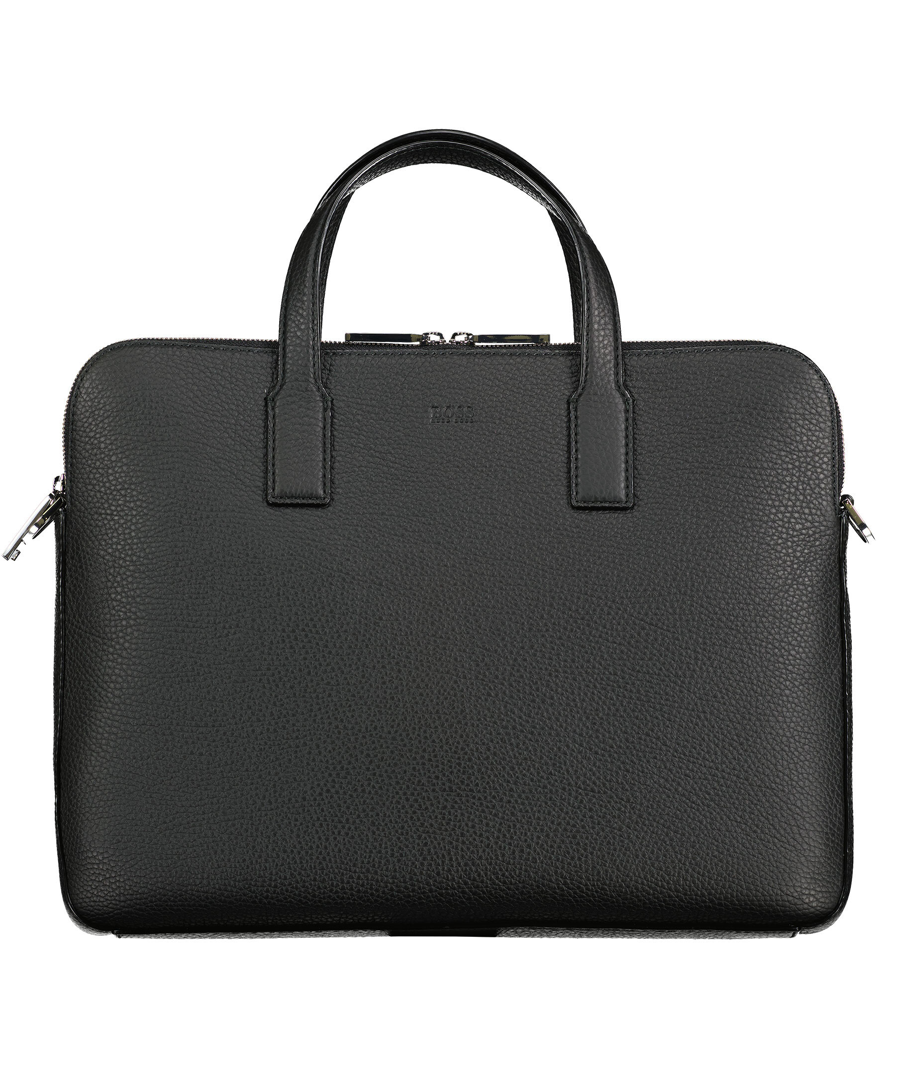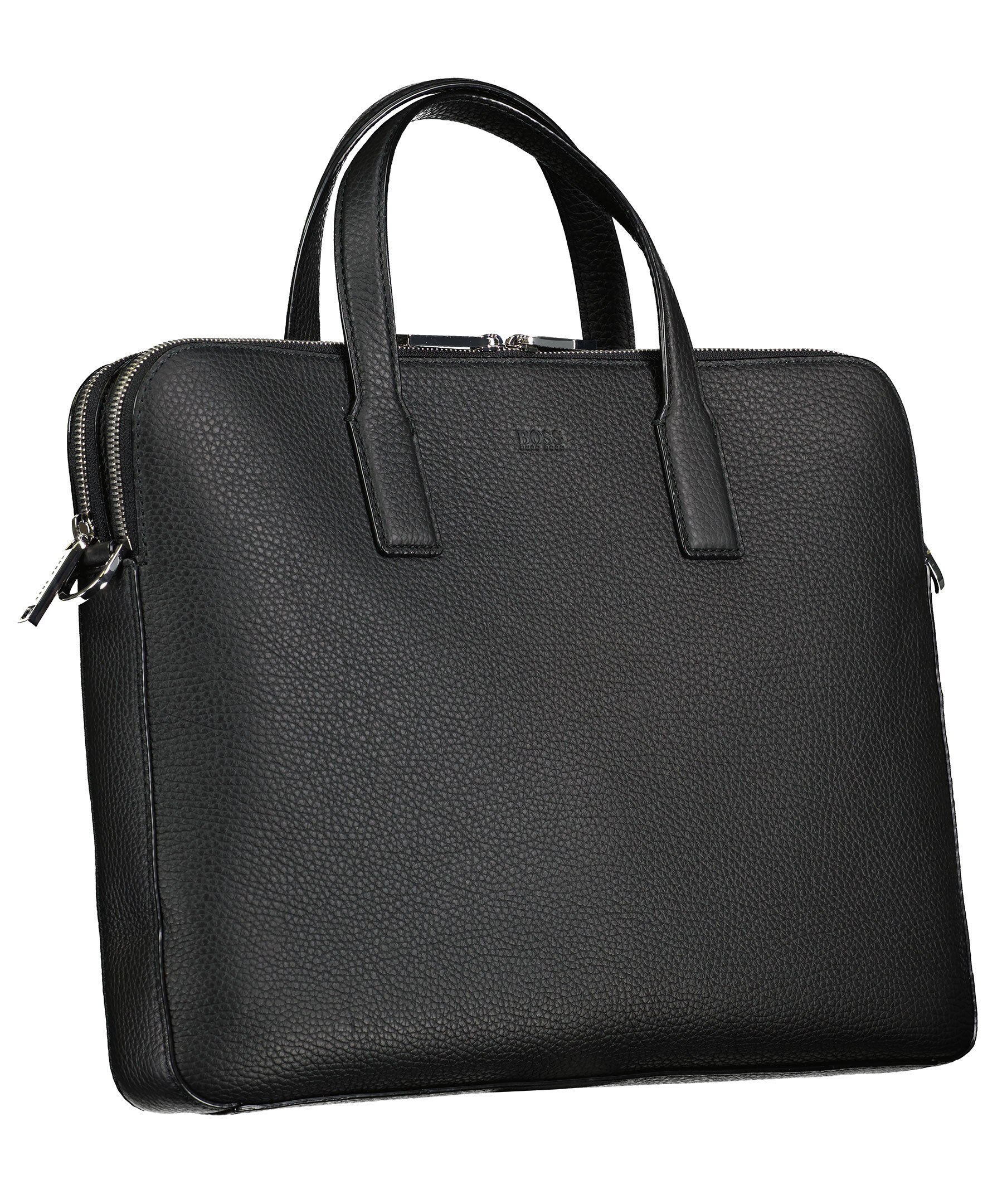 Svart portfölj i mjukt strukturerat läder från Boss Business. Två huvudfack med blixtlås, ena facket har en tvåvägsdragkedja. Facket med tvåvägsdragkedja har tre fickor i olika storlekar och ett större fack med dragkedja. Avtagbar och justerbar axelrem och två handtag samt logotyp på framsidan. Har måtten: 30 x 39 x 6 cm och passar en 15-tums bärbar dator.