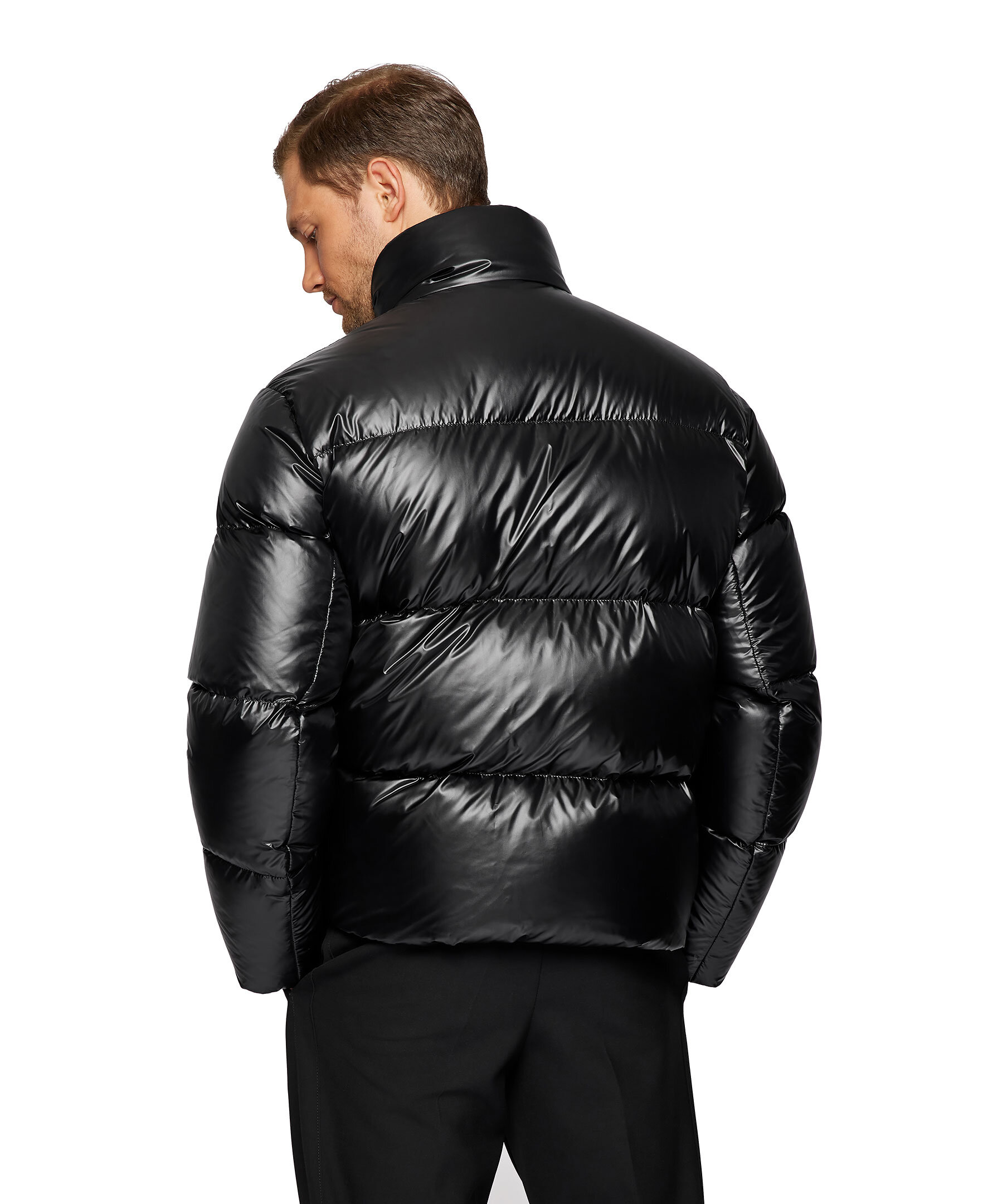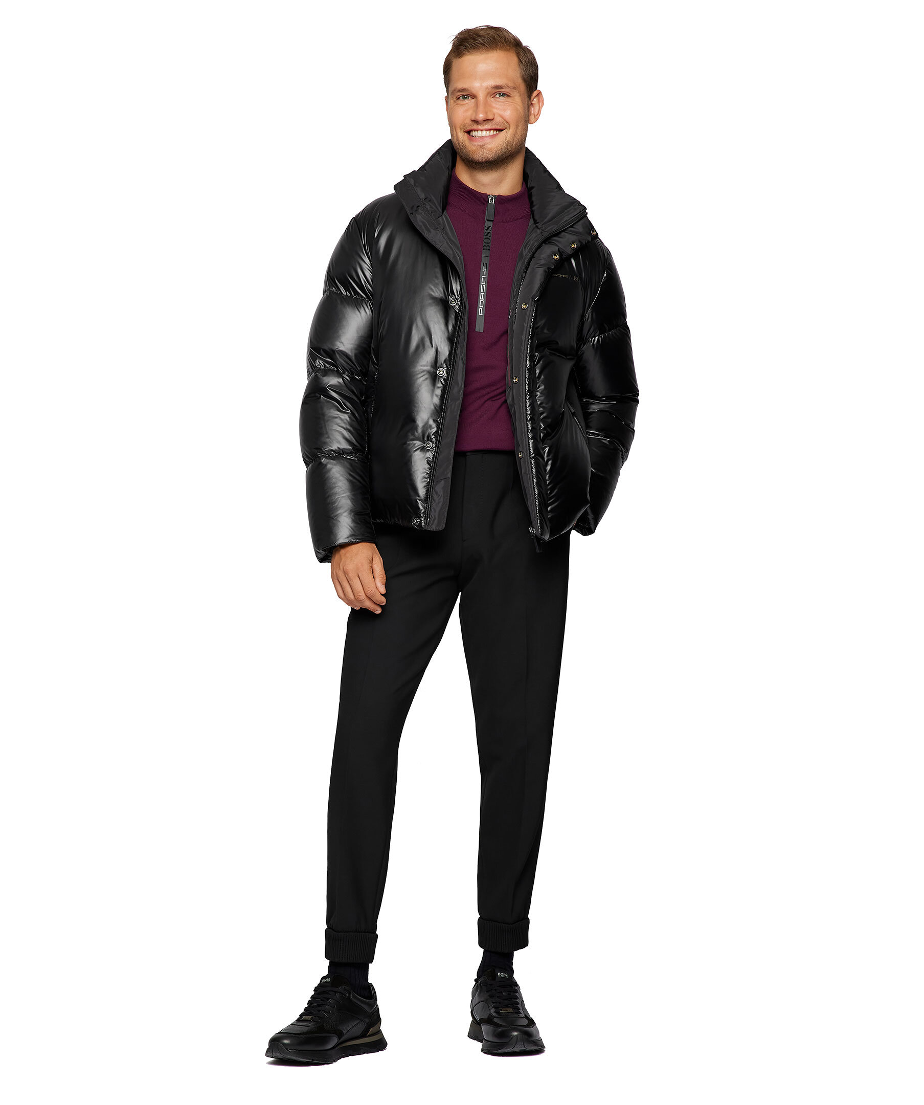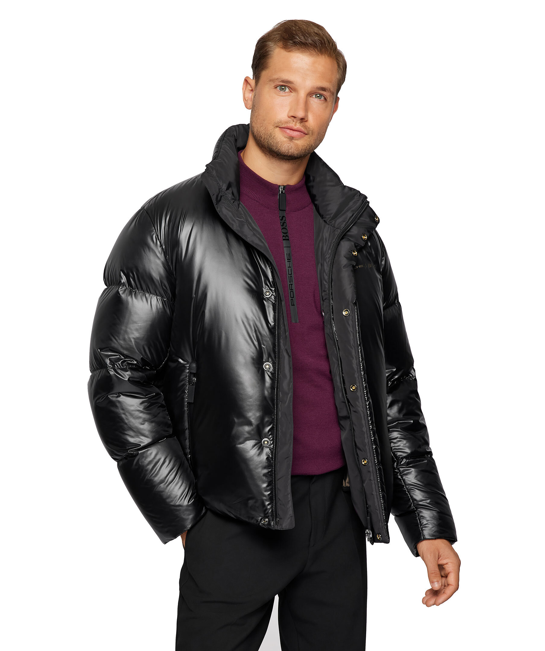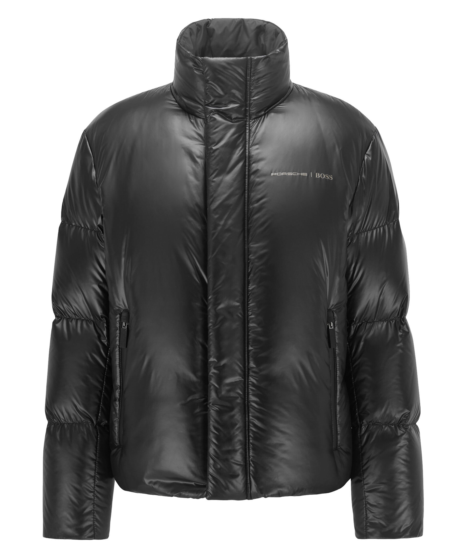 Svart pufferjacka med dun från Boss Business. Jackan är gjord i en avslappnad passform och har en semi glansig finish. Hög ståkrage, stängs med tejpad dragkedja och tryckknappar. Två fodrade framfickor, en innerficka och en glansig logotyp tryck på ena bröstet. Jackan är en del av Porsche x BOSS kollektionen.