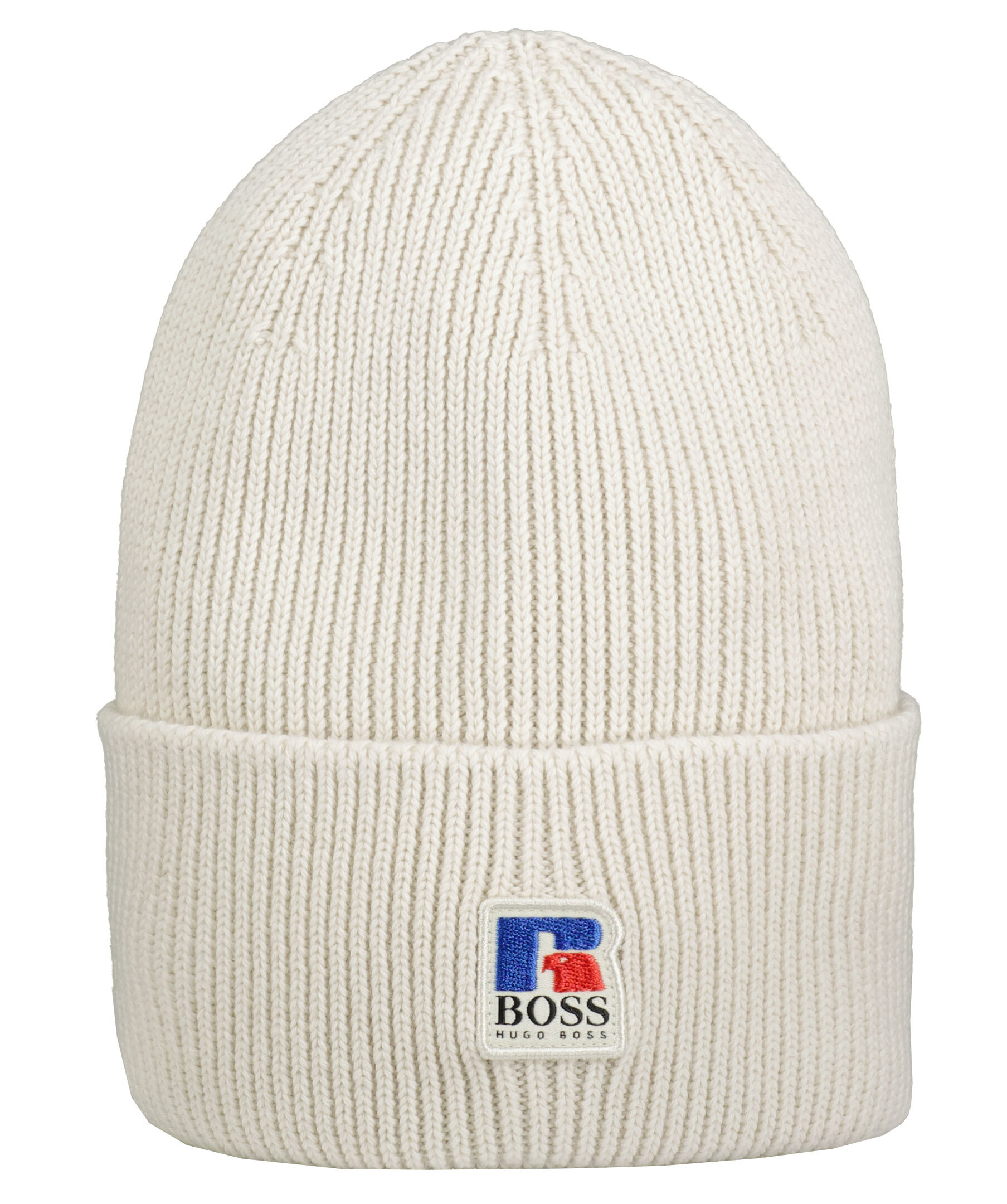 Ljusbeige stickad mössa från BOSS x Russell Athletic. Liten broderad logga fram, uppvikt kant och ribbstickad. Tillverkad i bomull. *Broderad logga *Uppvikt kant *Ribbad
