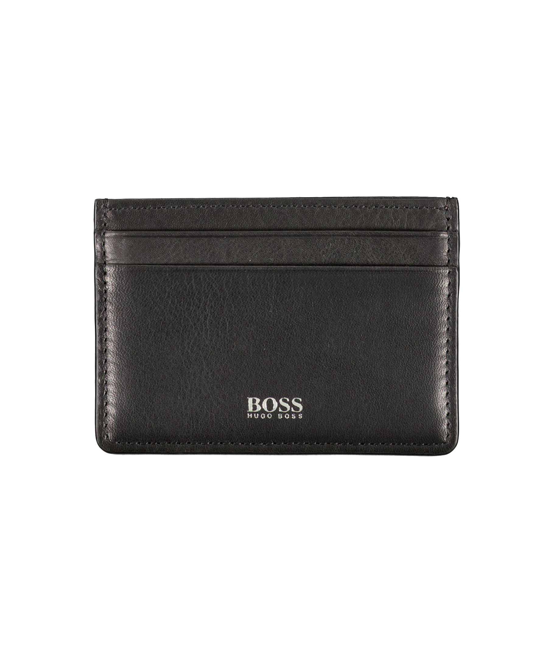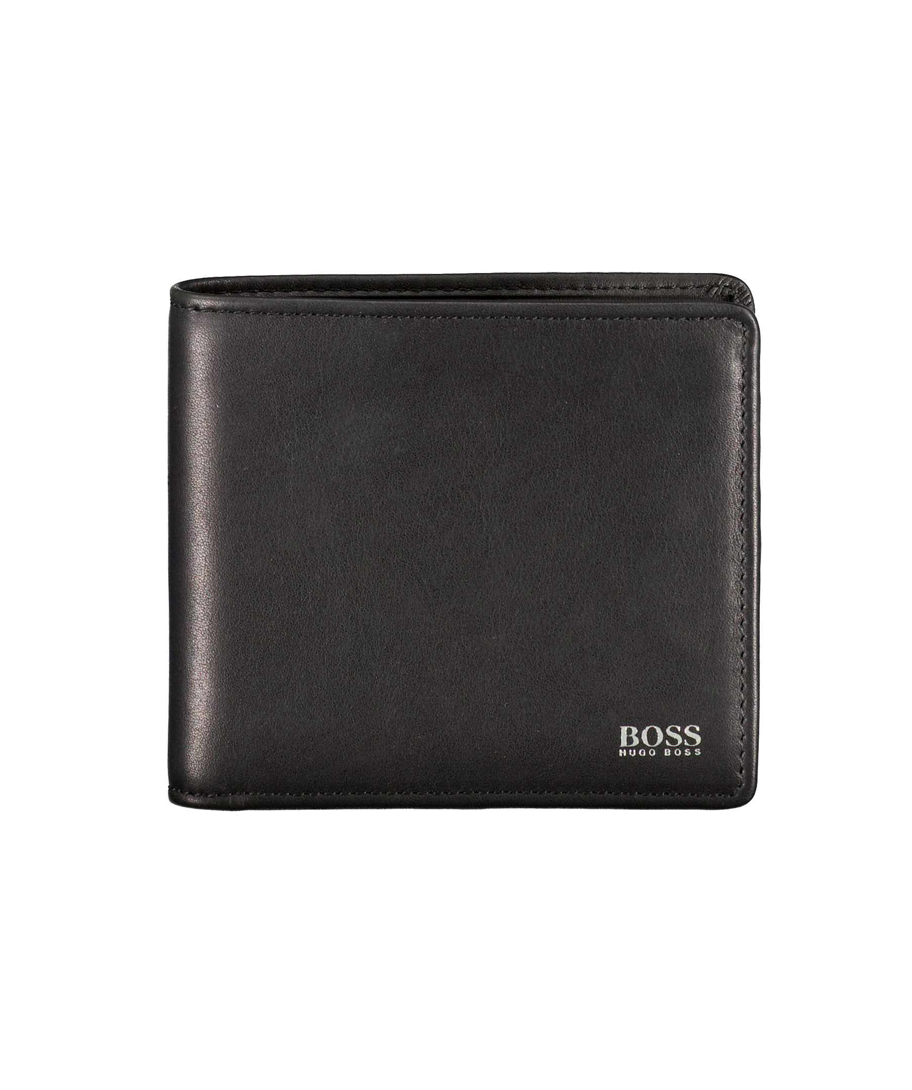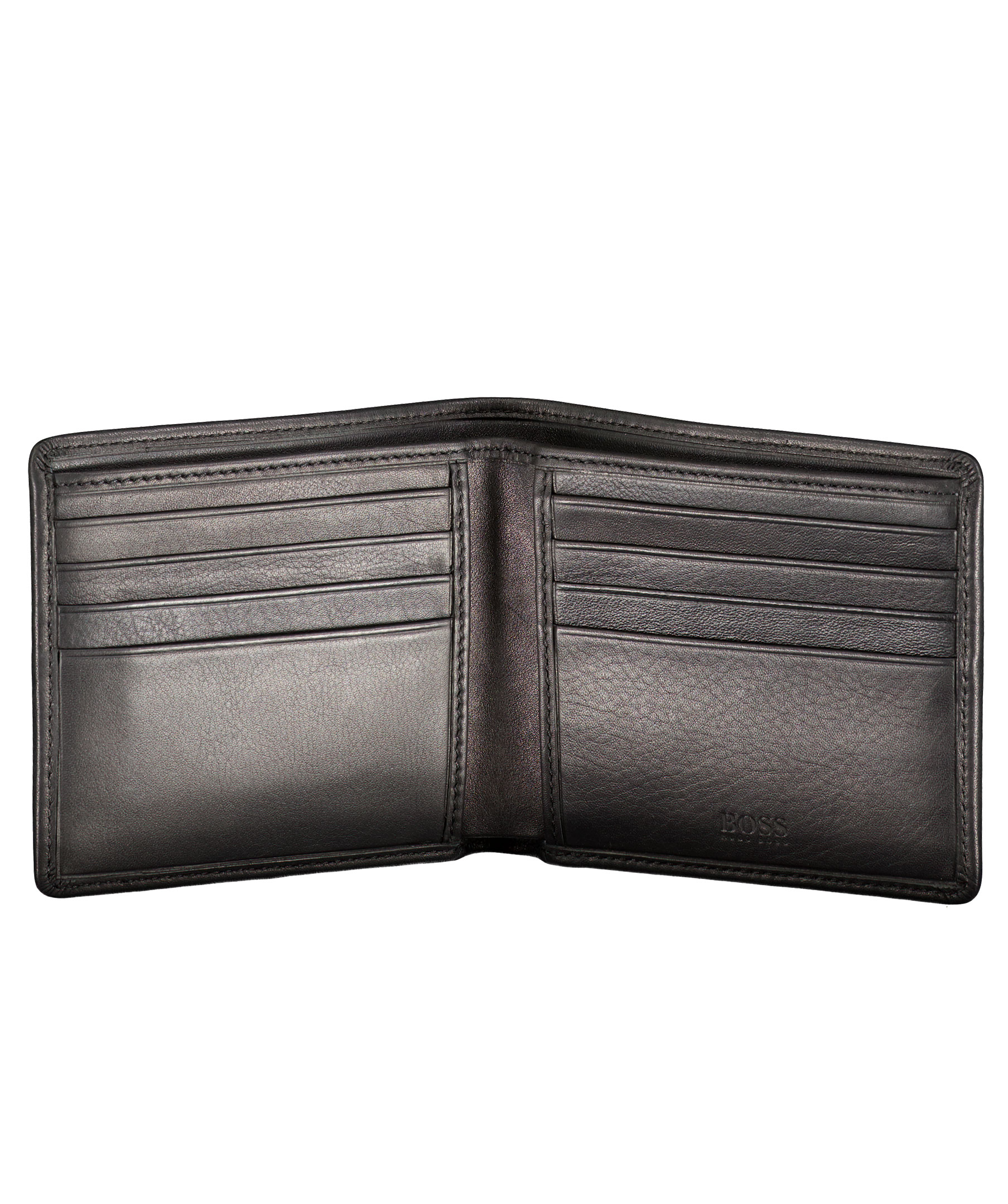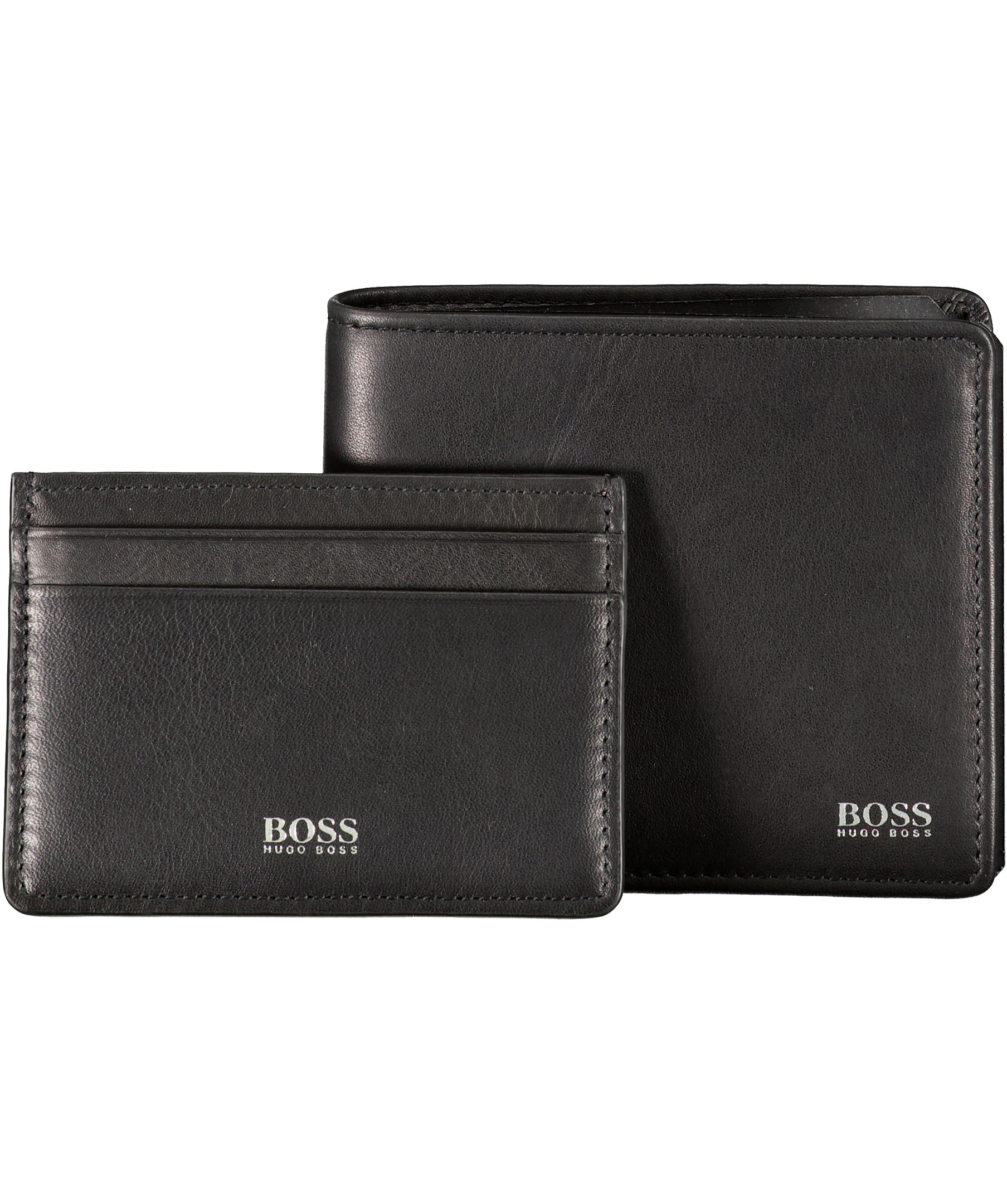 Fin giftbox med två stycken plånböcker från Hugo Boss. En svart plånbok i läder med plats för åtta kontokort på insidan samt har två till fack och fack för sedlar. En svart korthållare i läder med plats för två kontokort på varje sida samt mittenfack. Båda plånböckerna har en liten silverfärgad logotyp på framsidan.