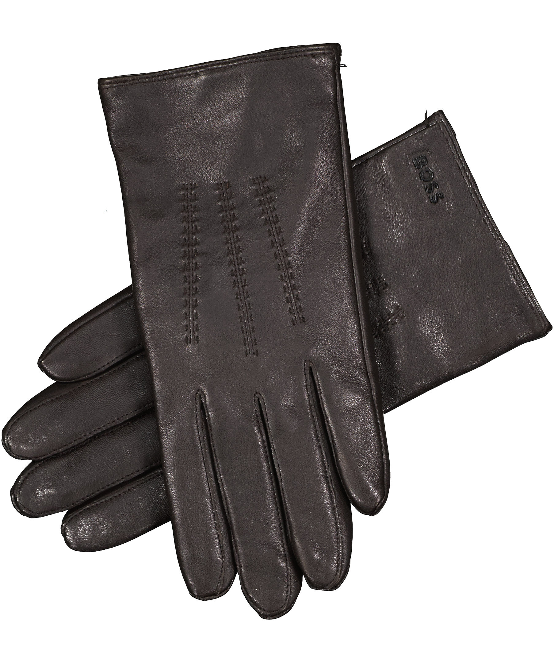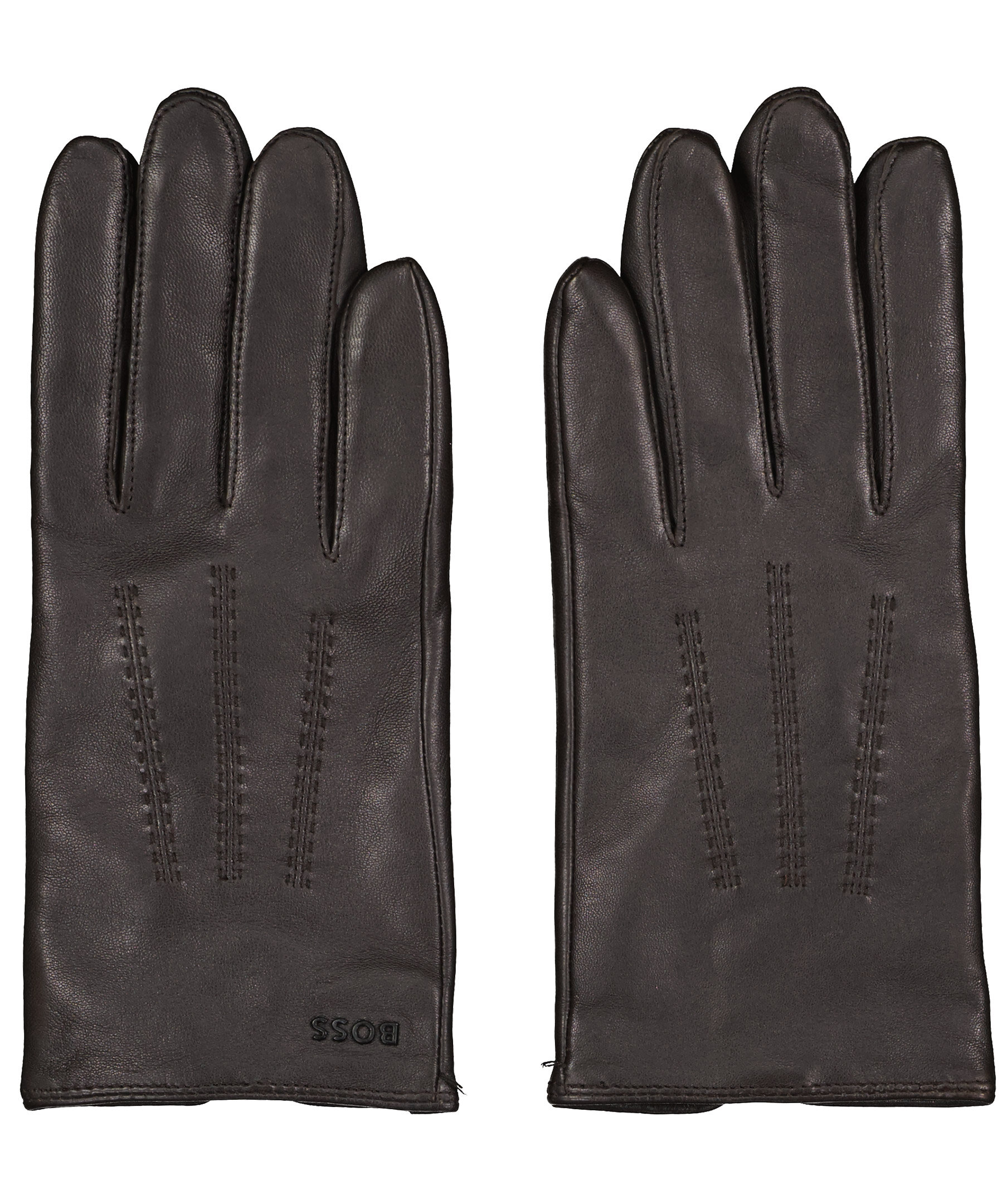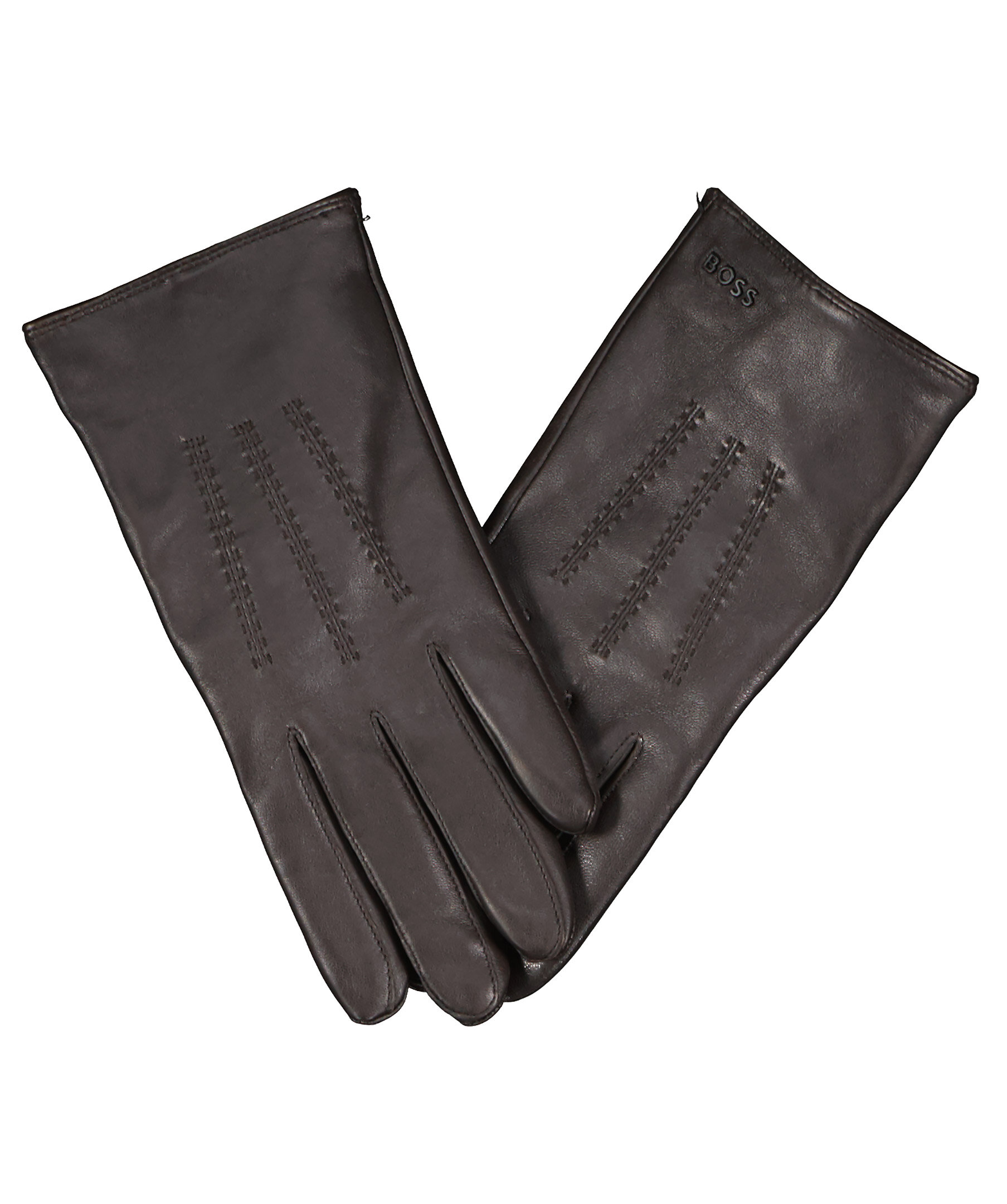 Mörkbruna skinnhandskar från BOSS Black. Brun logotyp i metall på ovansidan och liten slits vid handleden som gör det lättare att få på handsken. Tre stycken fina sömmar ovanpå handsken som fin detalj. Tillverkade i äkta läder med foder i ullmix.