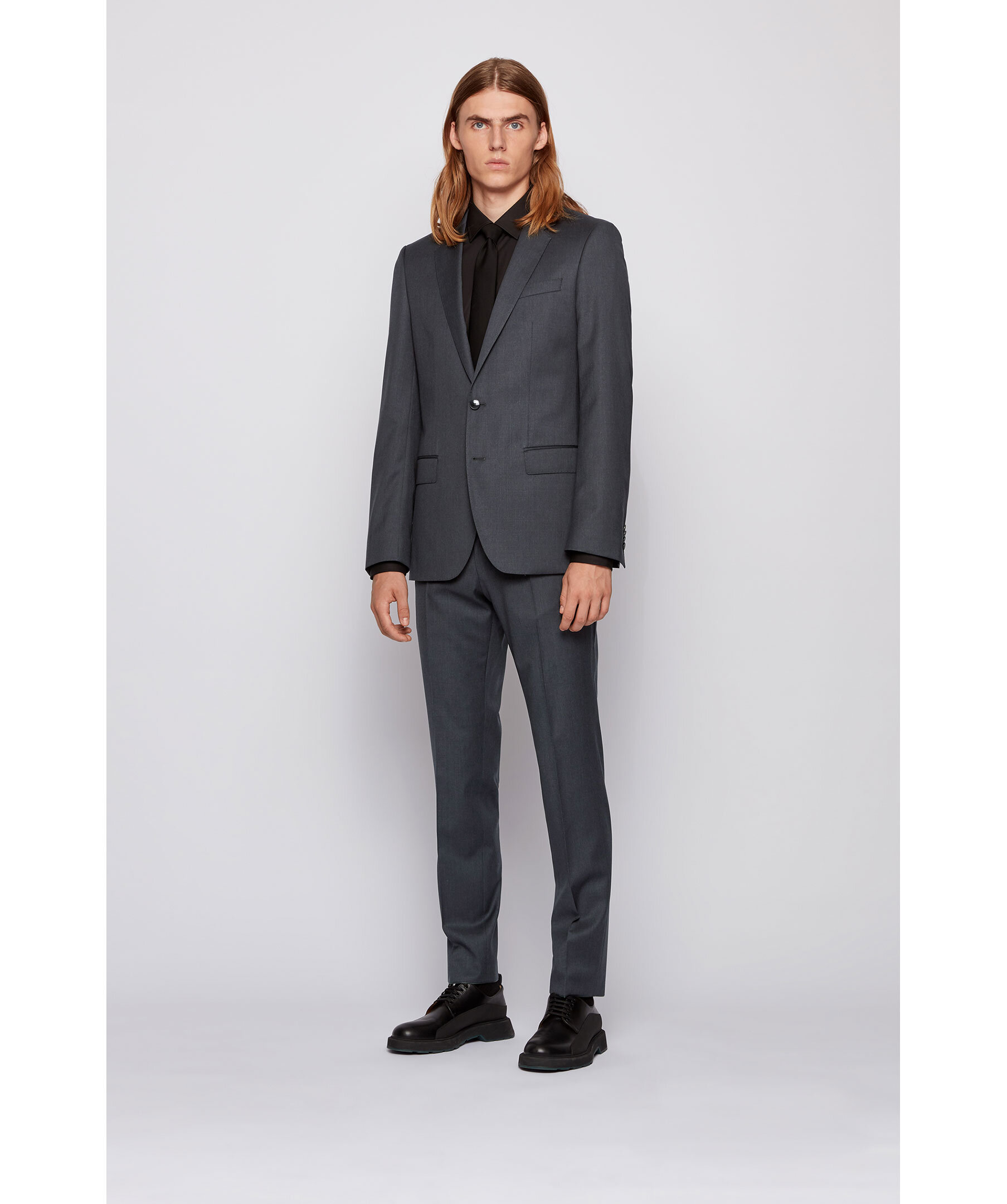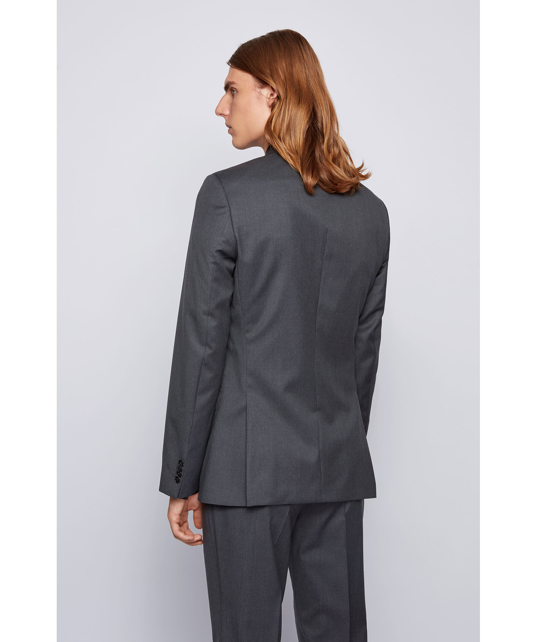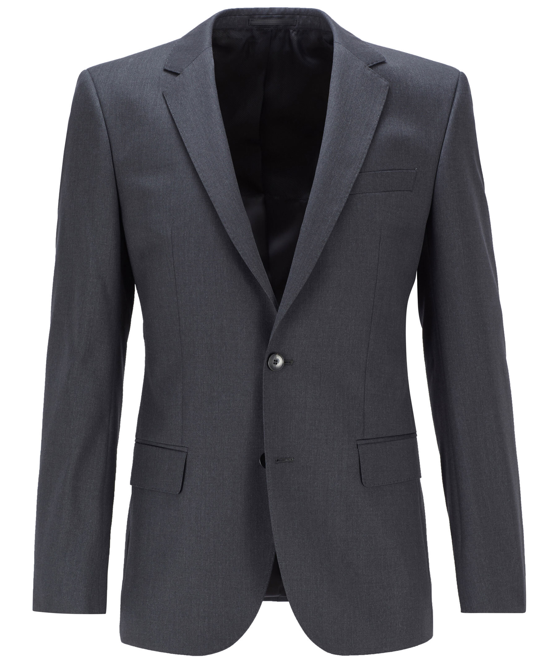 Grå kavaj från Hugo Boss. Tillverkad i 100% ull. Bröstficka, invändiga fickor, smal passform.