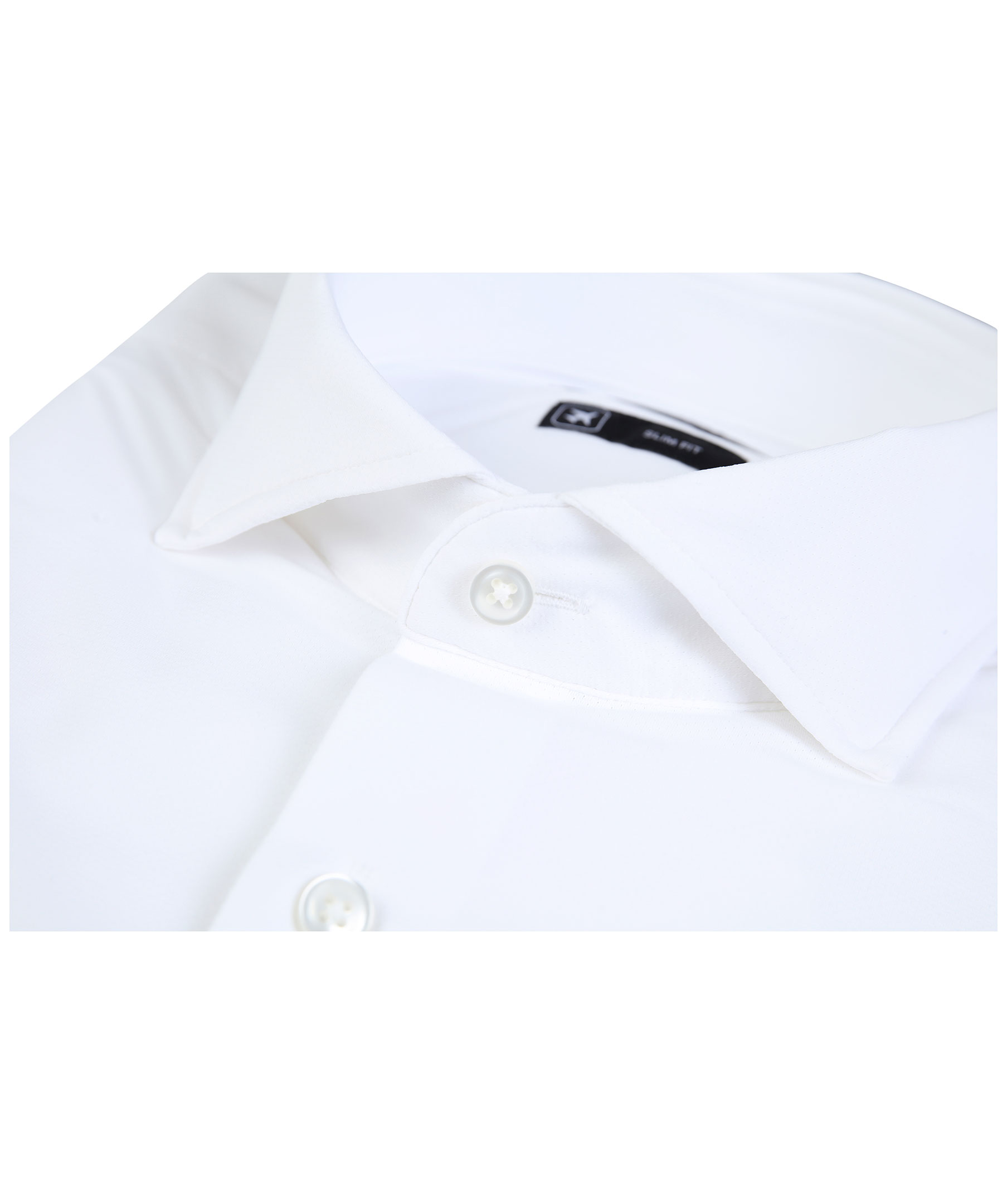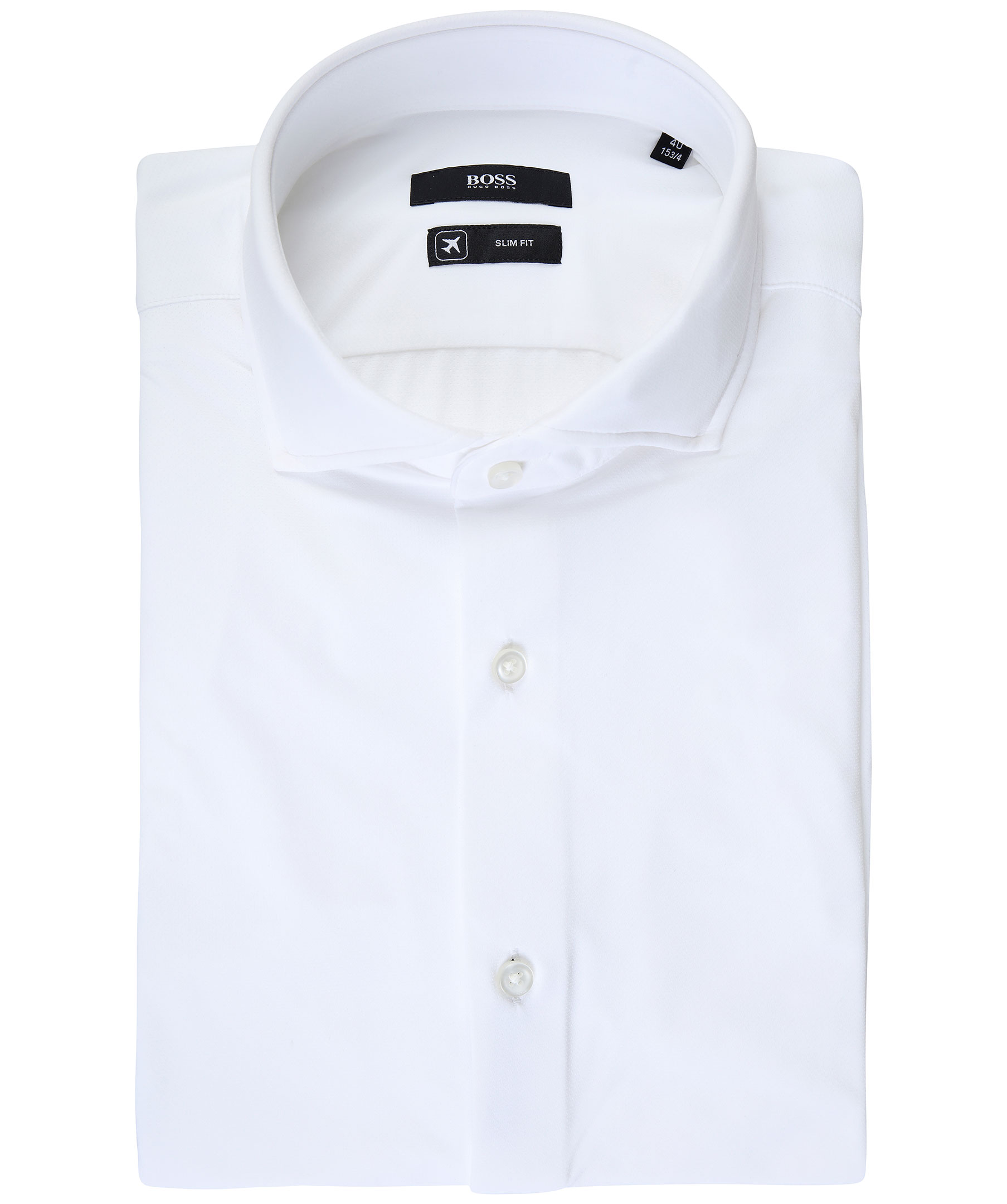 Vit skjorta i slim fit modell från Hugo Boss. Tillverkad i italiensk tyg med stretch, andningsförmåga och fukthantering. Tillverkad med mer än 80% återvunnet garn och har en fin struktur. Vid krage och vita knappar.