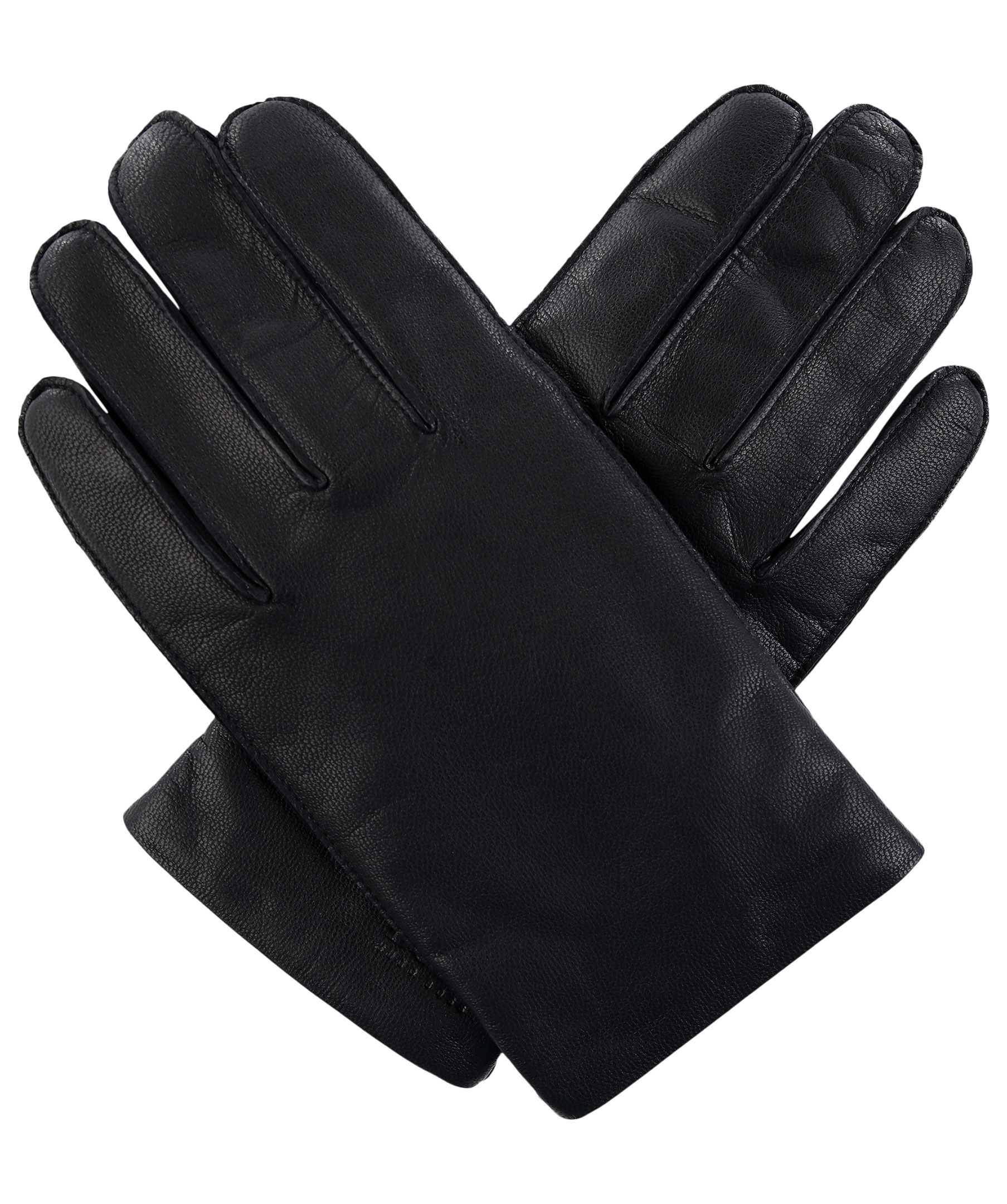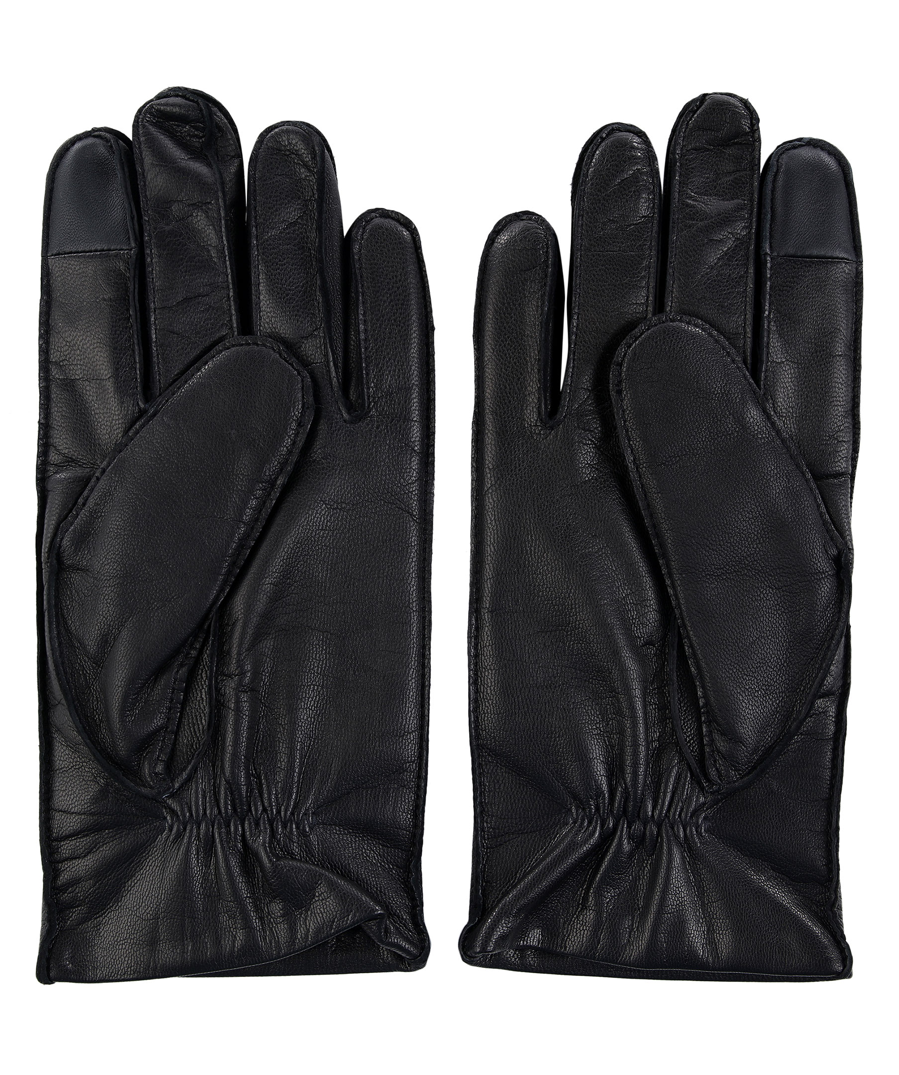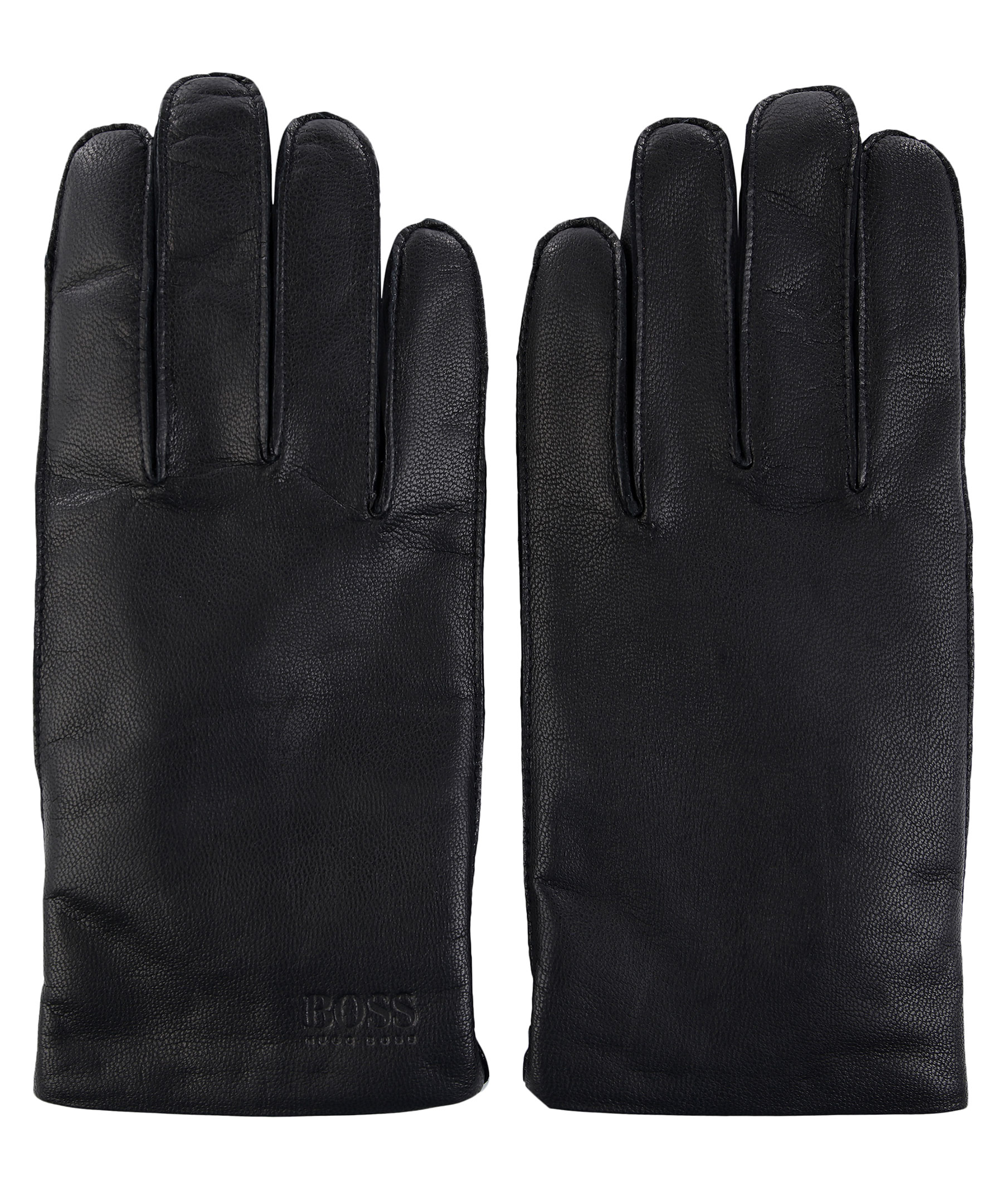 Svarta skinnhandskar från Hugo Boss. Präglad logotyp på ovansidan, liten resår vid handleden. Tillverkade i äkta läder med foder i ullmix.