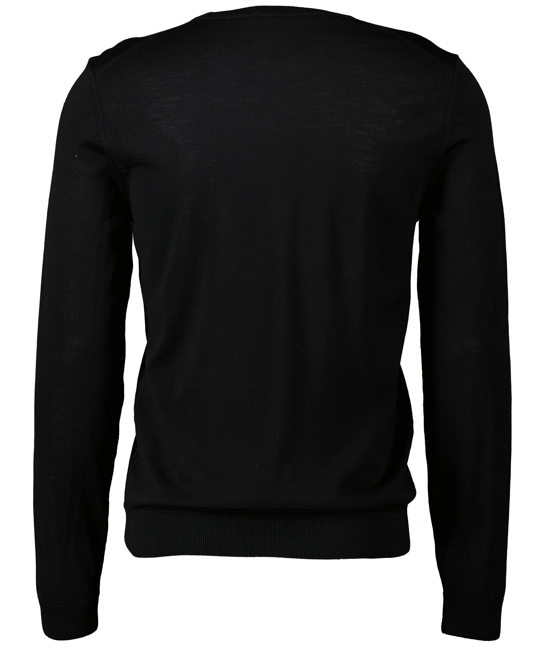 Svart finstickad pullover i slim fit modell från Hugo Boss. Ribbstickade muddar vid halsring, ärm och plaggslut och har en rundad halsringning. Tillverkad i fint italienskt ull.