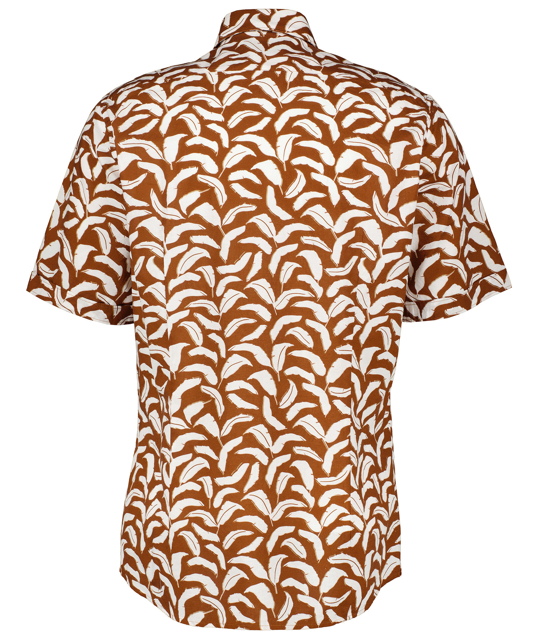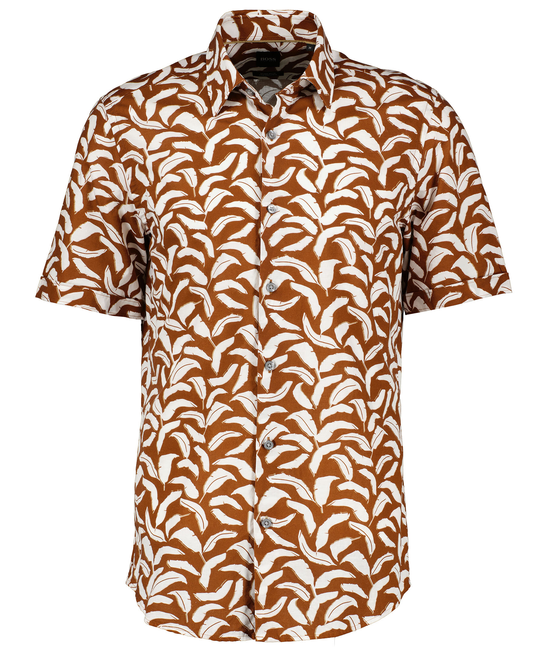 Mönstrad kortärmad skjorta i regular fit från Hugo Boss. Mönster med brun bas och vita fjädrar Tillverkad i bomull och linneblandning. Spetsig krage och gråa knappar fram.