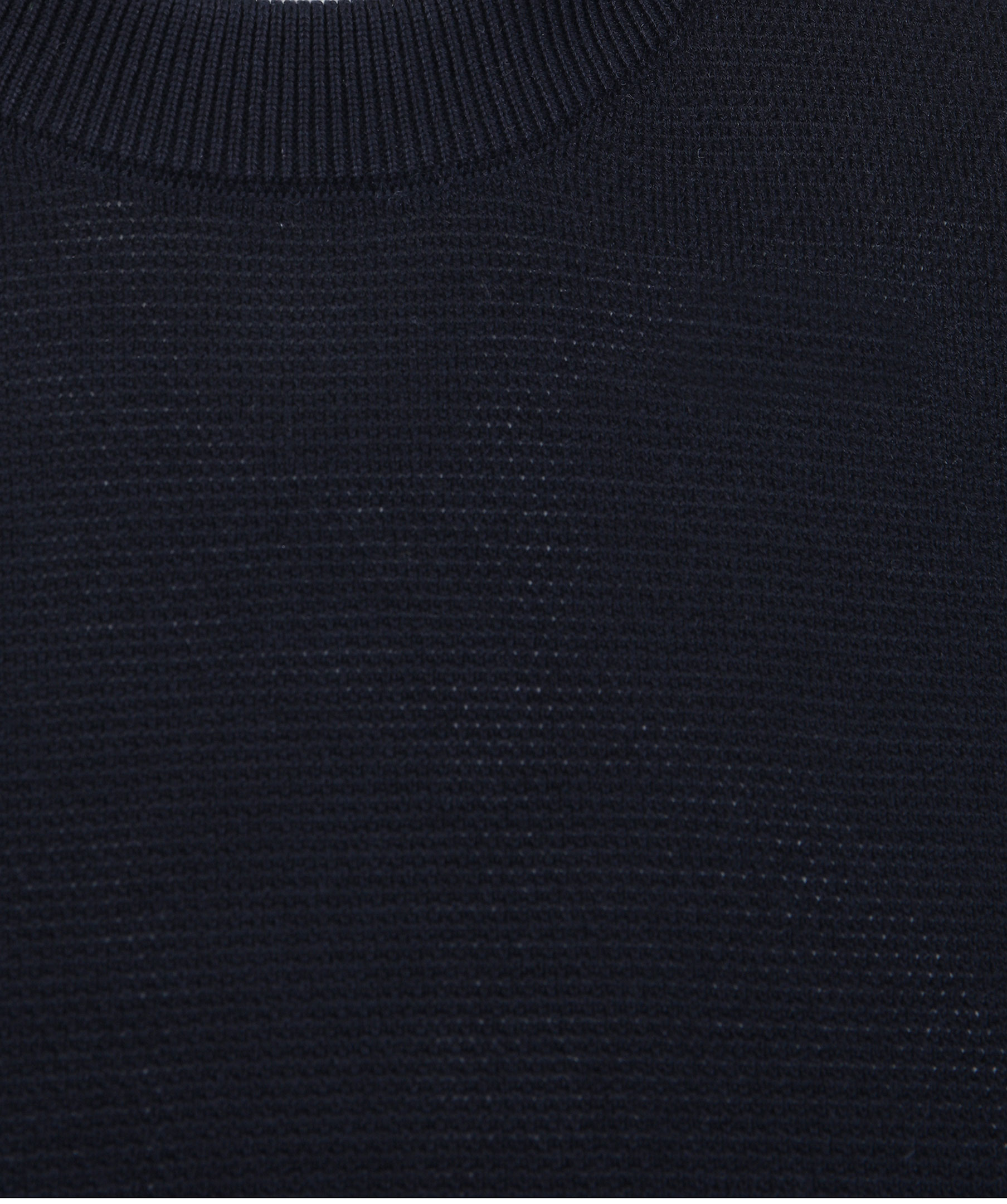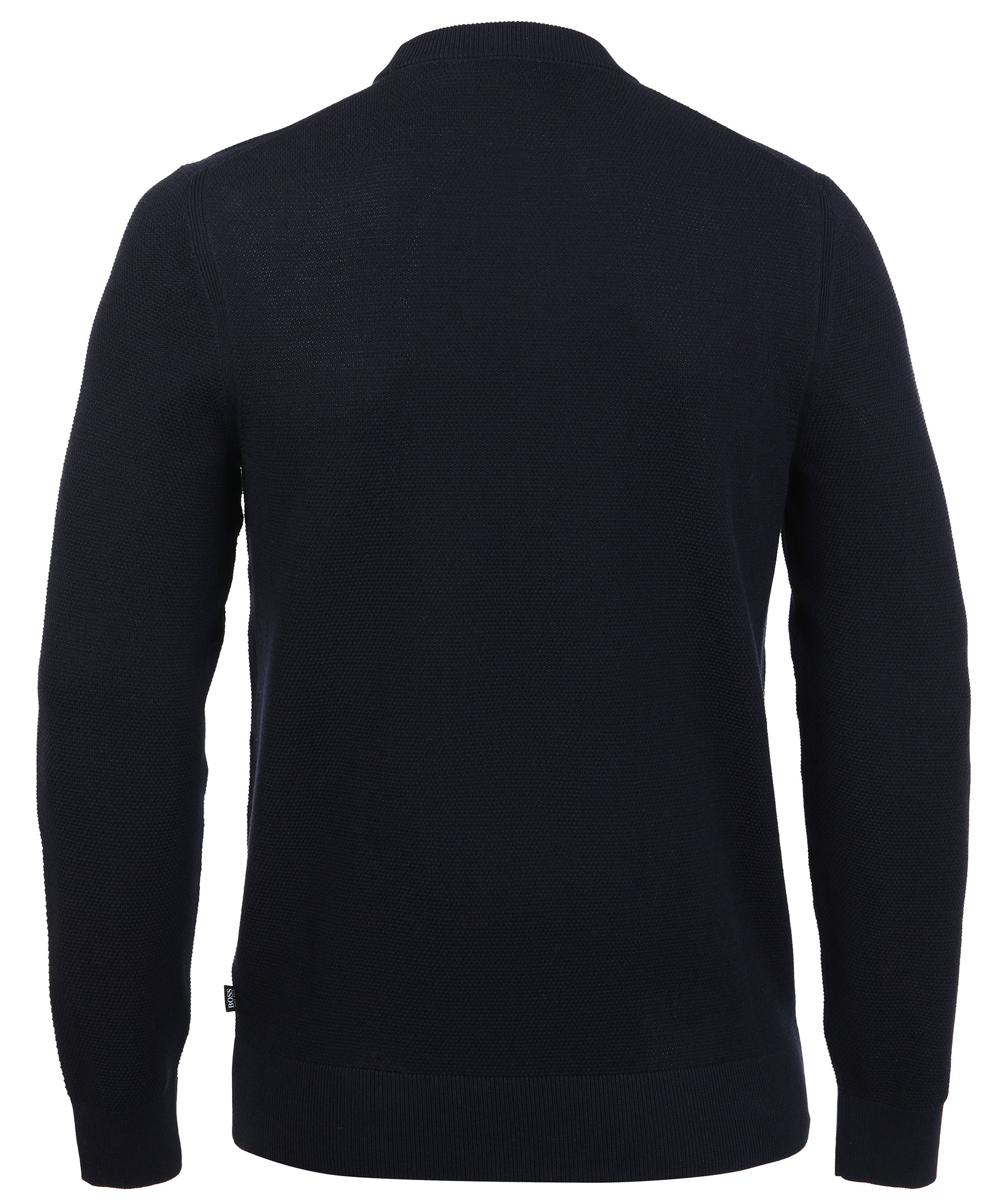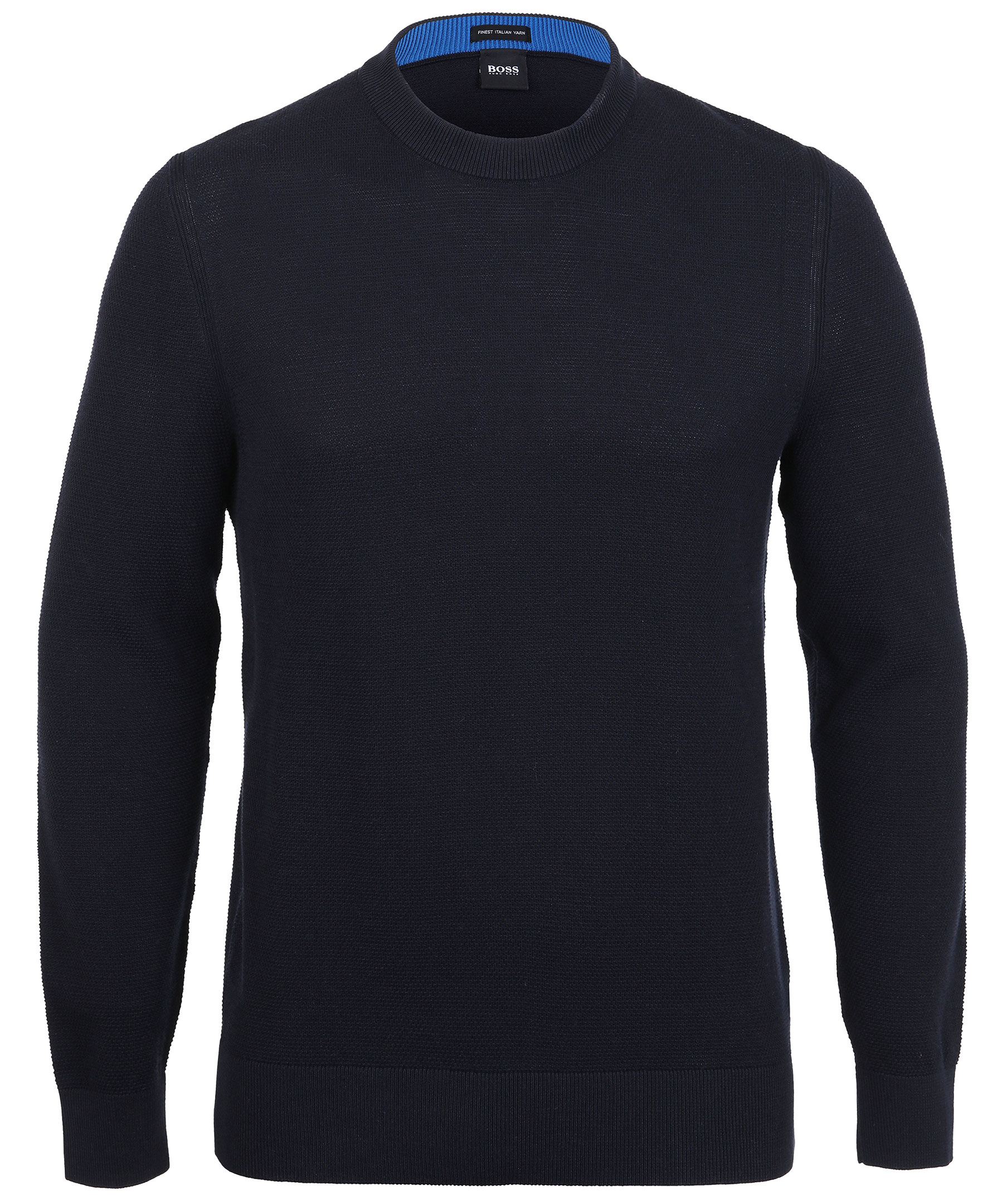 Marinblå, finstickad tröja med fin struktur från Hugo Boss. Tröjan har rundad hals och svart liten lapp med logotyp nere på höger sida. Ribbade detaljer på ringningen, på ärmslut och plaggslut.