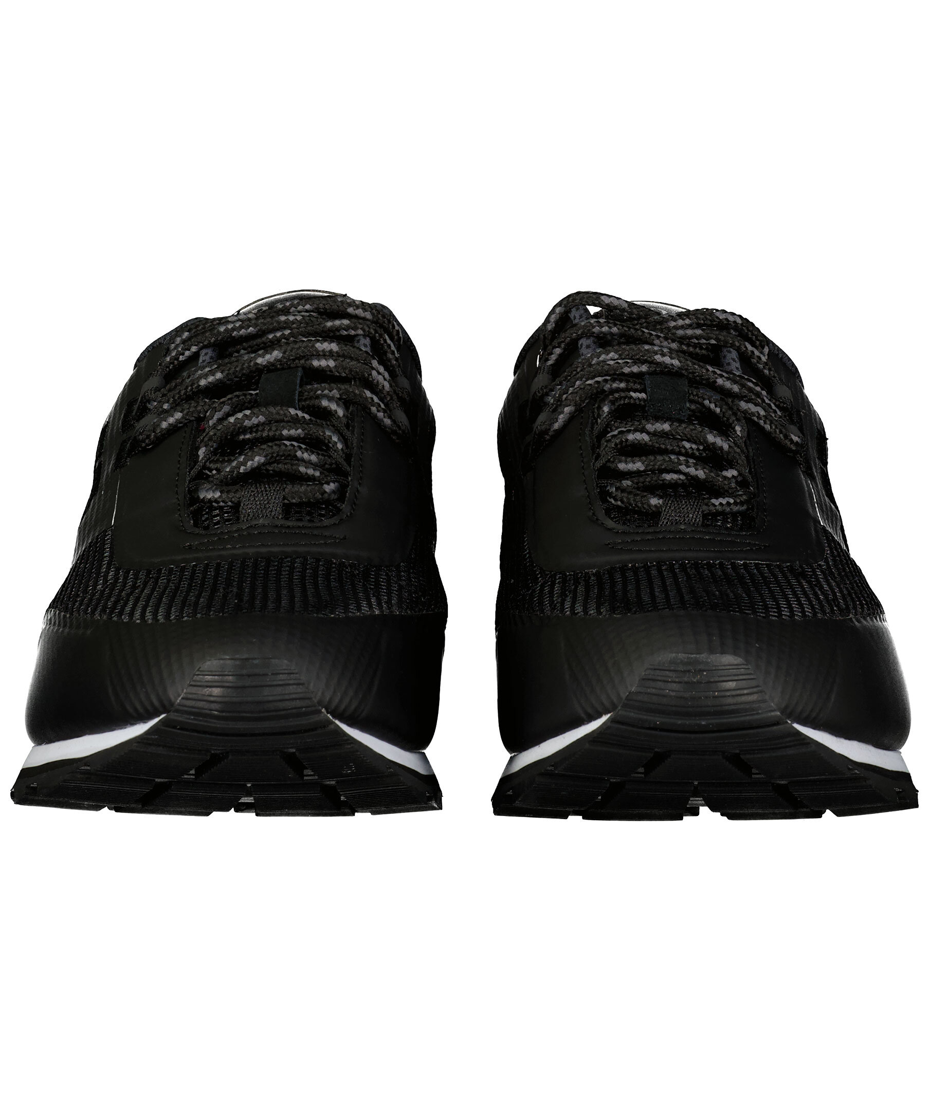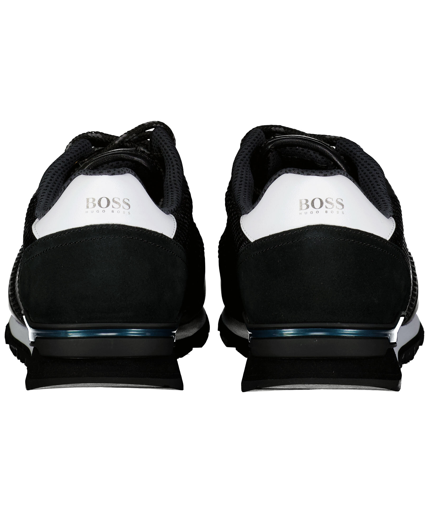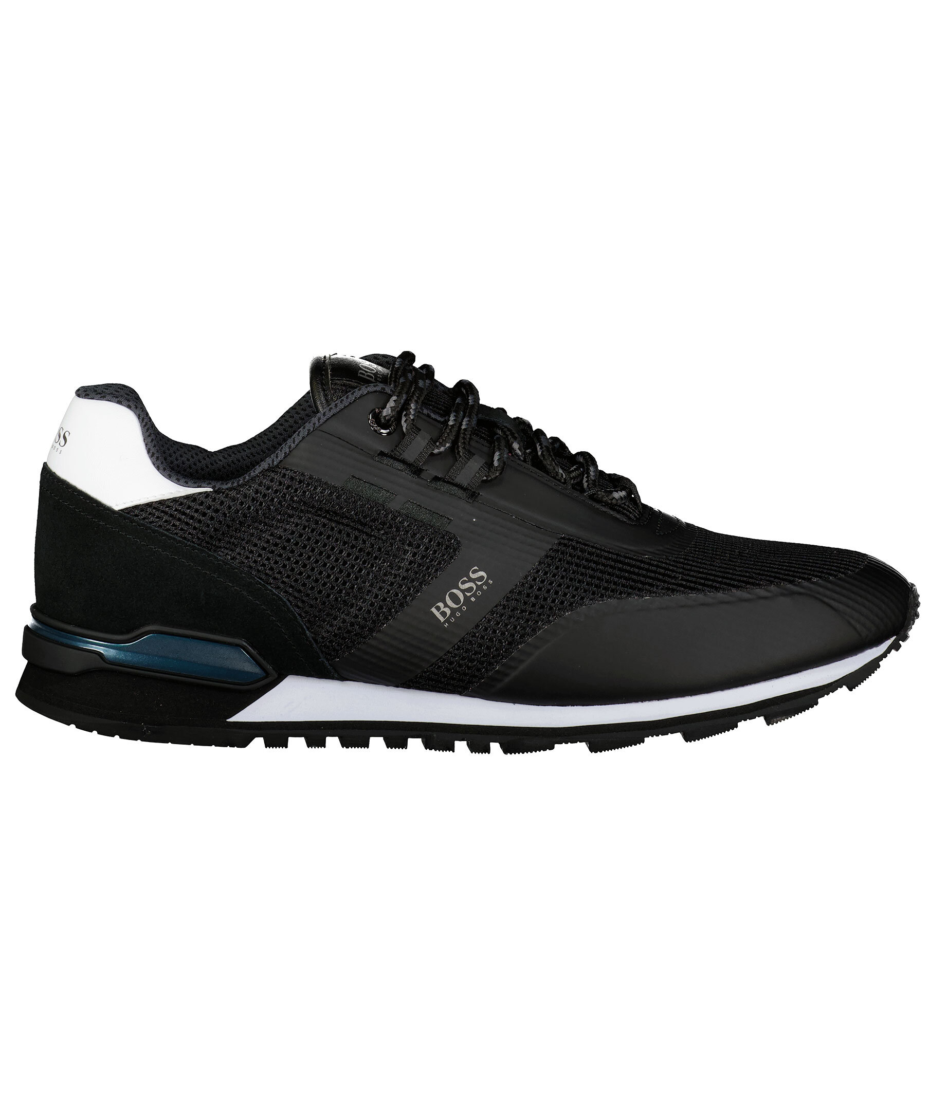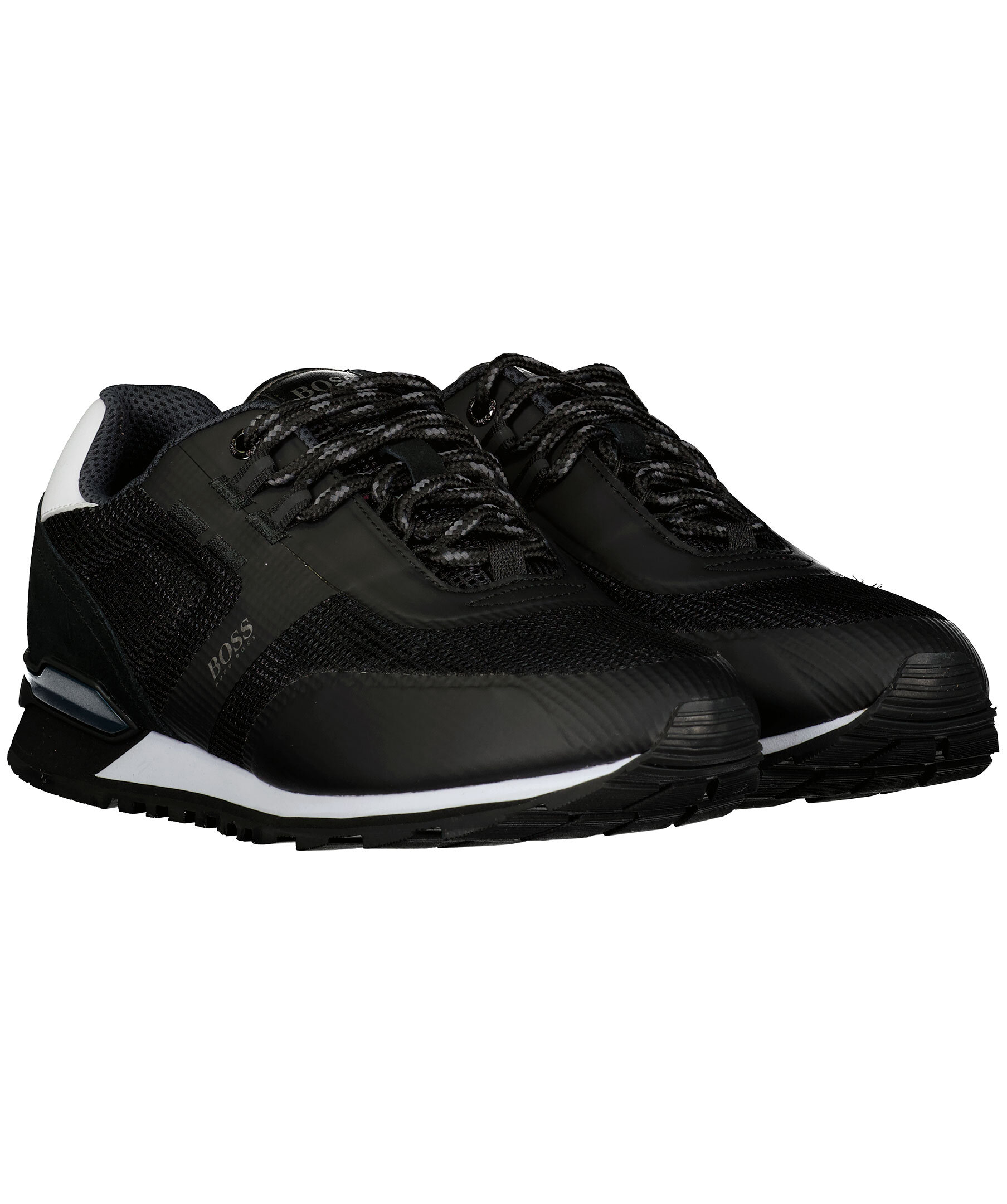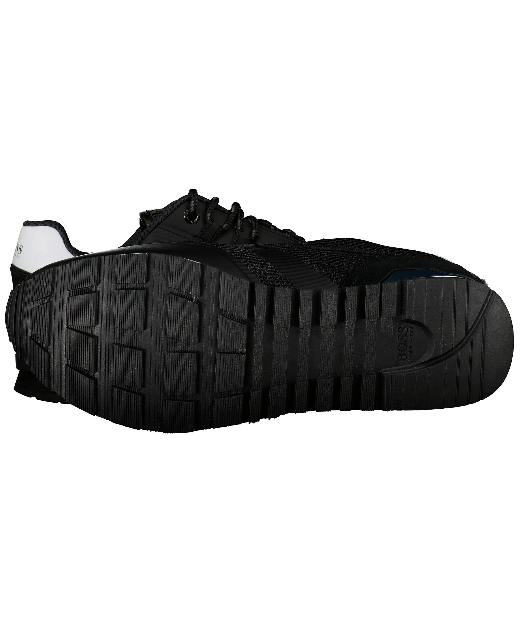 Svarta sneakers i nylon, mesh och läder från Boss Business. Lätt sula i svart och vitt med en signaturmönster och har en innersula i memory foam för optimal komfort samt ett bambu-kolfoder för avancerad fuktavvisande prestanda på sidorna. Vandringsinspirerad snörning och blå detalj runt underdelen av hälen. Logotyp på vit kontrastfärg på häl och på utsidan av skon.