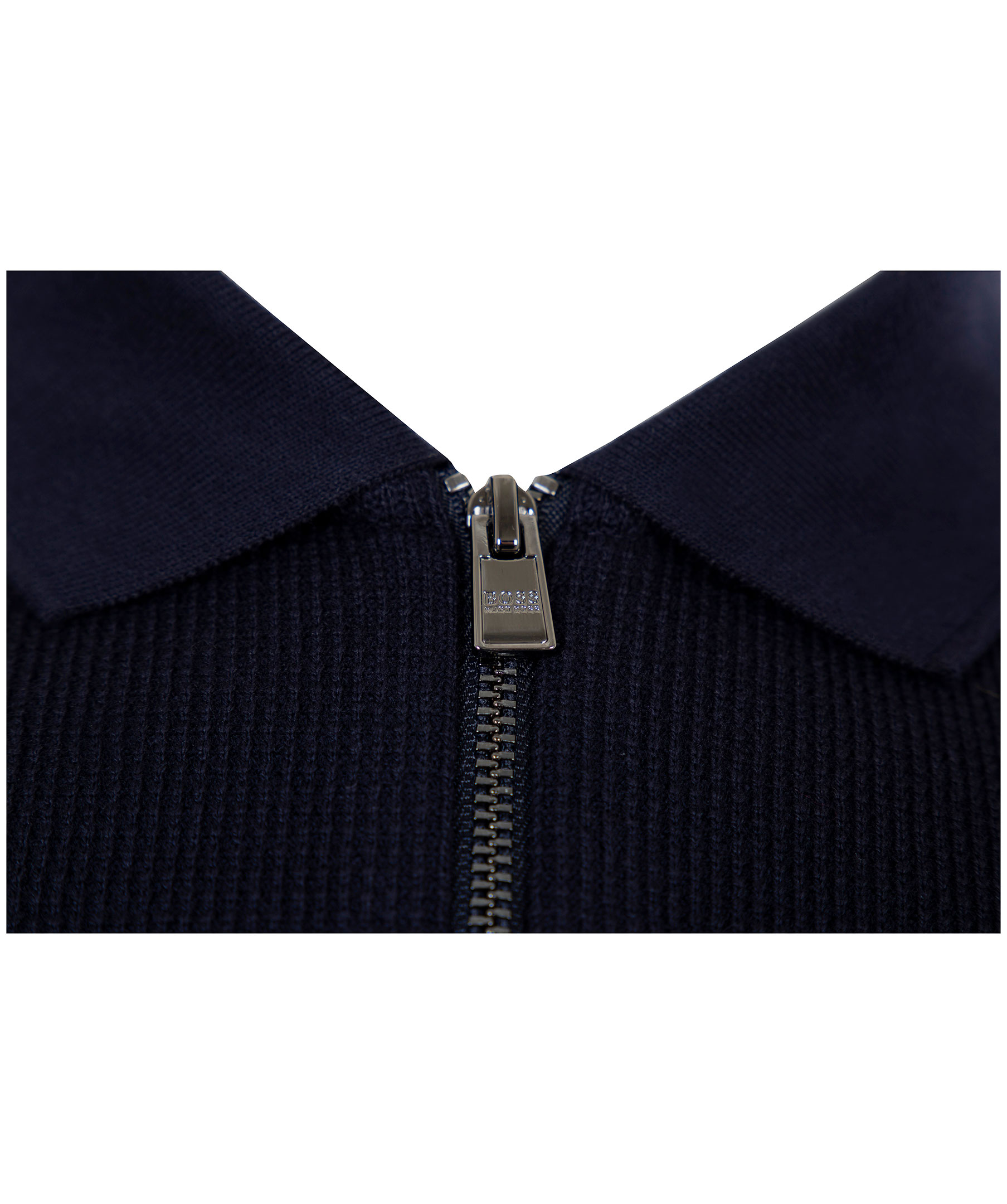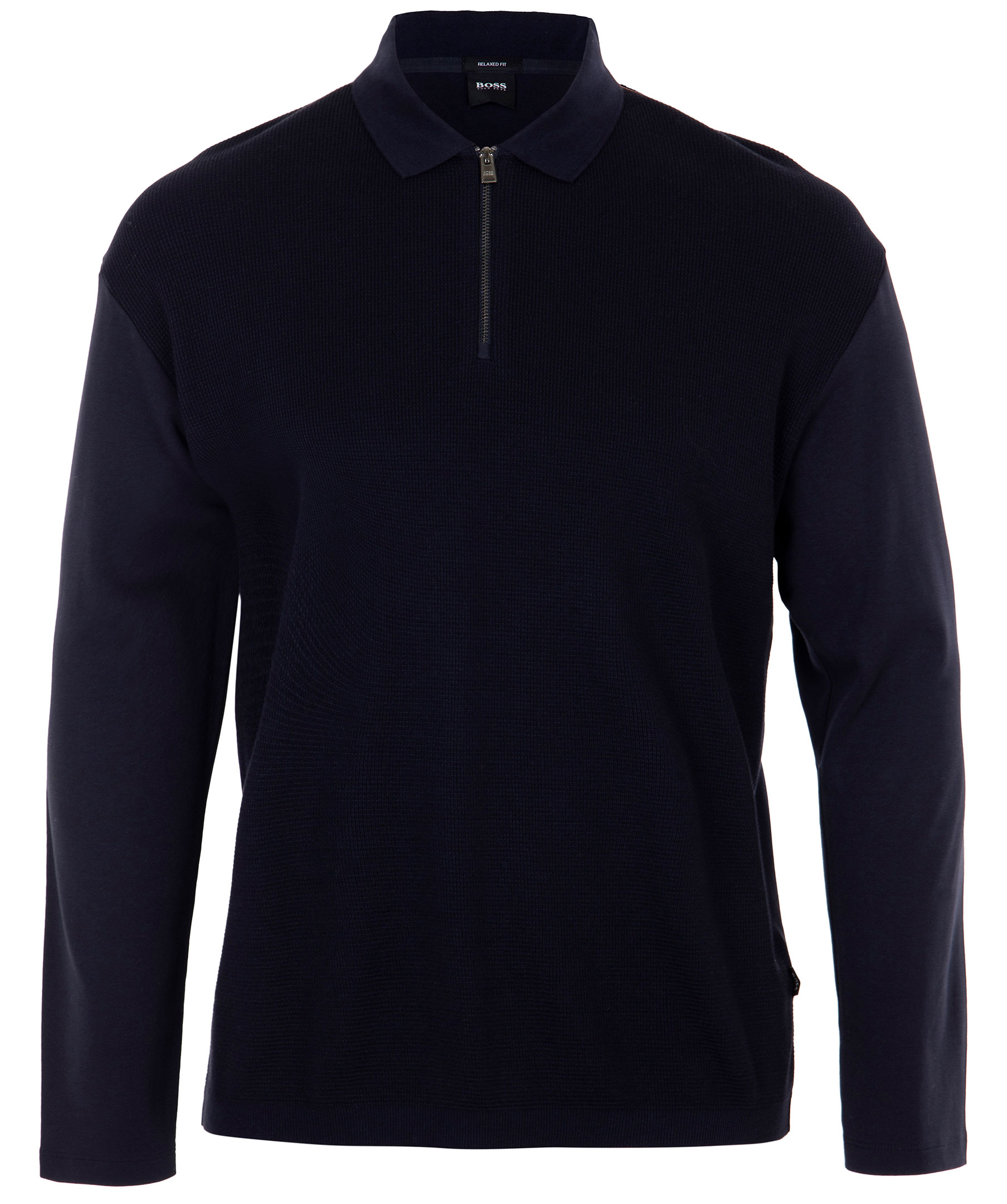 Mörkblå, långärmad pikétröja från Hugo Boss. Dragkedja upptill och fin krage. Strukturerat bomullstyg tyg på framsidan och slätt tyg i bomull på ärmar och rygg.