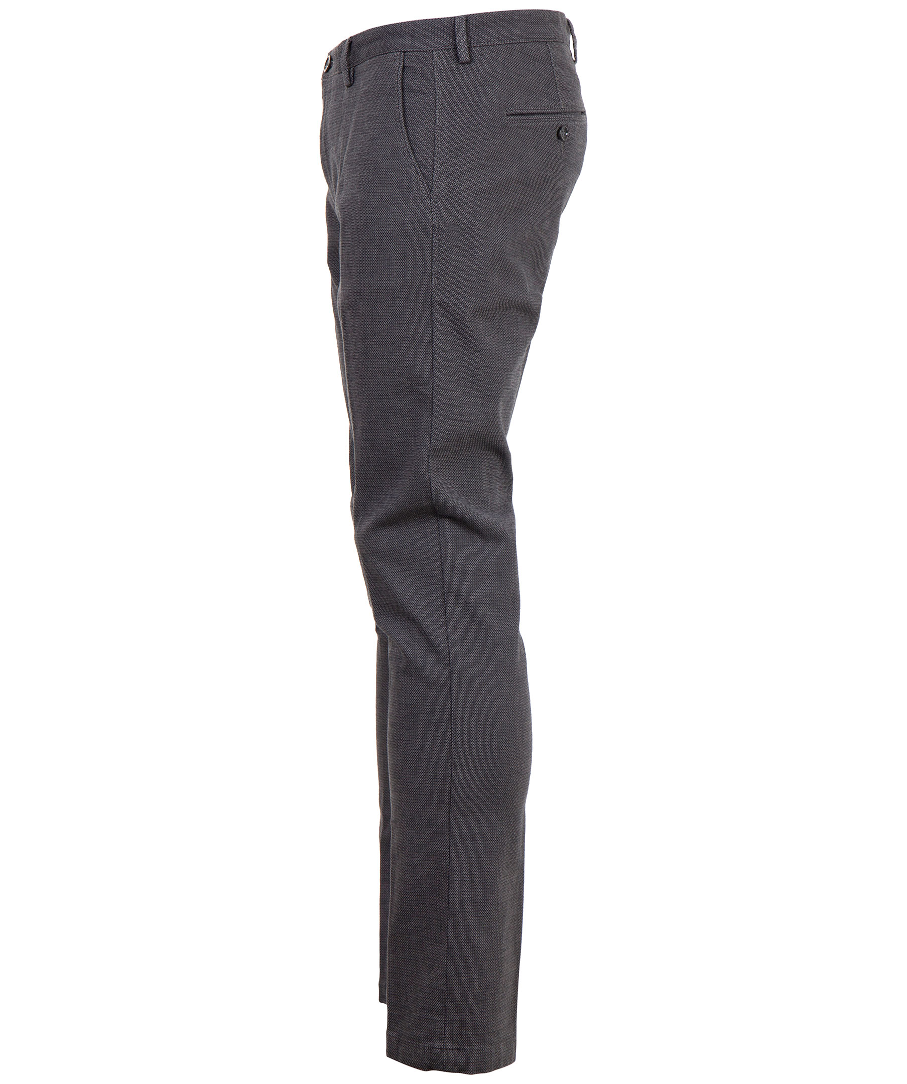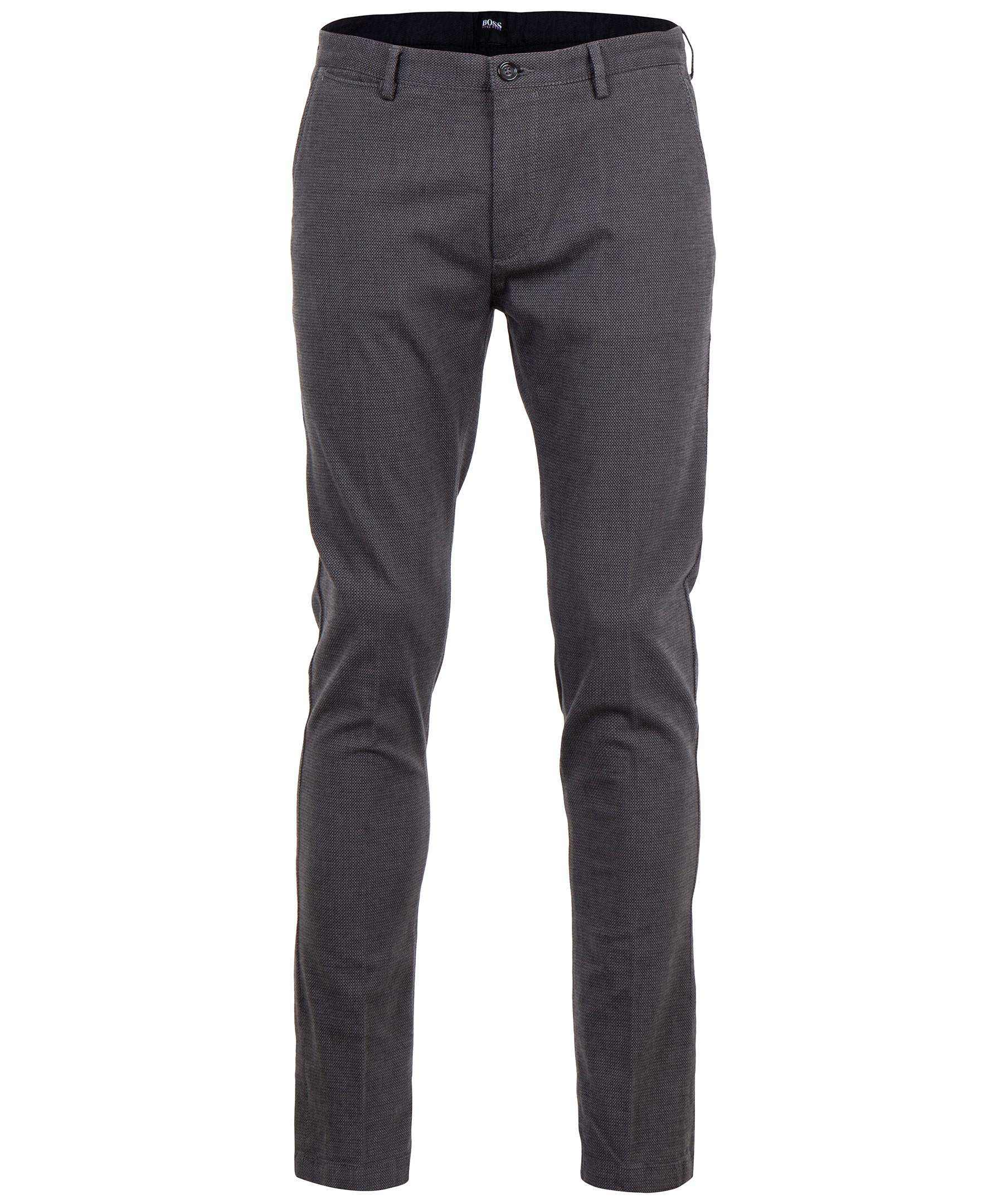 Gråa småmönstrade kostymbyxor i slim fit modell från Hugo Boss. Tre fickor fram och två fickor bak. Ena bakfickan har ett ficklock över halva fickan med en knapp. Hällor för skärp och dold gylf med dragkedja och knapp. Tillverkad i stretchig bomull.