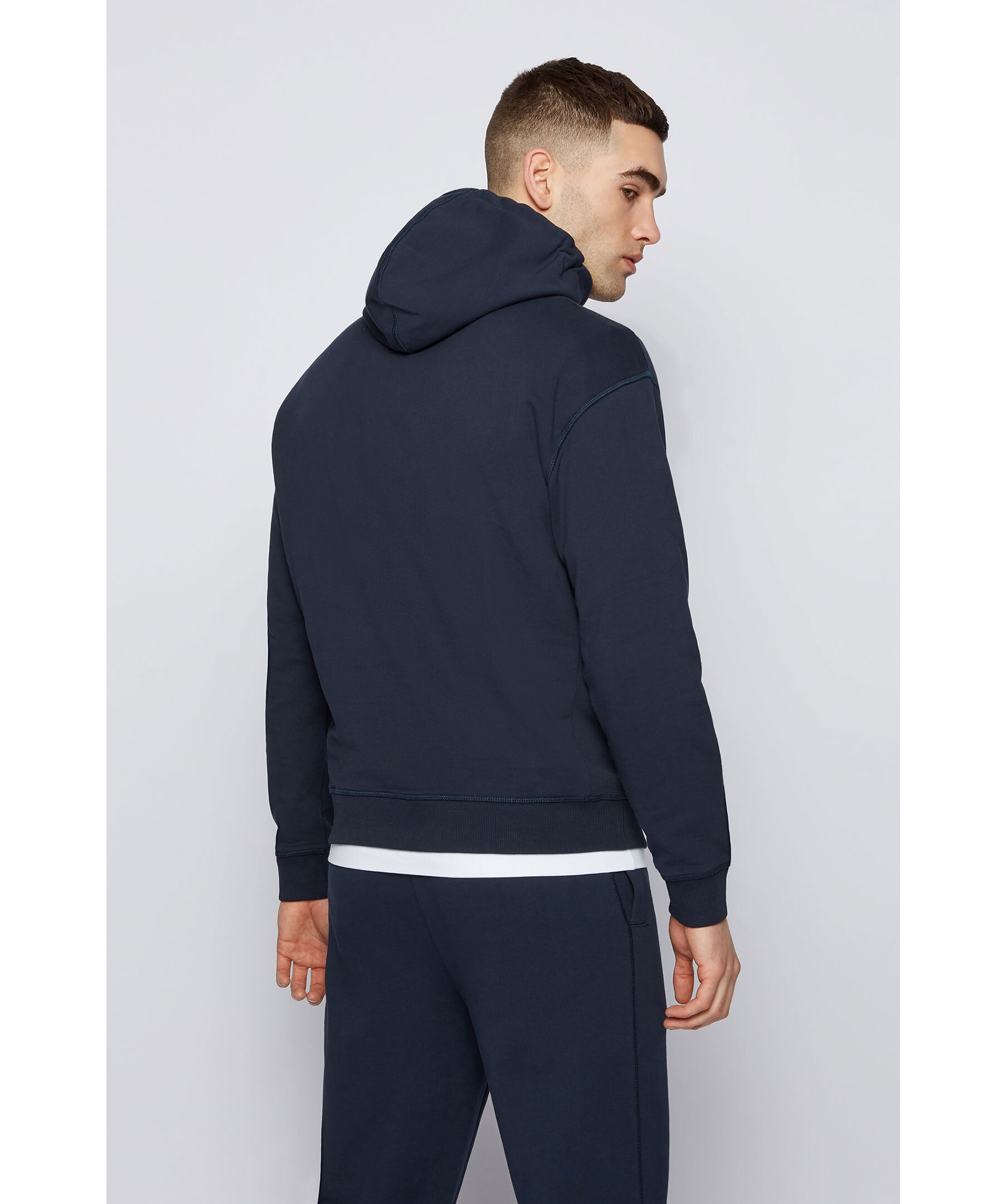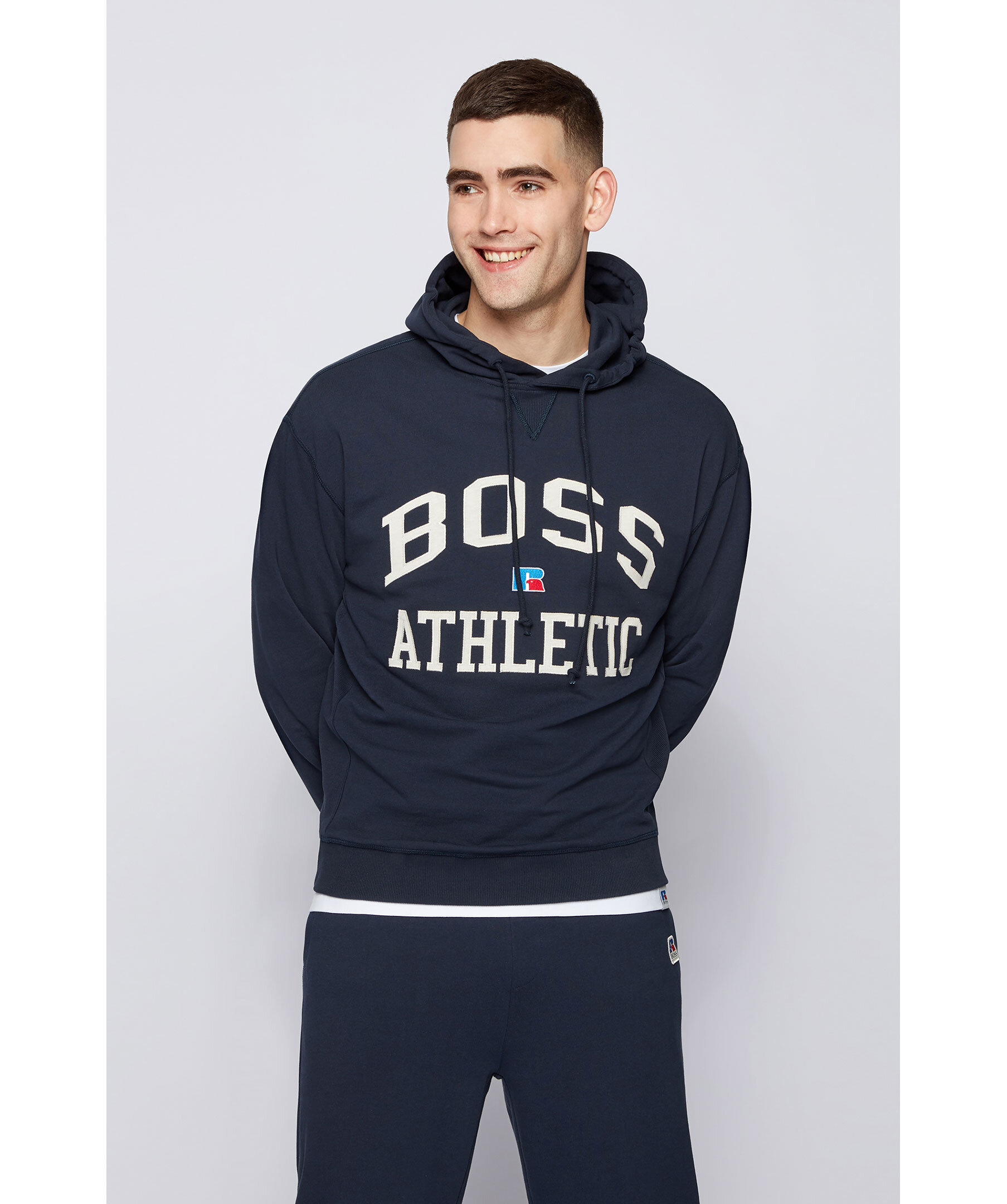Marinblå hoodie från BOSS x Russell Athletic. Luva med snörning och har en stor broderad logotyp i vitt på framsidan. Flärp med logotyp på vänster ärmslut och har ribbade muddar i ärmslut, plaggslut samt i sidorna. Tillverkad i 100% bomull. * Russel Athletic * Rosa logotyp * Snörning i luva
