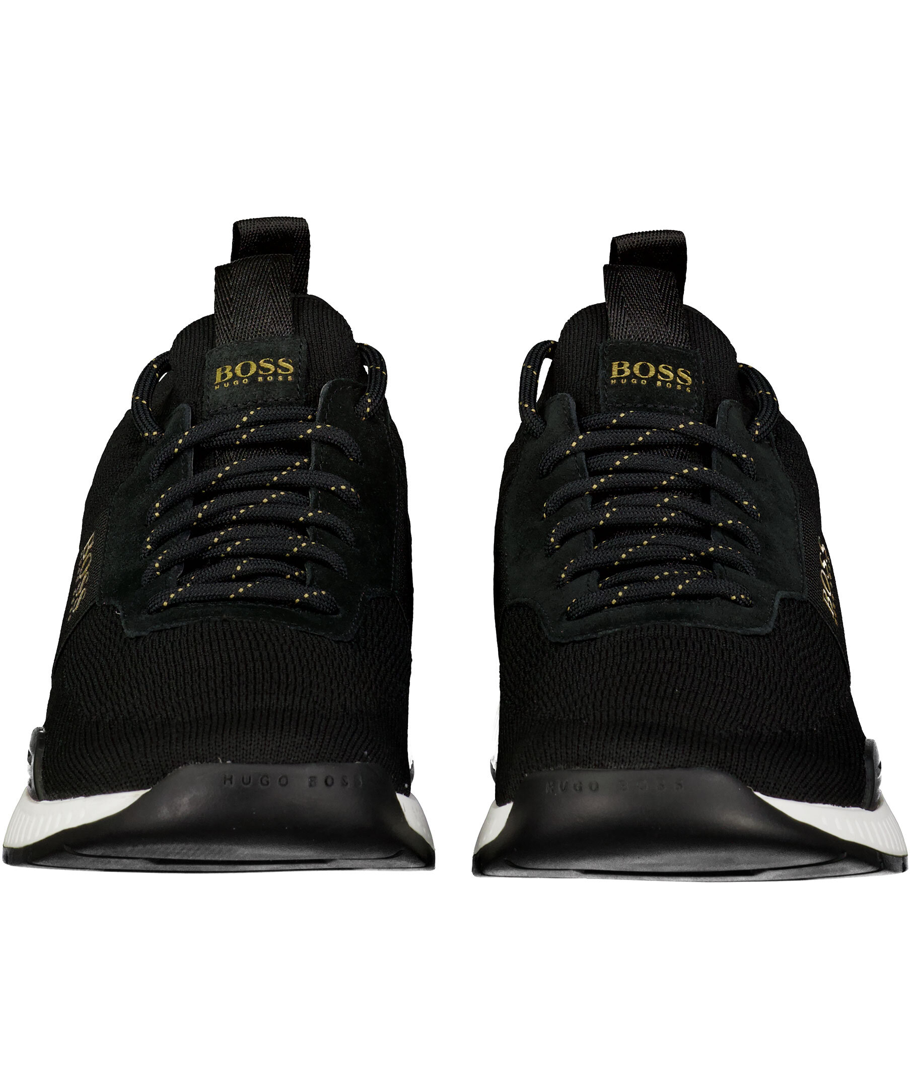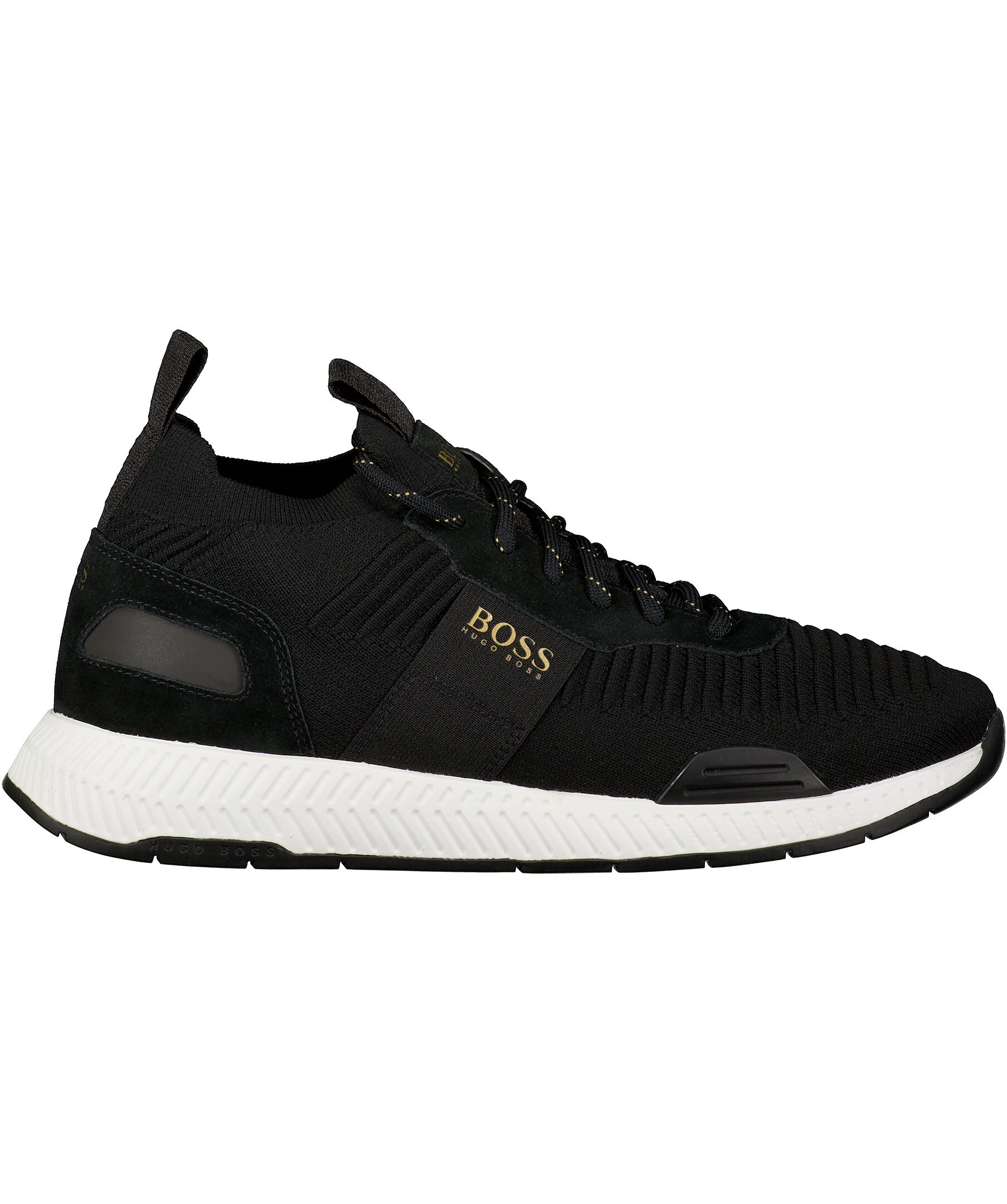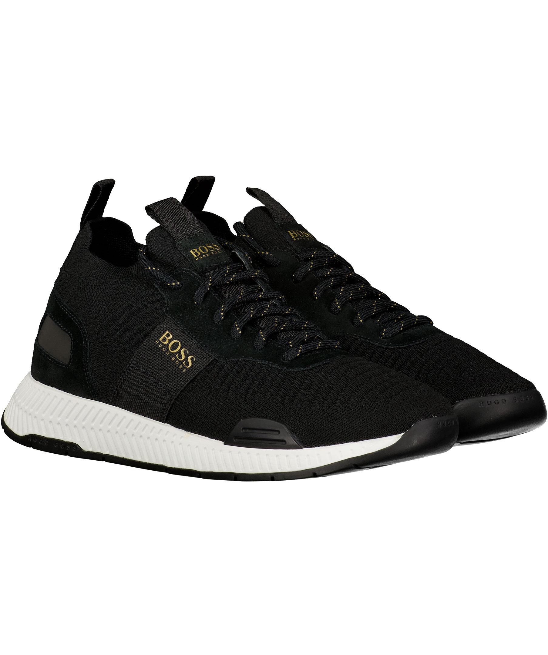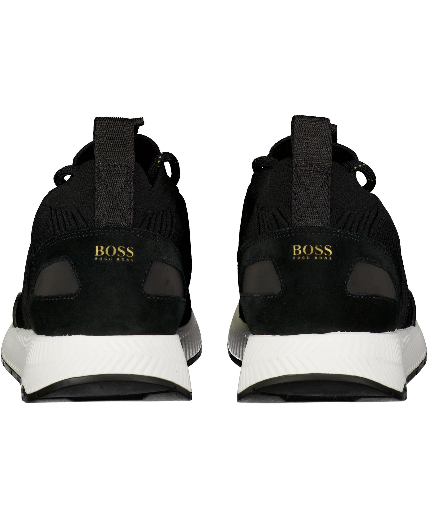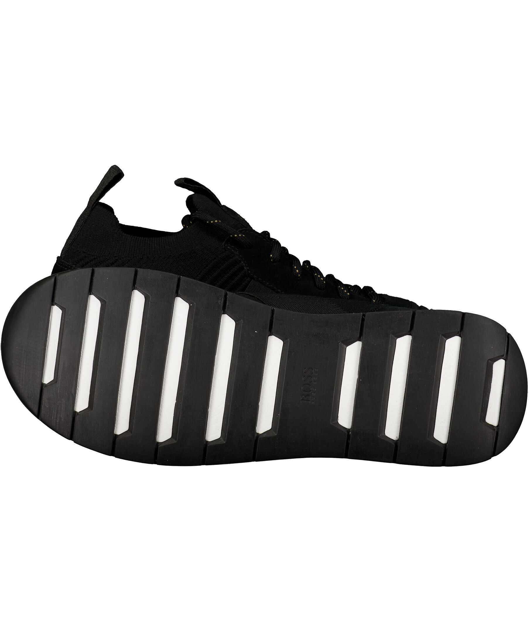 Svarta sneakers i stickad textil från Boss Athleisure. Strumpliknade modell. Skorna har svarta mocka detaljer, svartvitt EVA-gummi sula. Logotyp på skons ena sida, hälen och på plösen. Skomodellen är inspirerad från klassiska löpskor. *Mockadetaljer *Stumpmodell *Sula i gummi