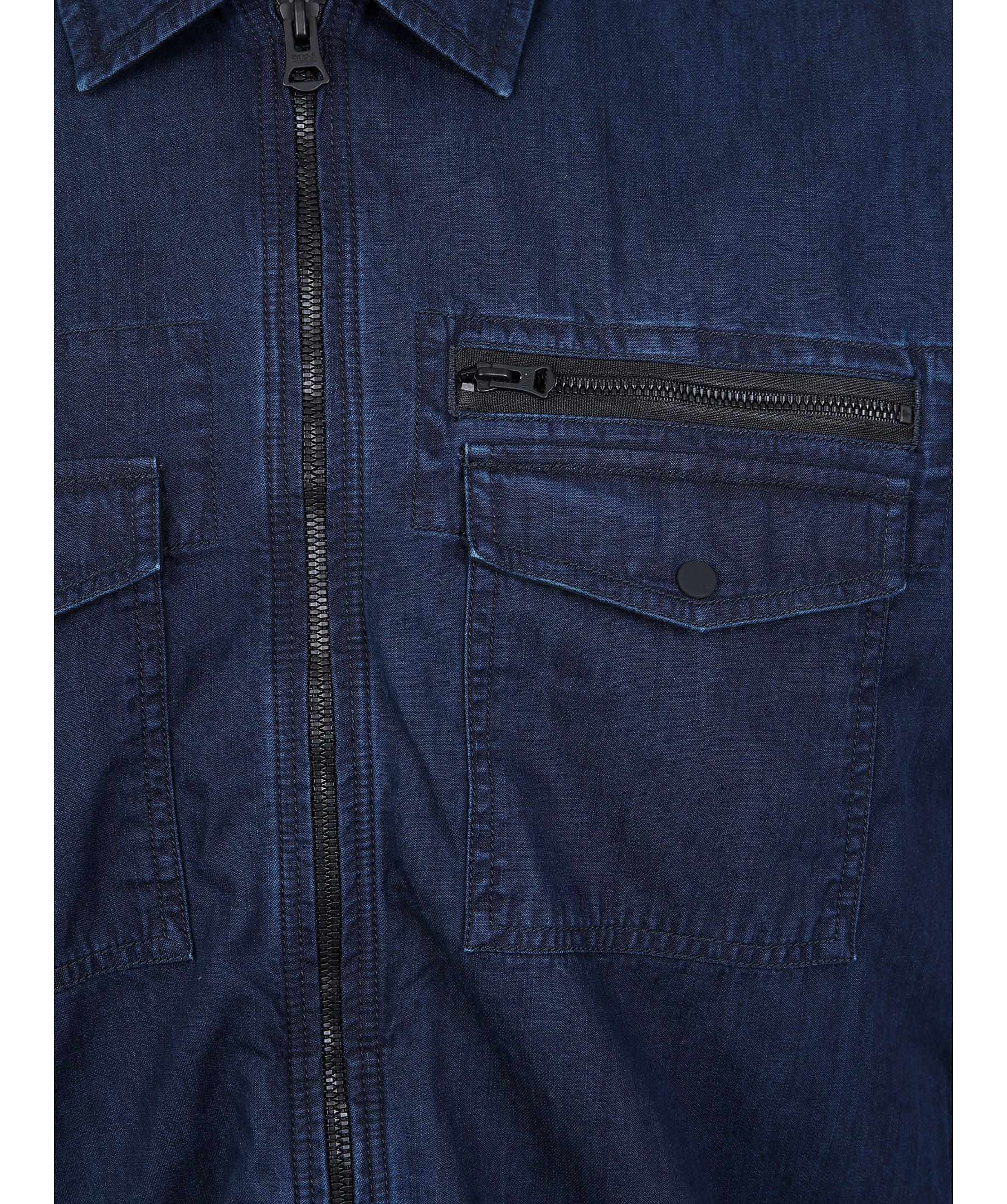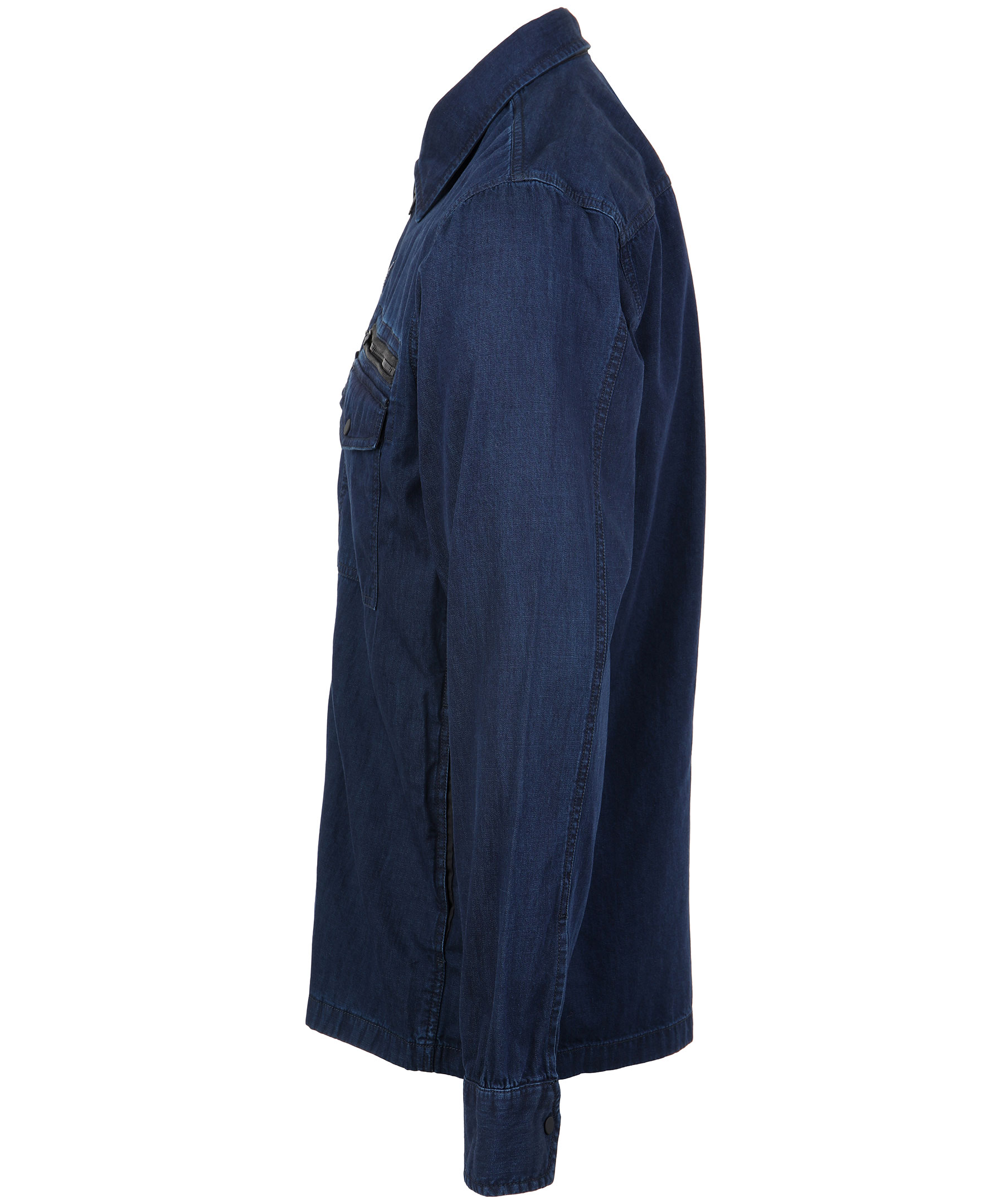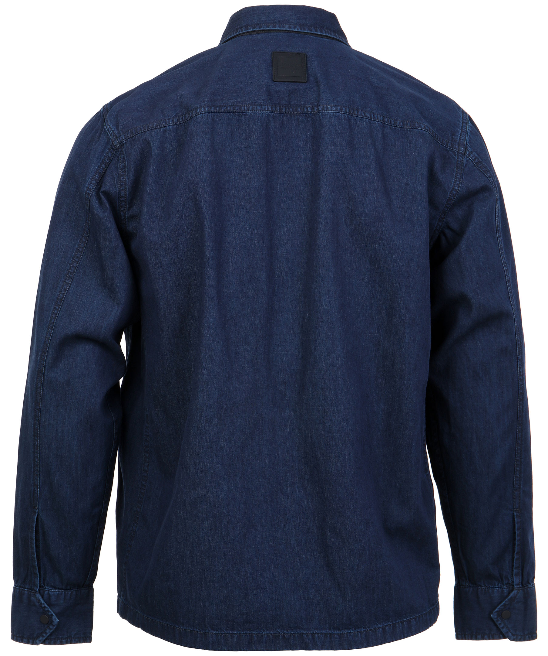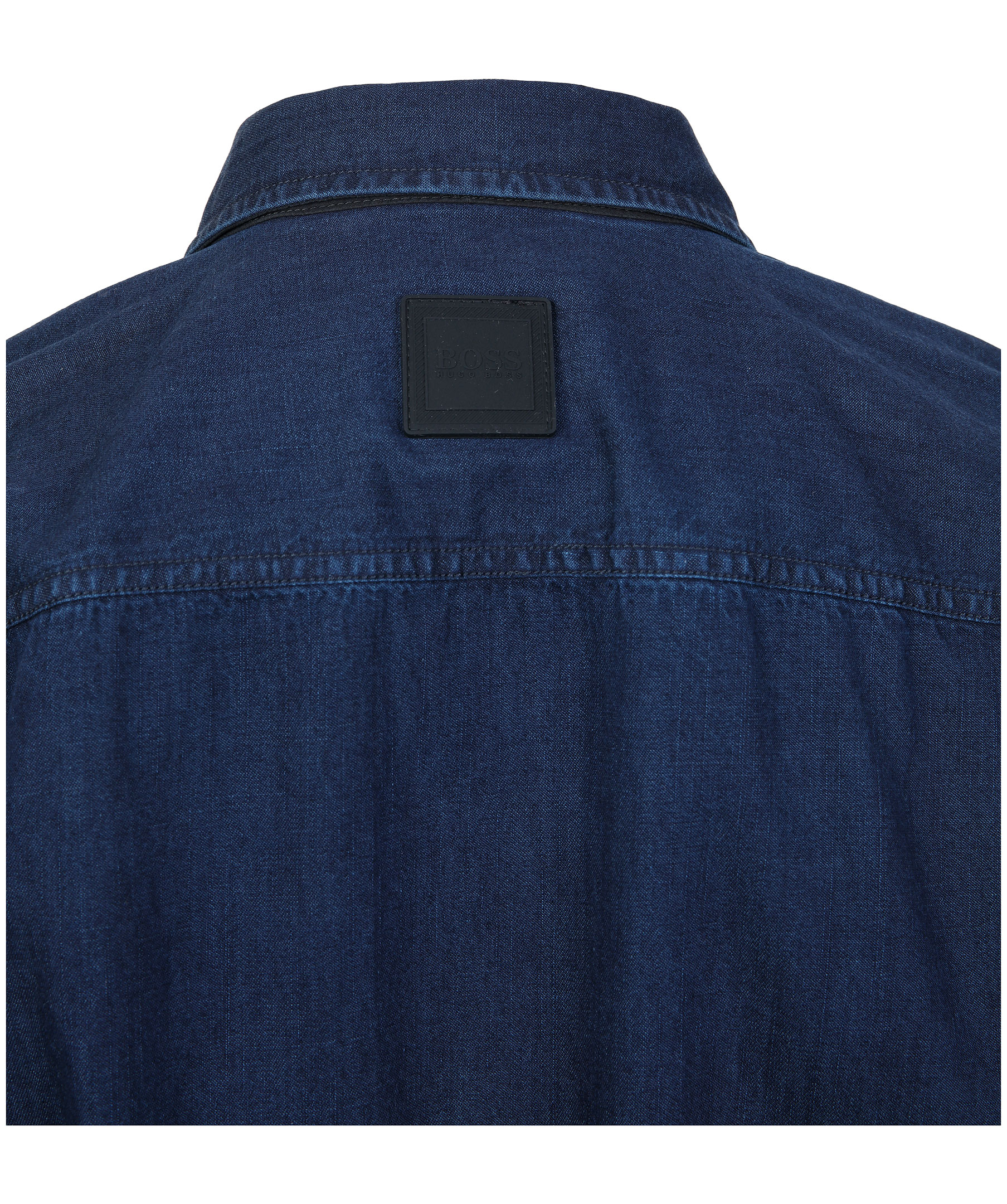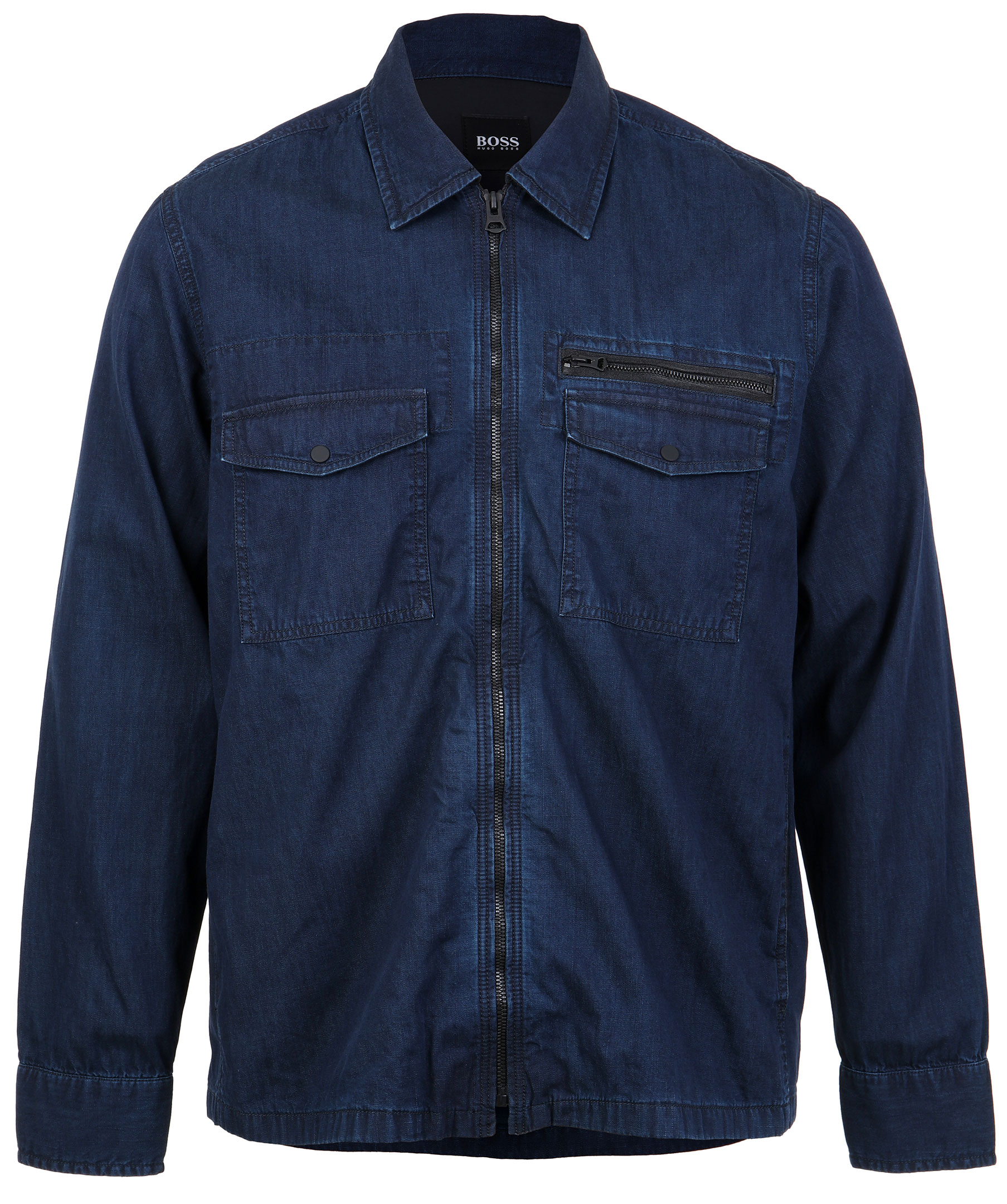 Mörkblå jeansskjorta i overshirt-modell från Hugo Boss Casual. Tillverkad helt i bomull. Tre bröstfickor, svart dragkedja, mattsvarta knappar.