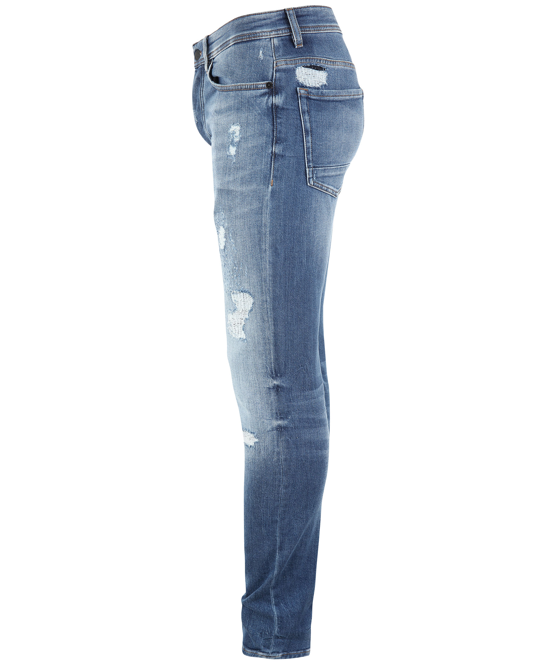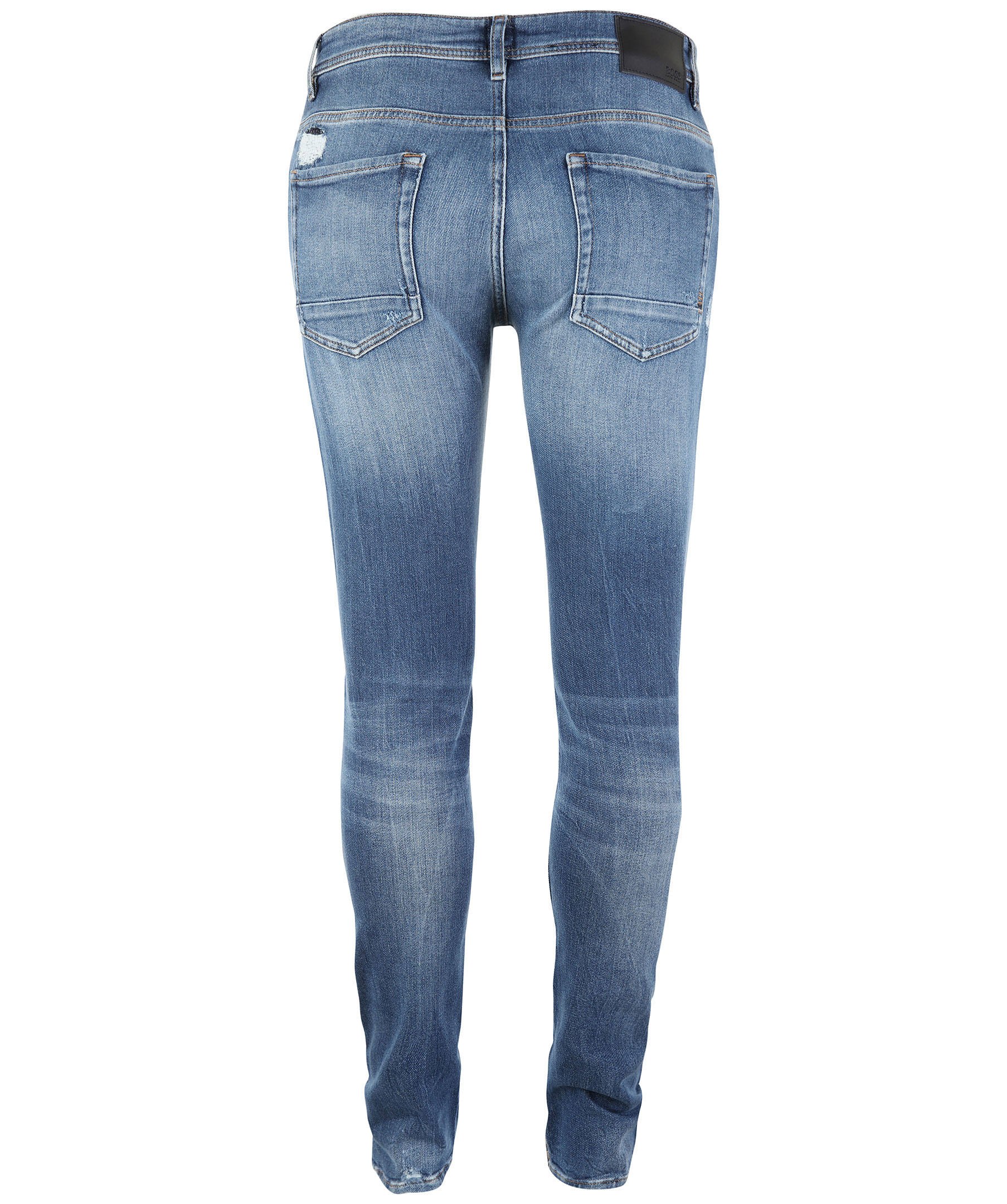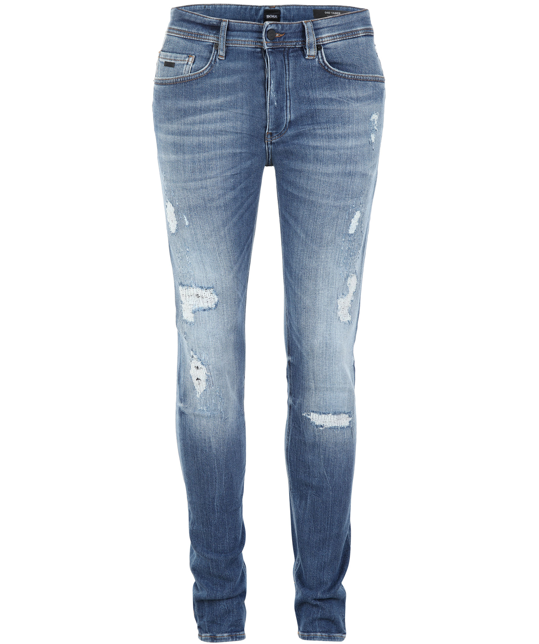 Blå jeans från Hugo Boss i tapered fit. Tillverkad i bomullsmix. Femficksmodell, medelhög midja med avsmalnade ben. Slitningar på benen fram och ovanför ena fickan bak. Hällor för bälte i midjan. Stängs med dold gylf med dragkedja och knapp.