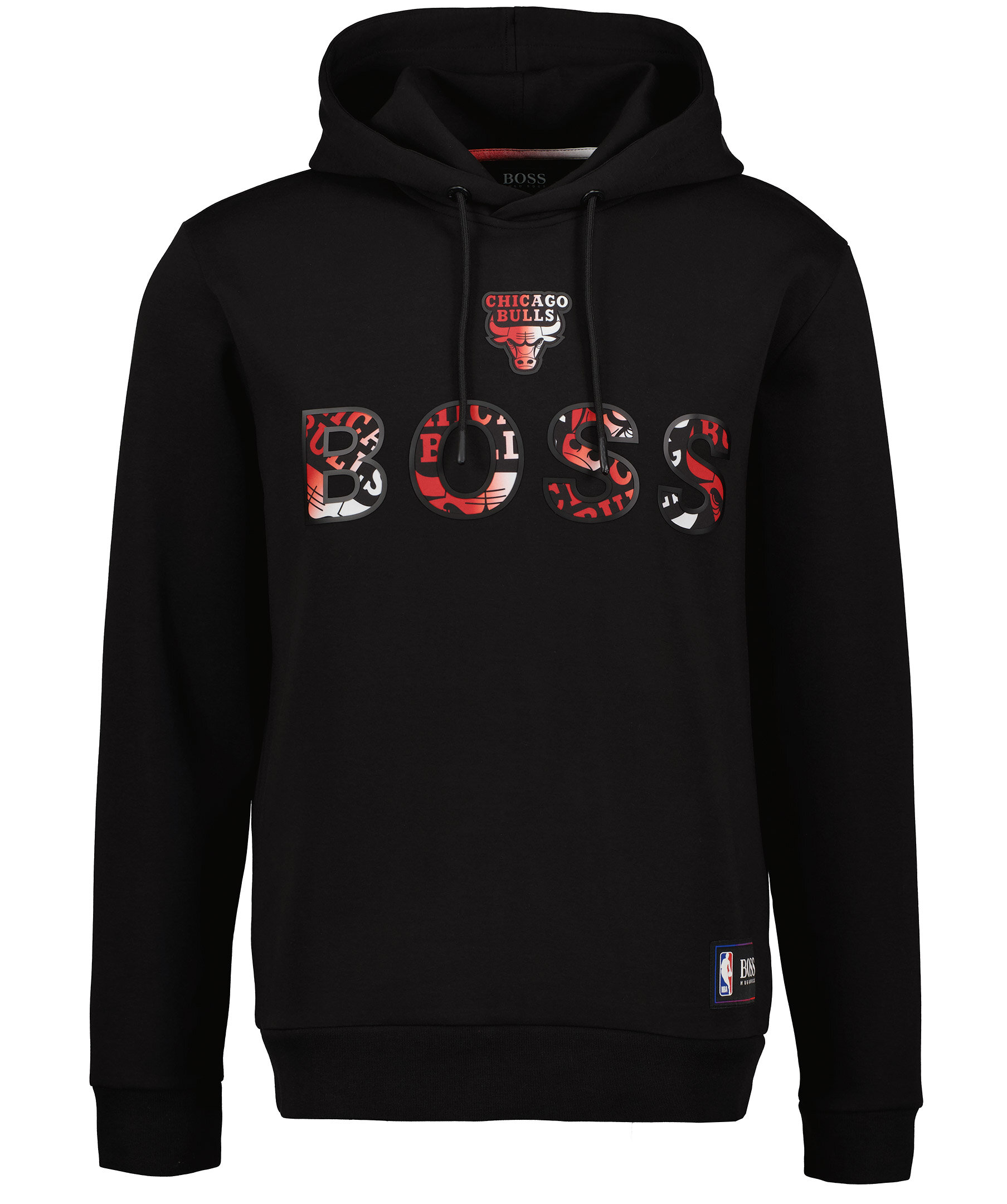 Svart hoodie från Boss Casual gjord i en bomullsmix, med tyg applikation med mönster. Svart dragsko i luva samt ribbade muddar. Från BOSS x NBA kollektionen. Patch med logotyp på vänstersida i midjehöjd.
