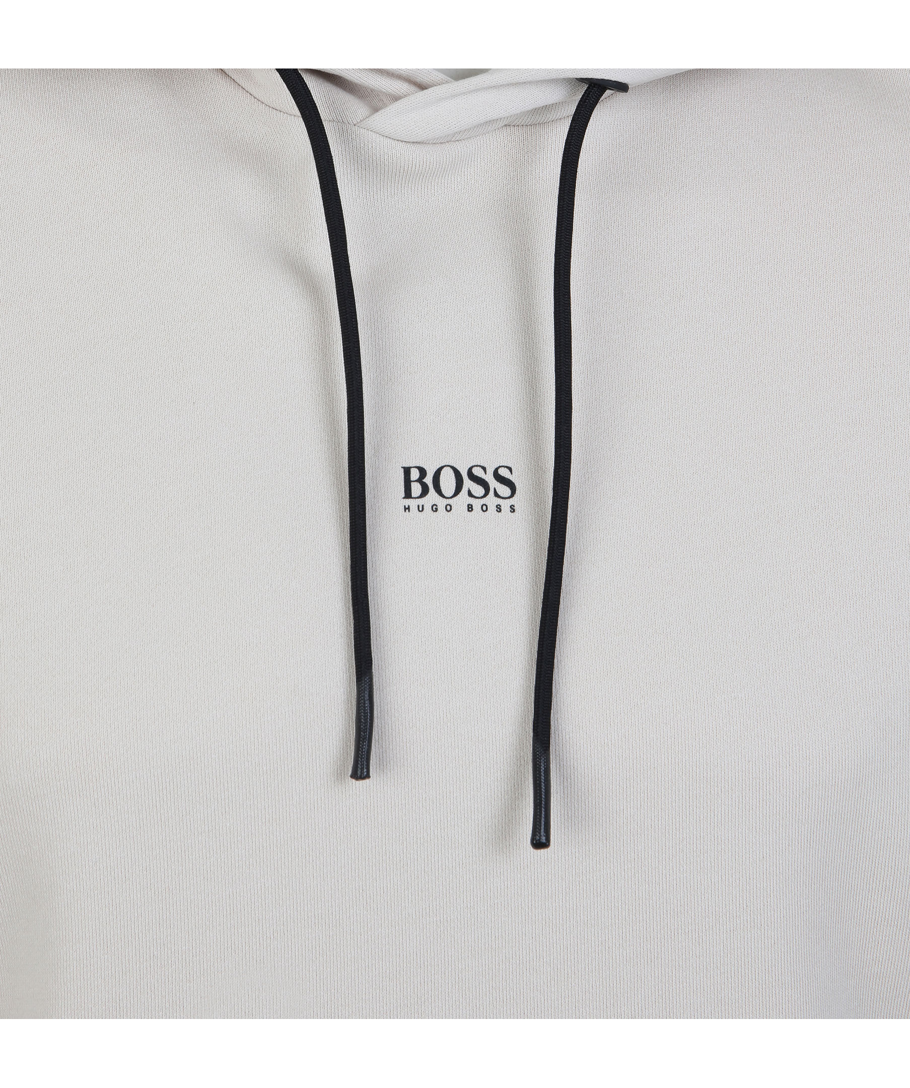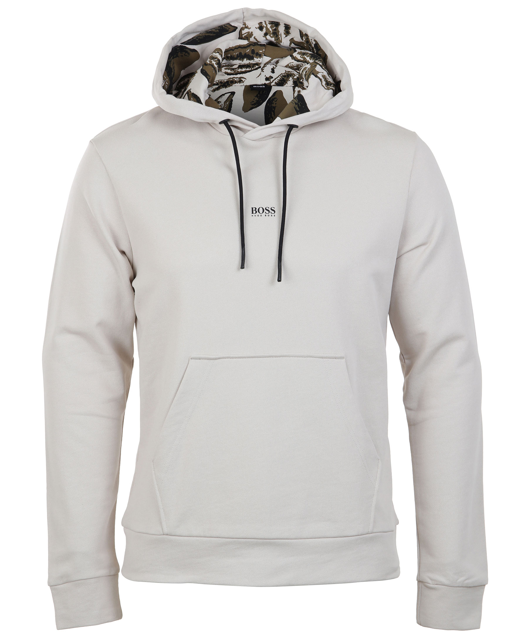 Beige hoodie från Hugo Boss med mönster i luvan. Liten tryckt logotyp mitt på bröstet, ficka på magen och luva med snörning. Muddar i ärmslut och plaggslut. Tillverkad i bomull.