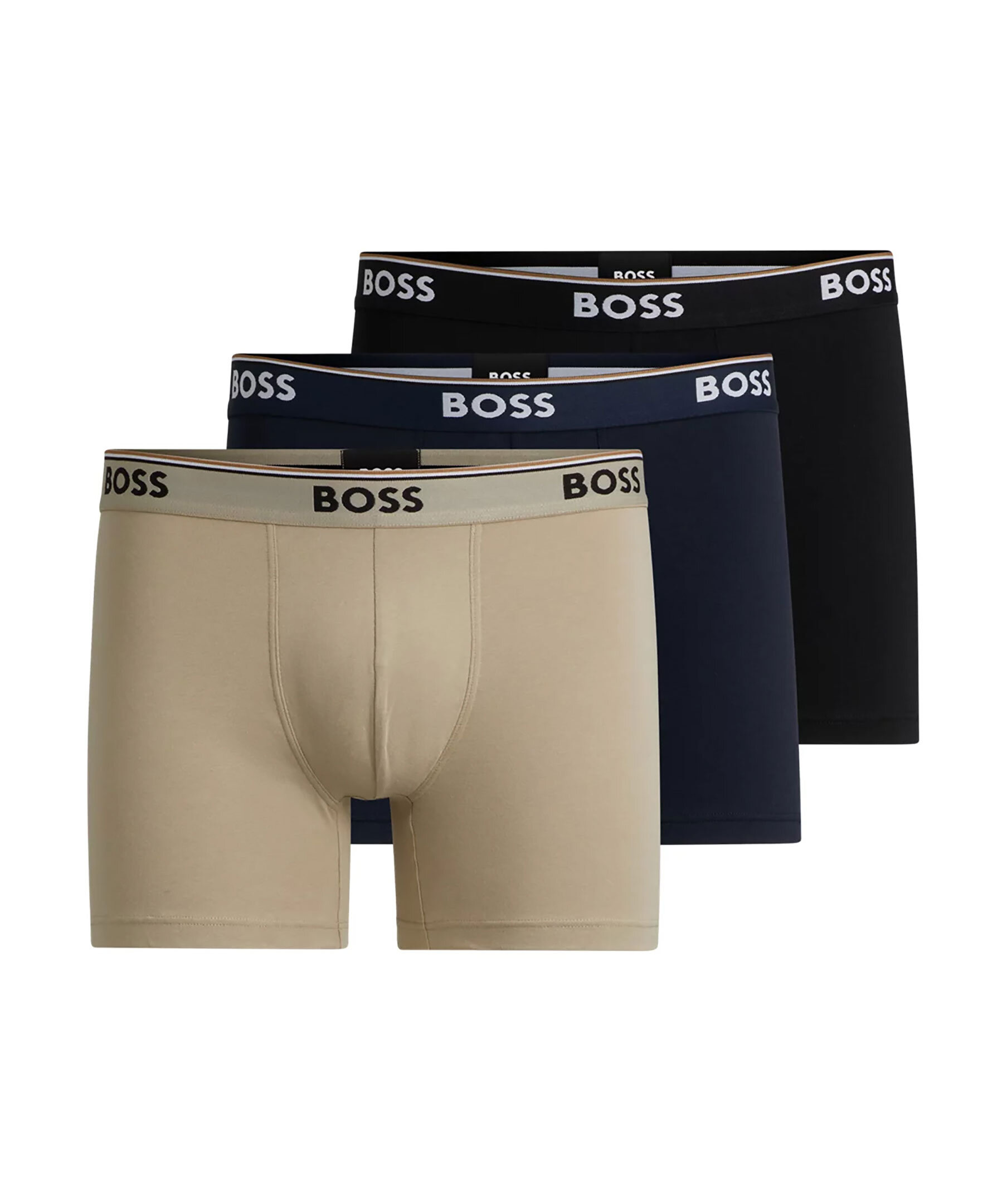 3-pack boxerkalsonger från BOSS Black. Kommer i färgerna svart, marinblå och beige. Tillverkade av stretchig bomullsjersey. Med normalhög midja och flera loggor på midjebanden.
