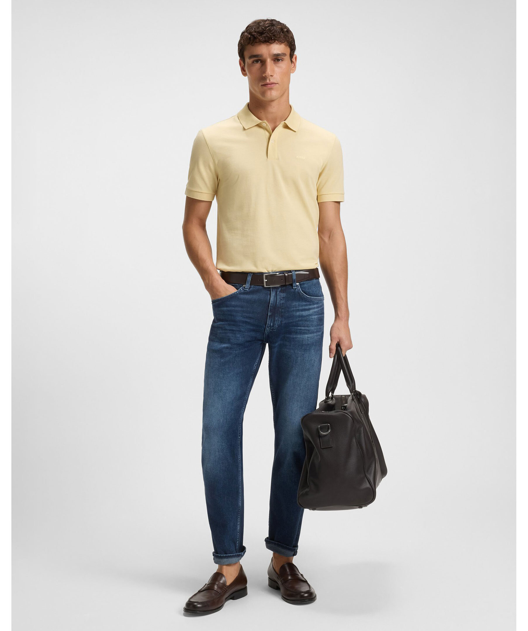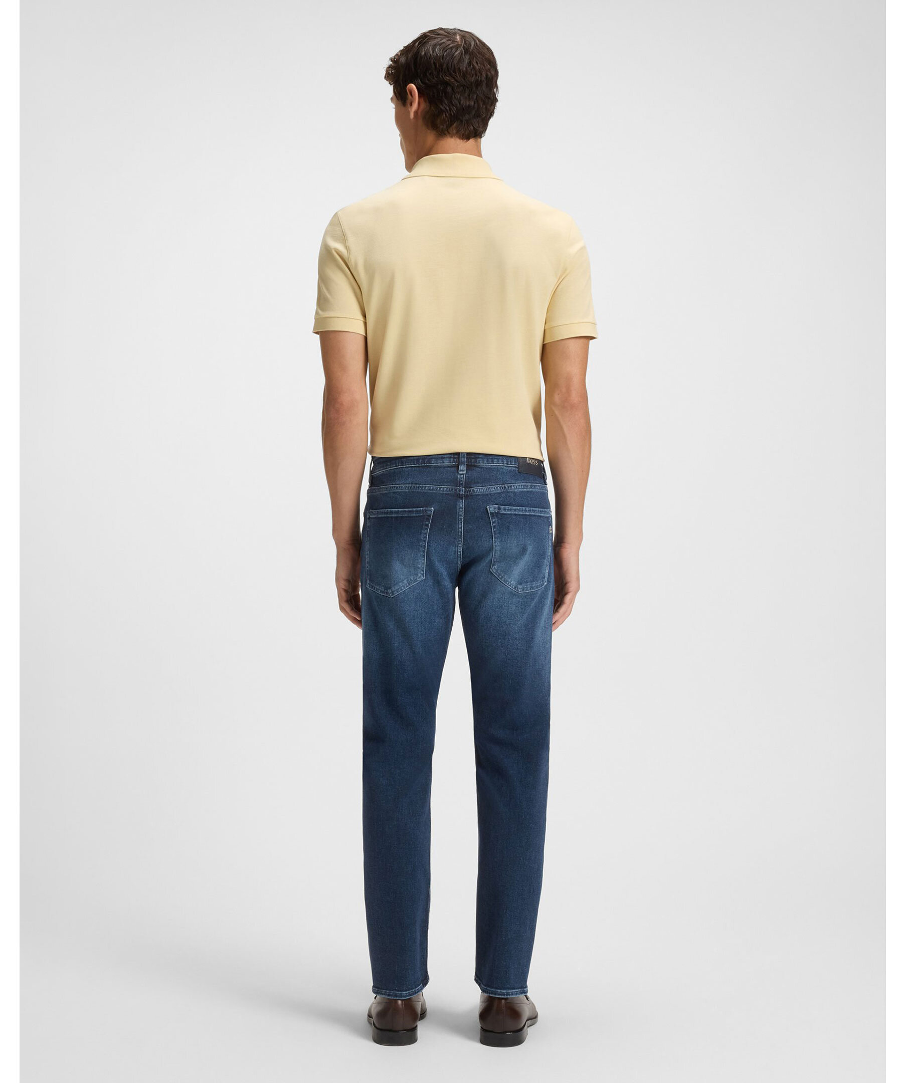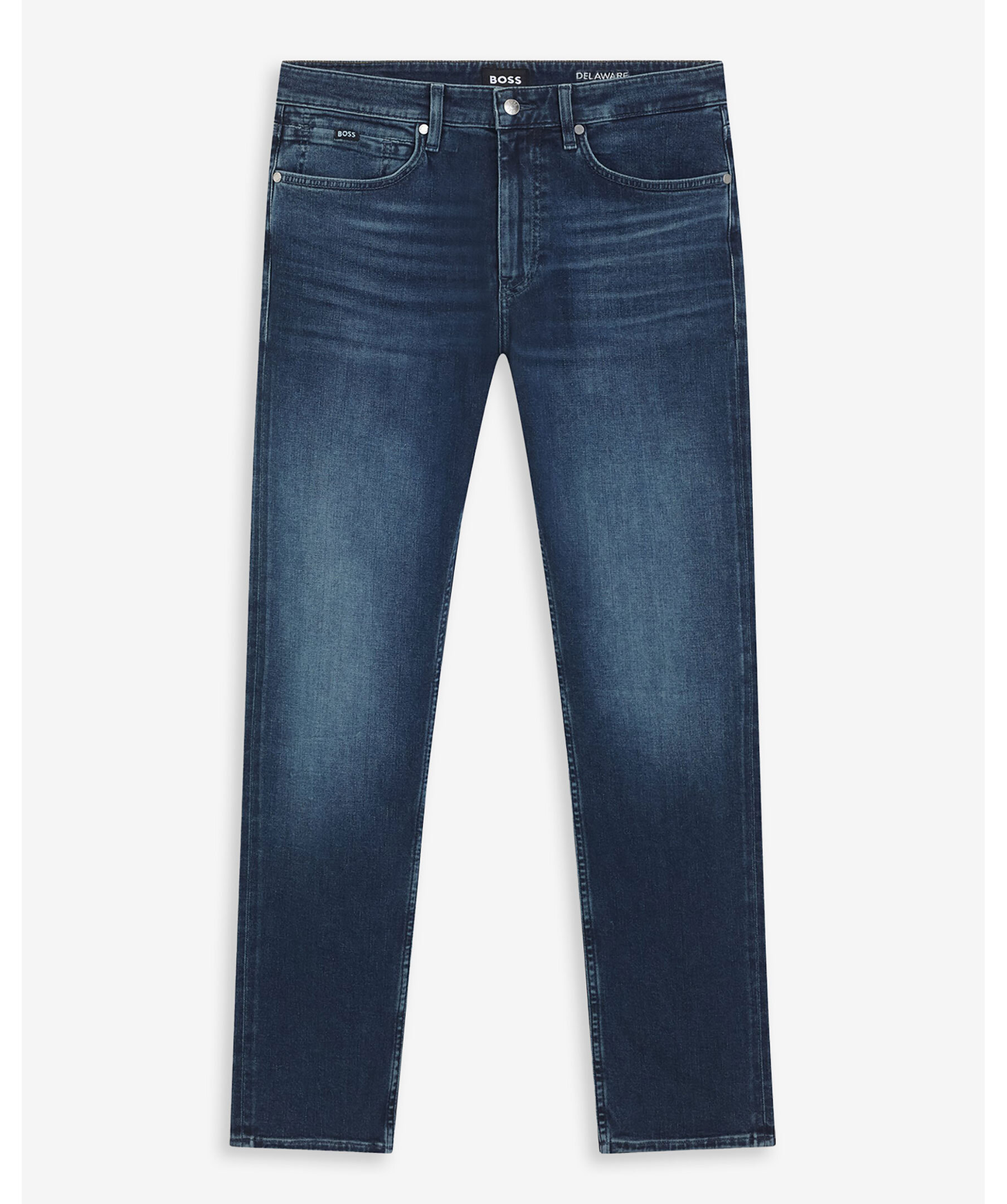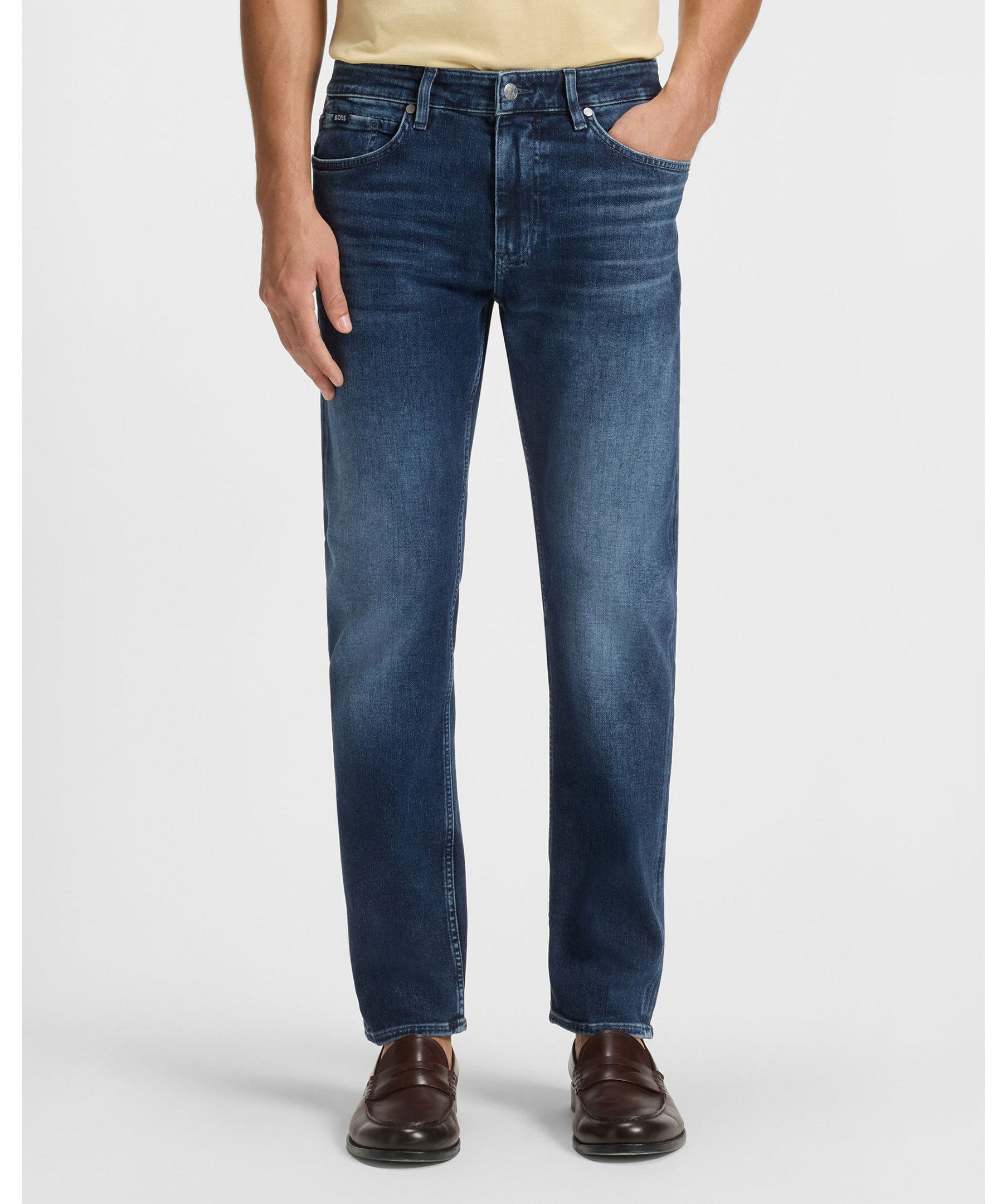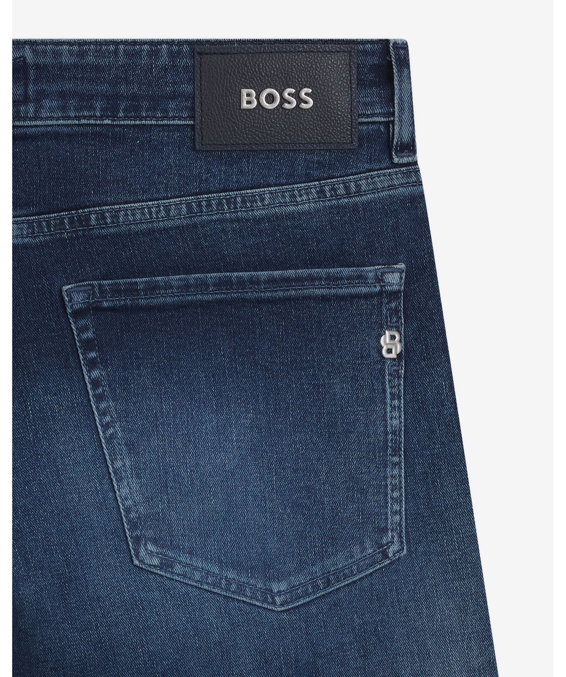 Mörkblå slim fit-jeans från Boss i mjuk stretchdenim. Jeansen har en modern passform med normal midjehöjd och smal benvidd. Tillverkade i en blandning av bomull, polyester (delvis återvunnen) och elastan för en bekväm och formhållande känsla. Perfekta för både vardag och mer dressade tillfällen.