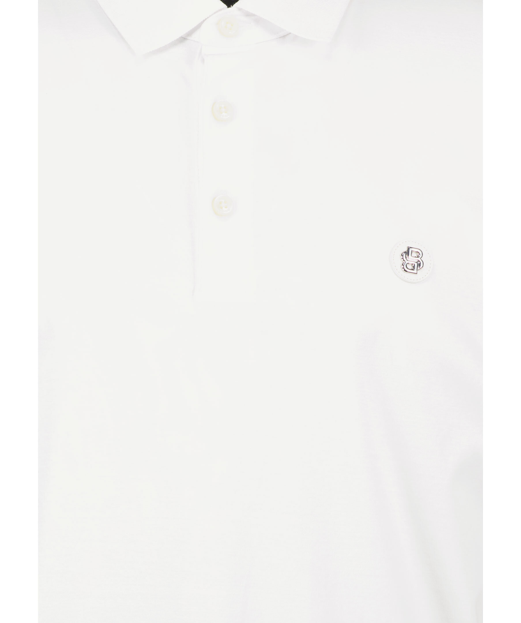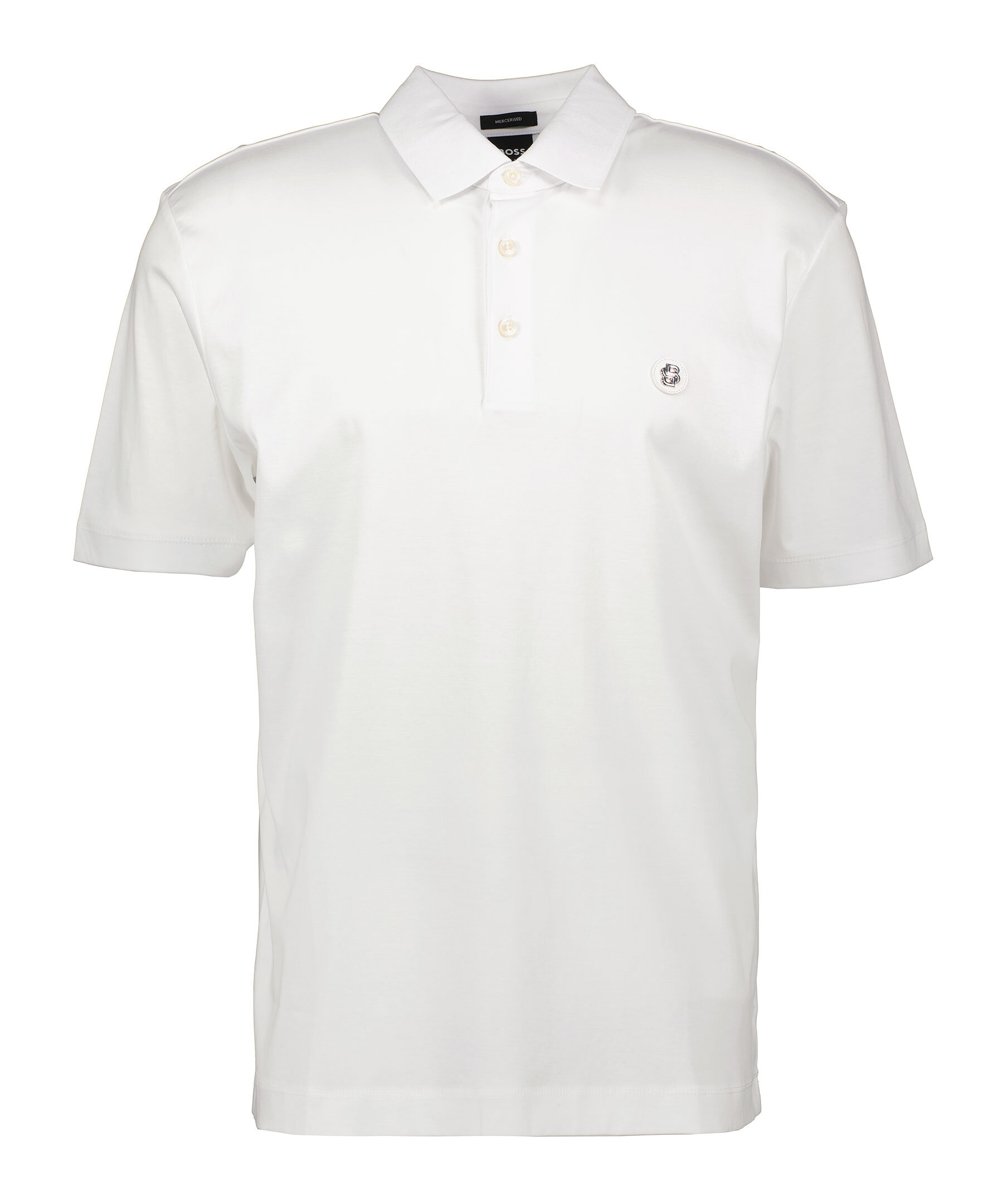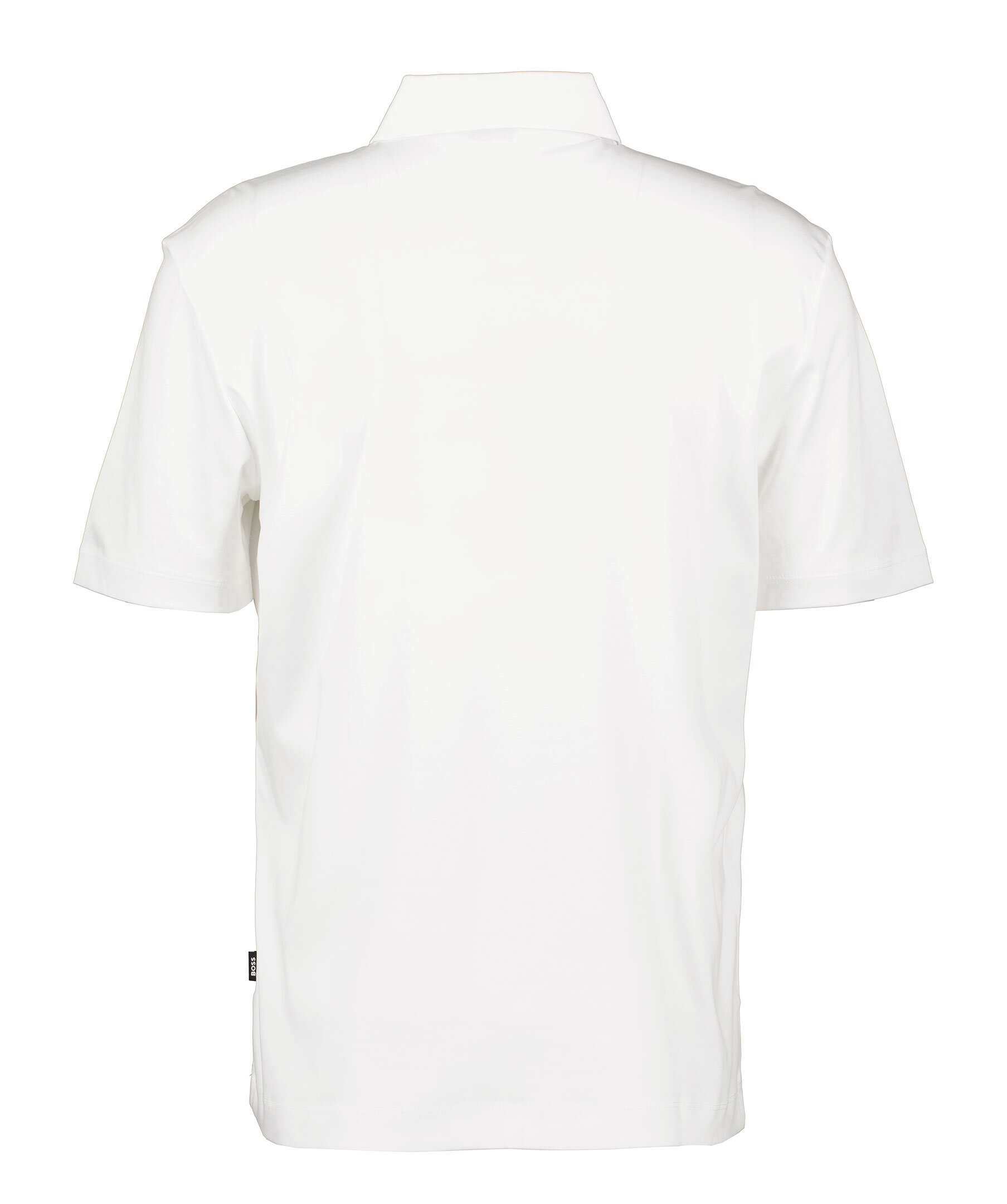 Vit piké från BOSS Black. Knappslå med tre knappar. Ribbstickad krage. Logotyp i läder och metall. Tillverkad i 100% Bomull.