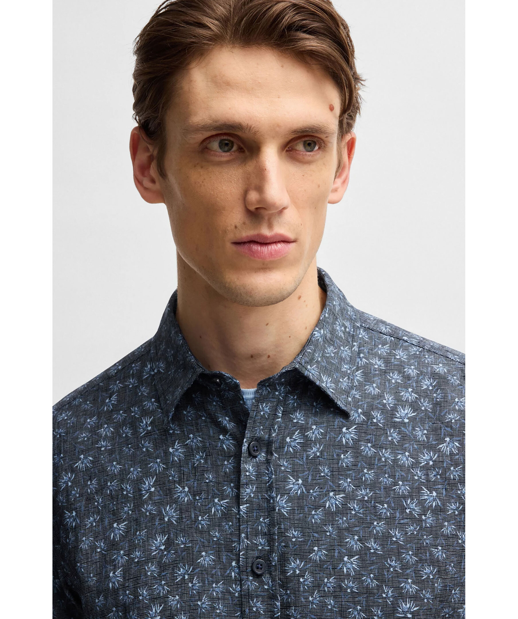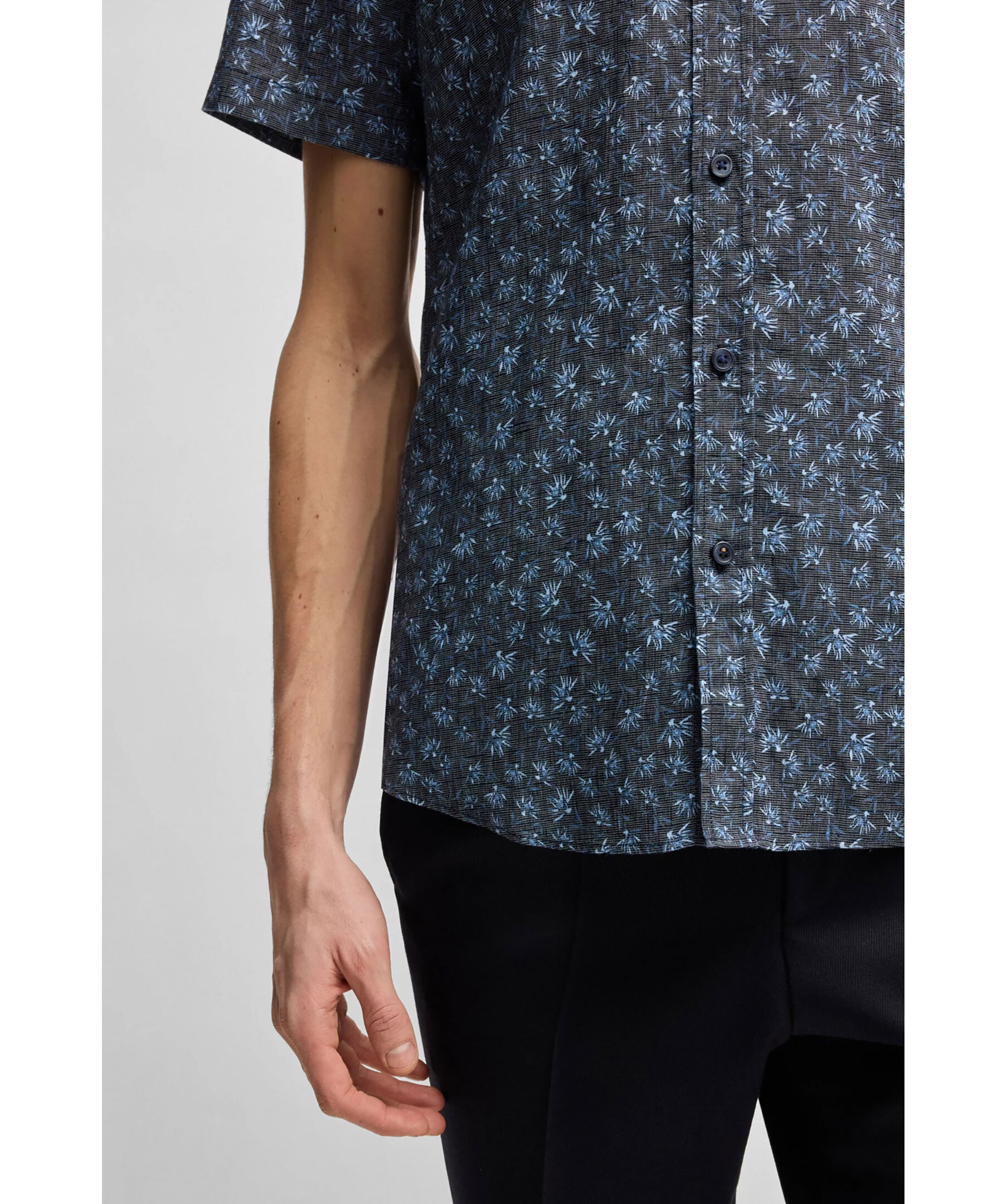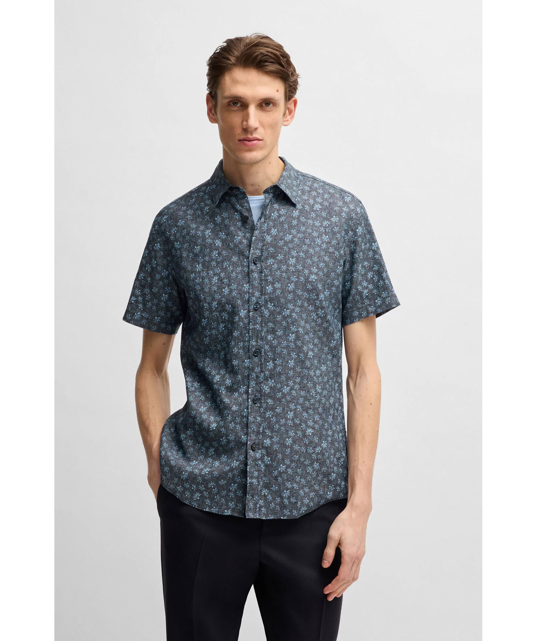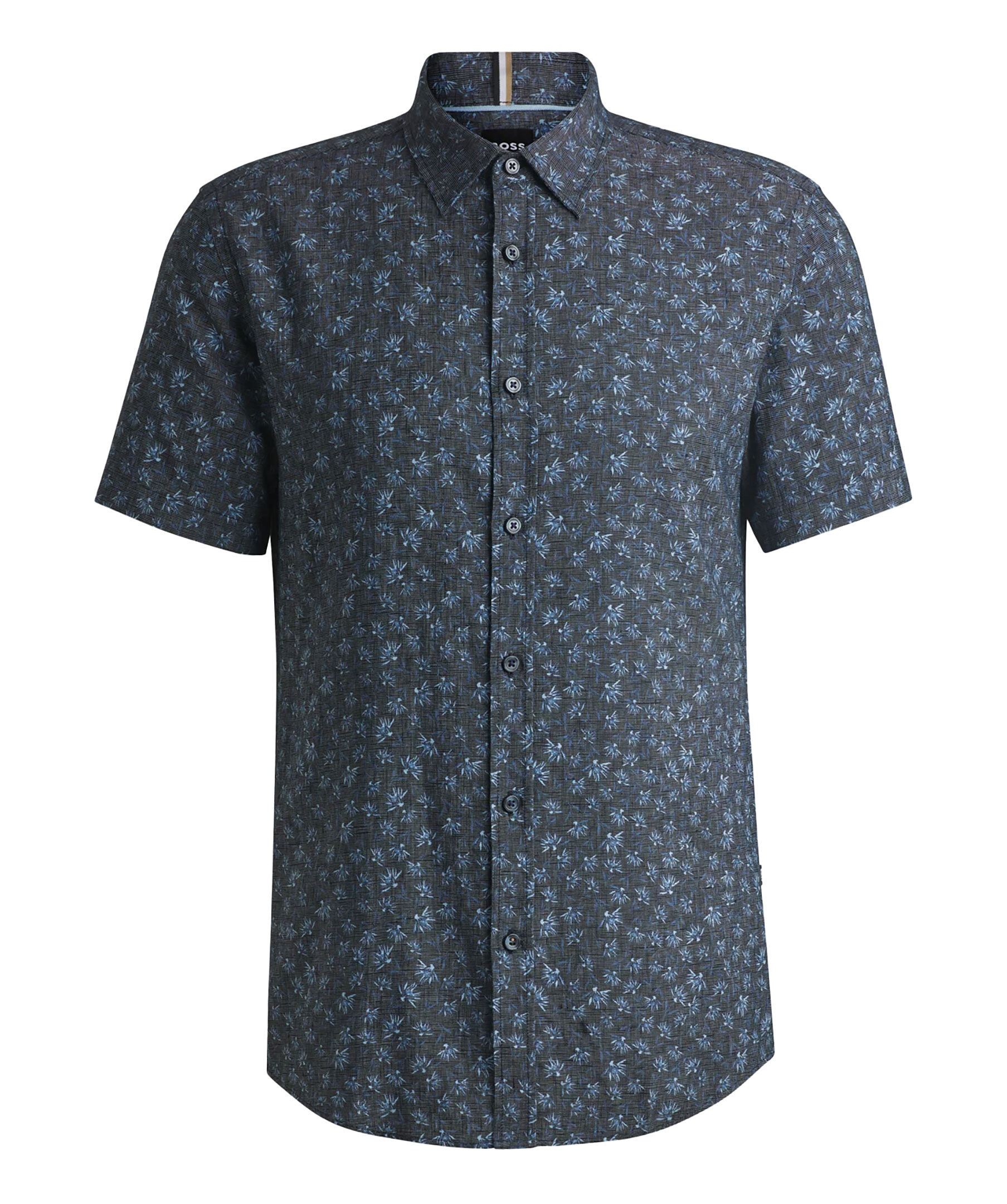 Mörkblå, blommönstrad skjorta i kortärmad modell från BOSS Black. Skjortan har kent-krage och är tillverkad i svalkande linne med stretch för komfort.