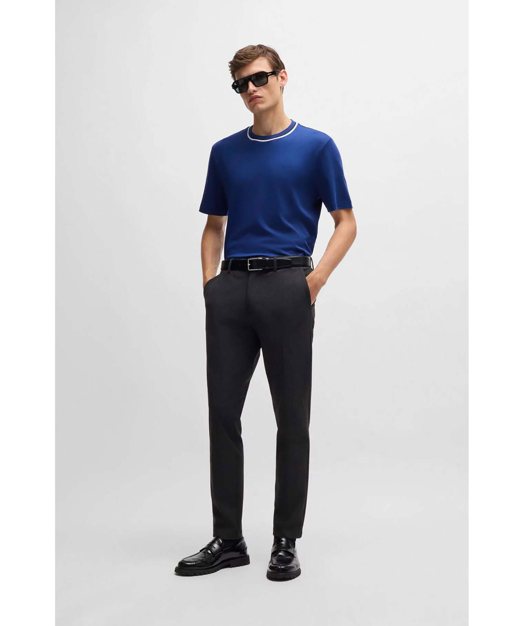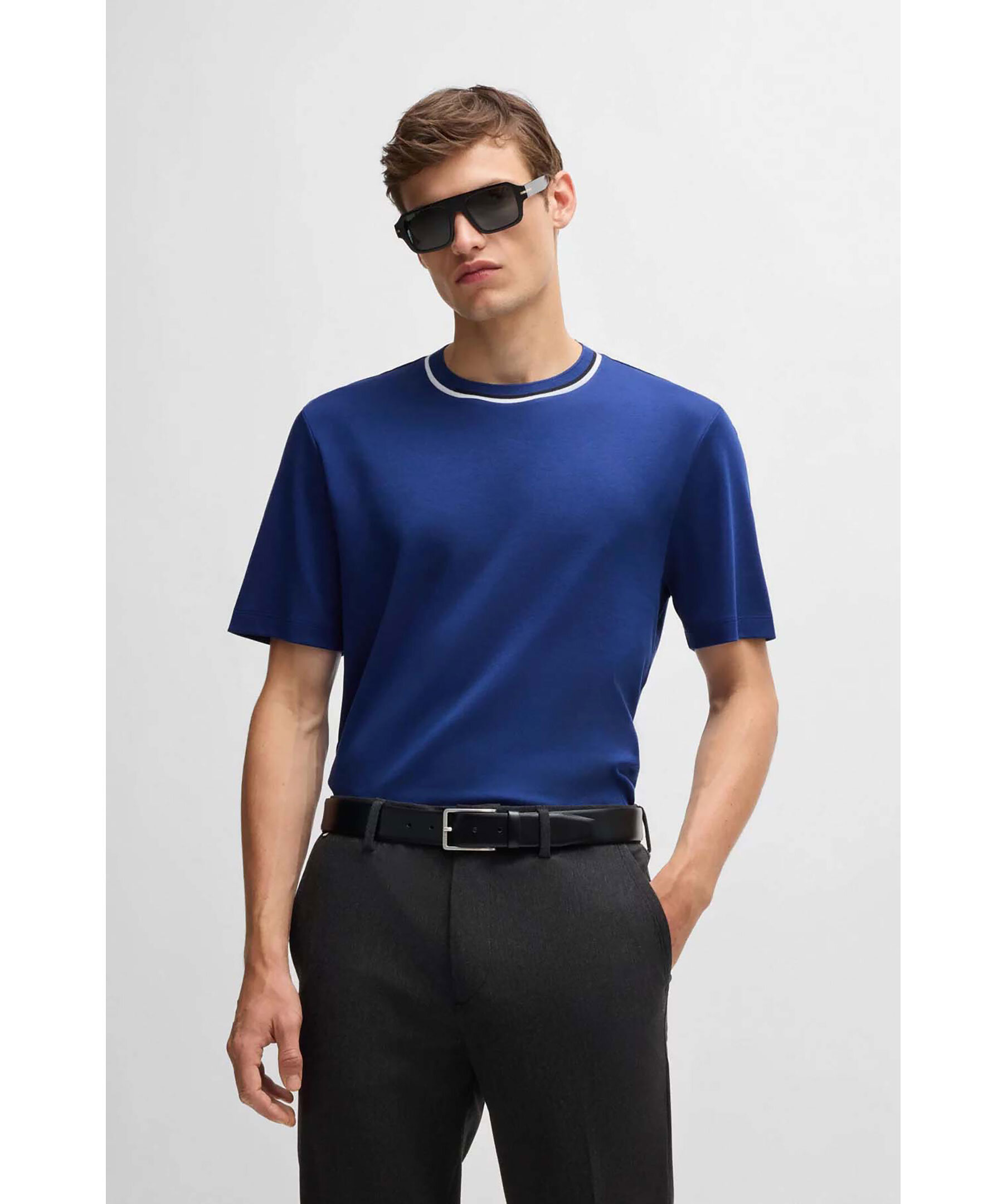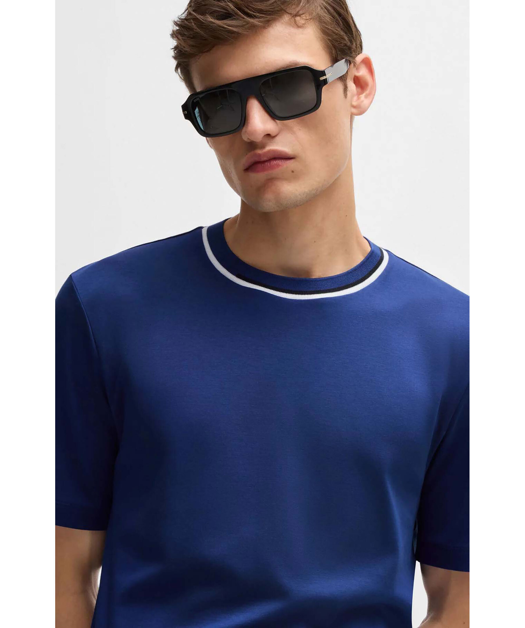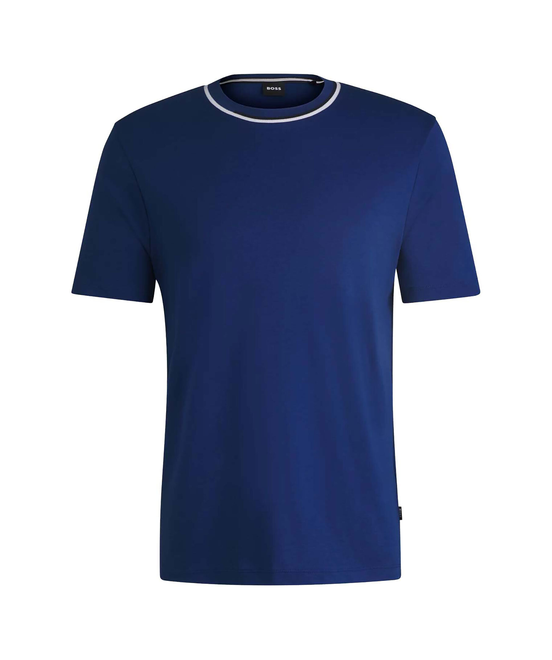 Blå bas T-shirt från Boss black. T-shirten har rundad halsringning med färgblockskrage. Tillverkad av 100% bomull.