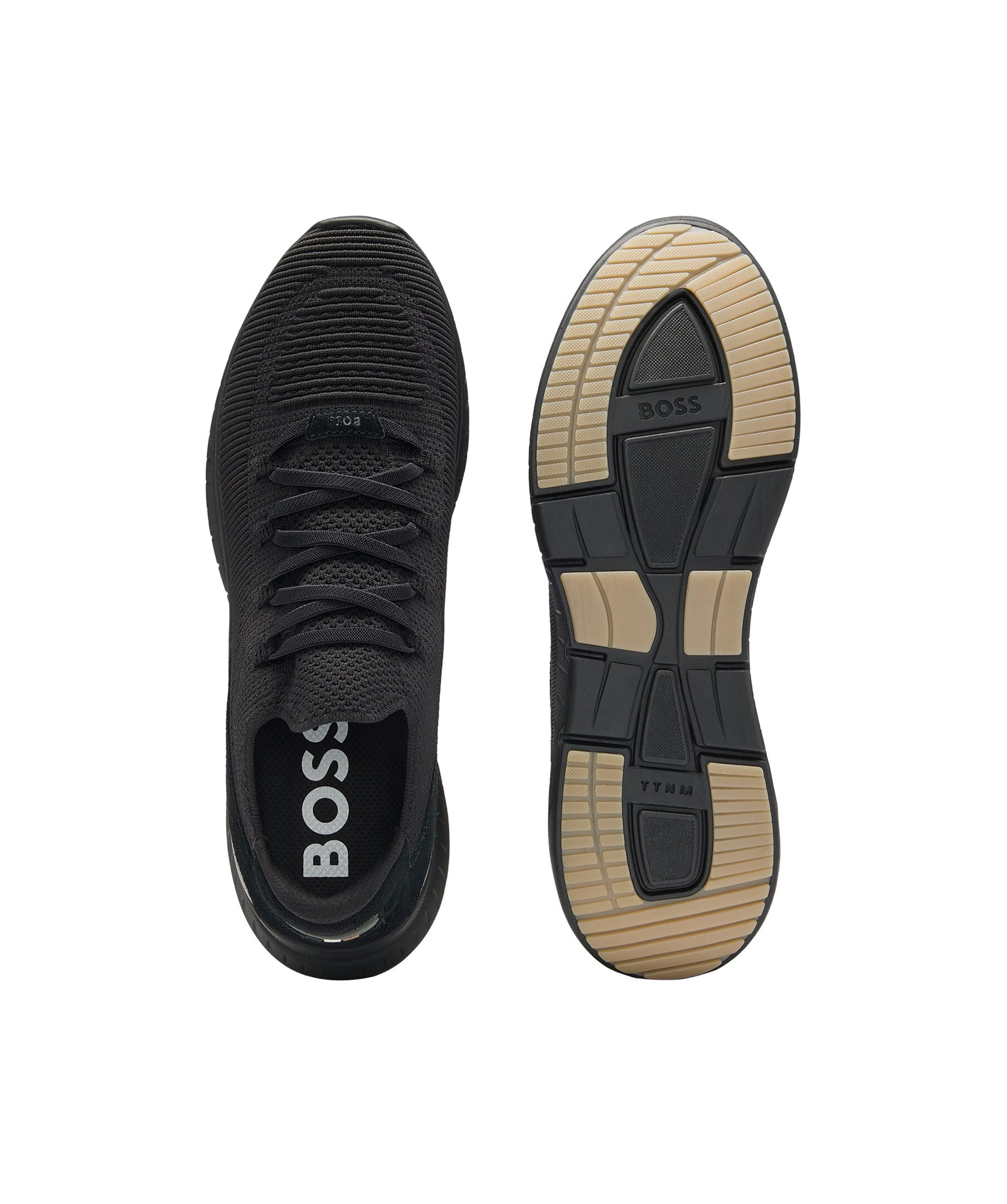 Svarta sneakers från BOSS Black. Skorna är lättviktsskor med snörning ovan och svart sula, tillverkade av återvunnen polyester.