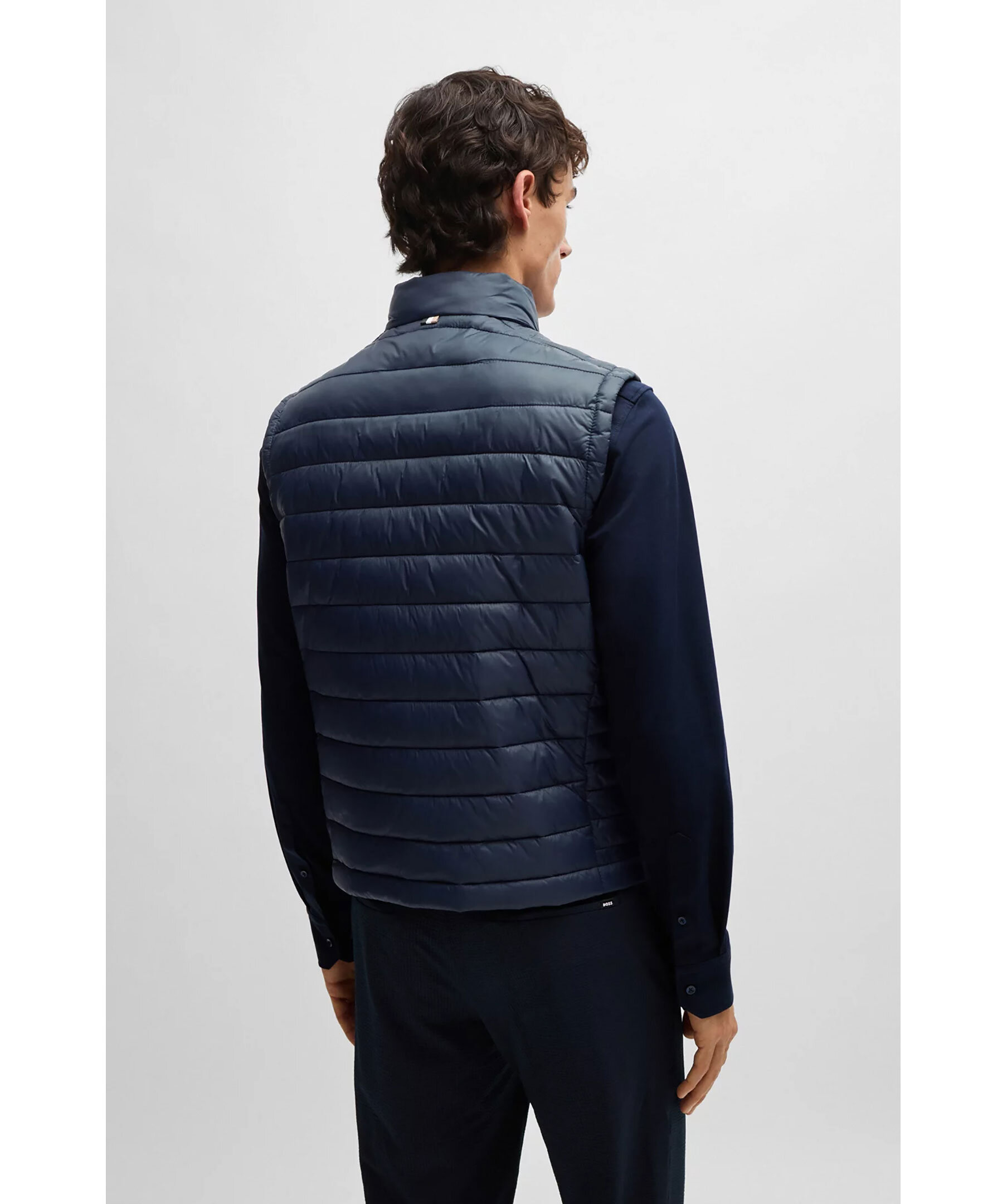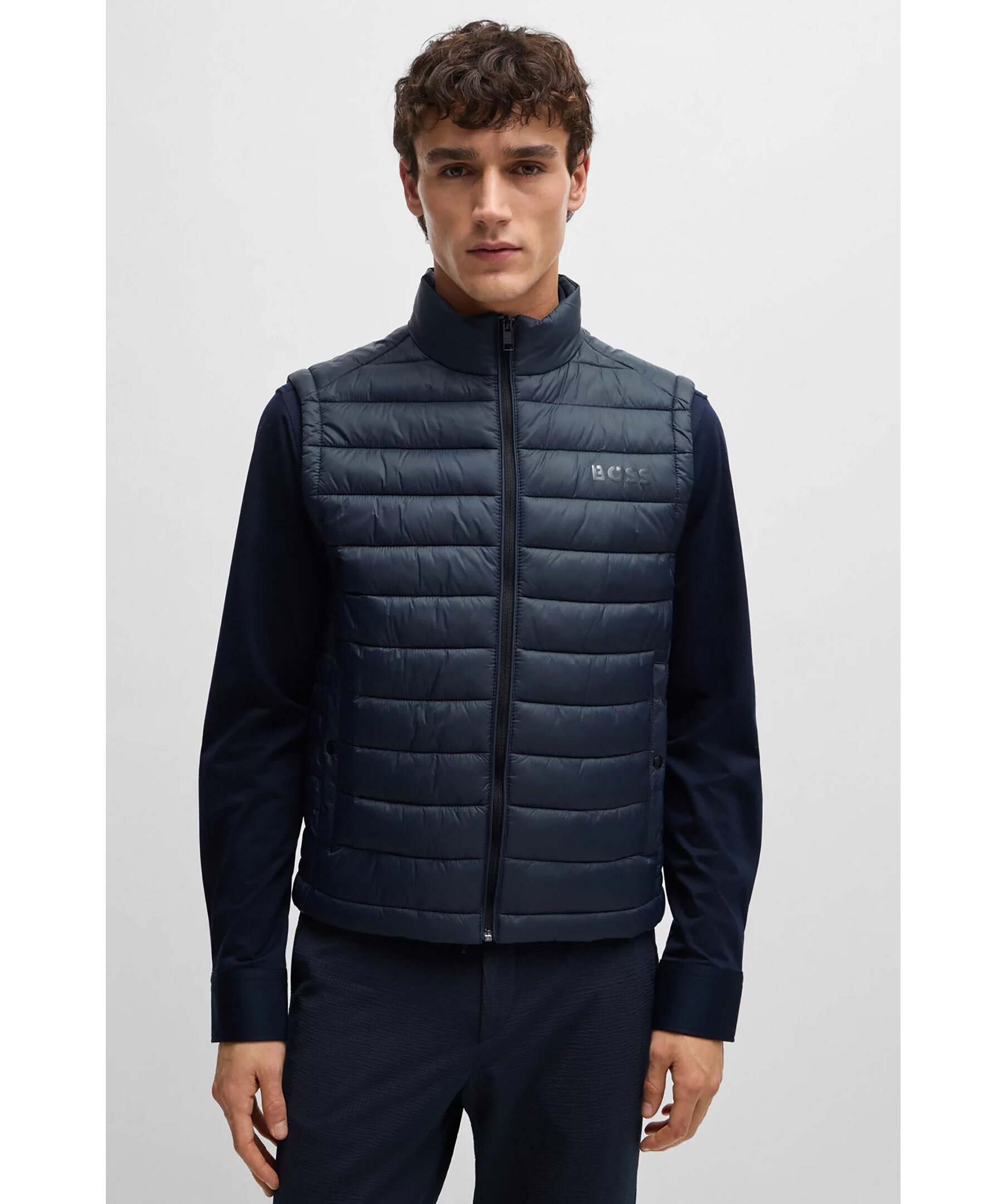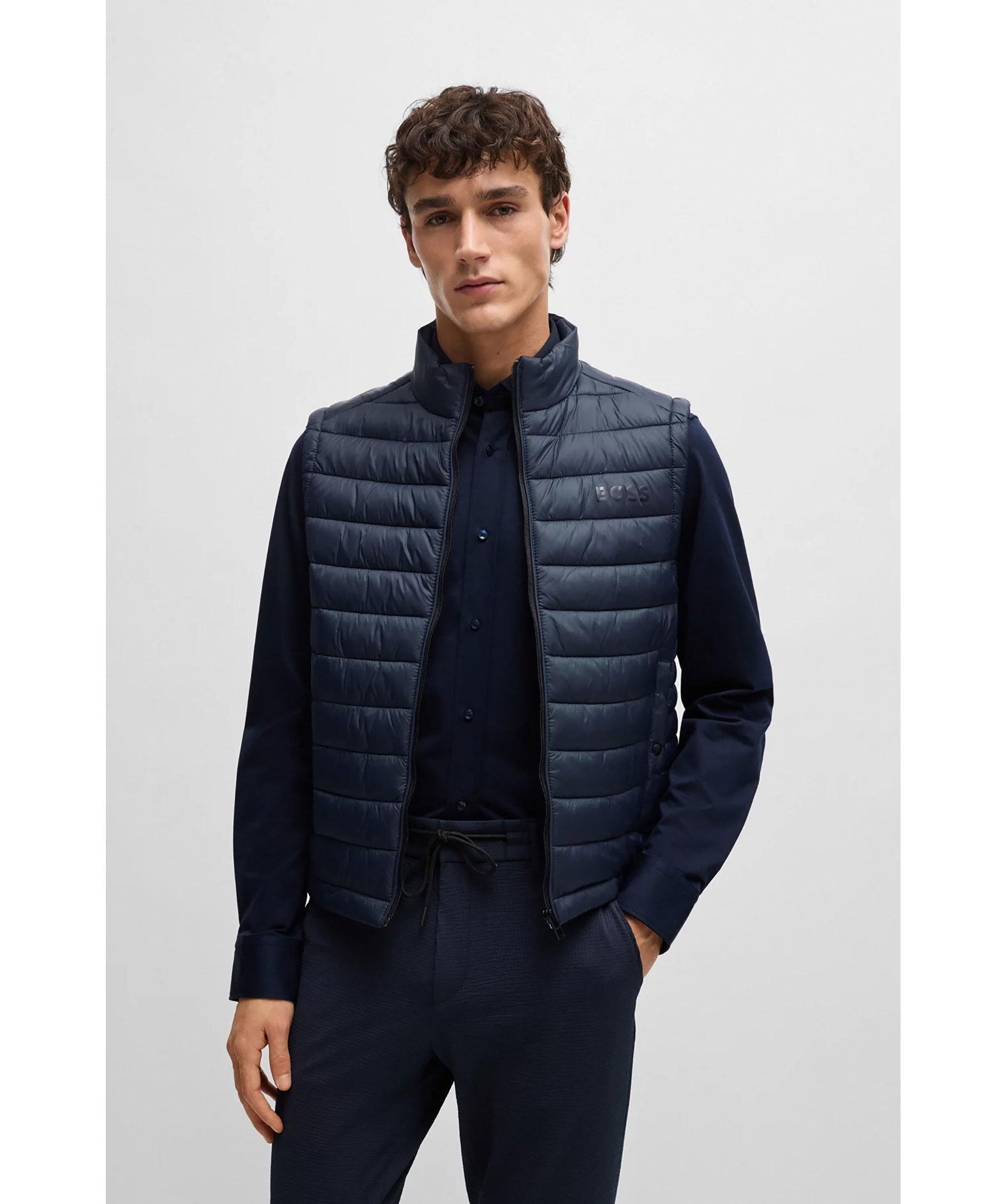 Mörkblå, ultralätt väst från BOSS Black. Västen är vattenavvisande, stängs med dragkedja och har två sidfickor. Tryckt med en BOSS-logga i en tonal effekt på vänster bröst. Tillverkad i polyamid.