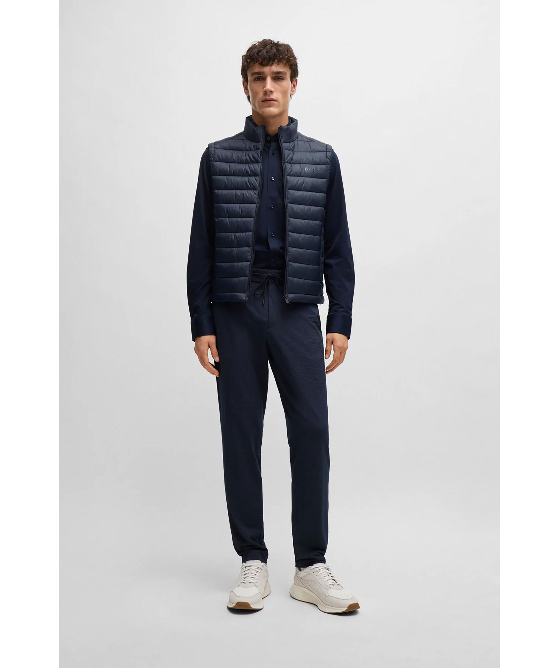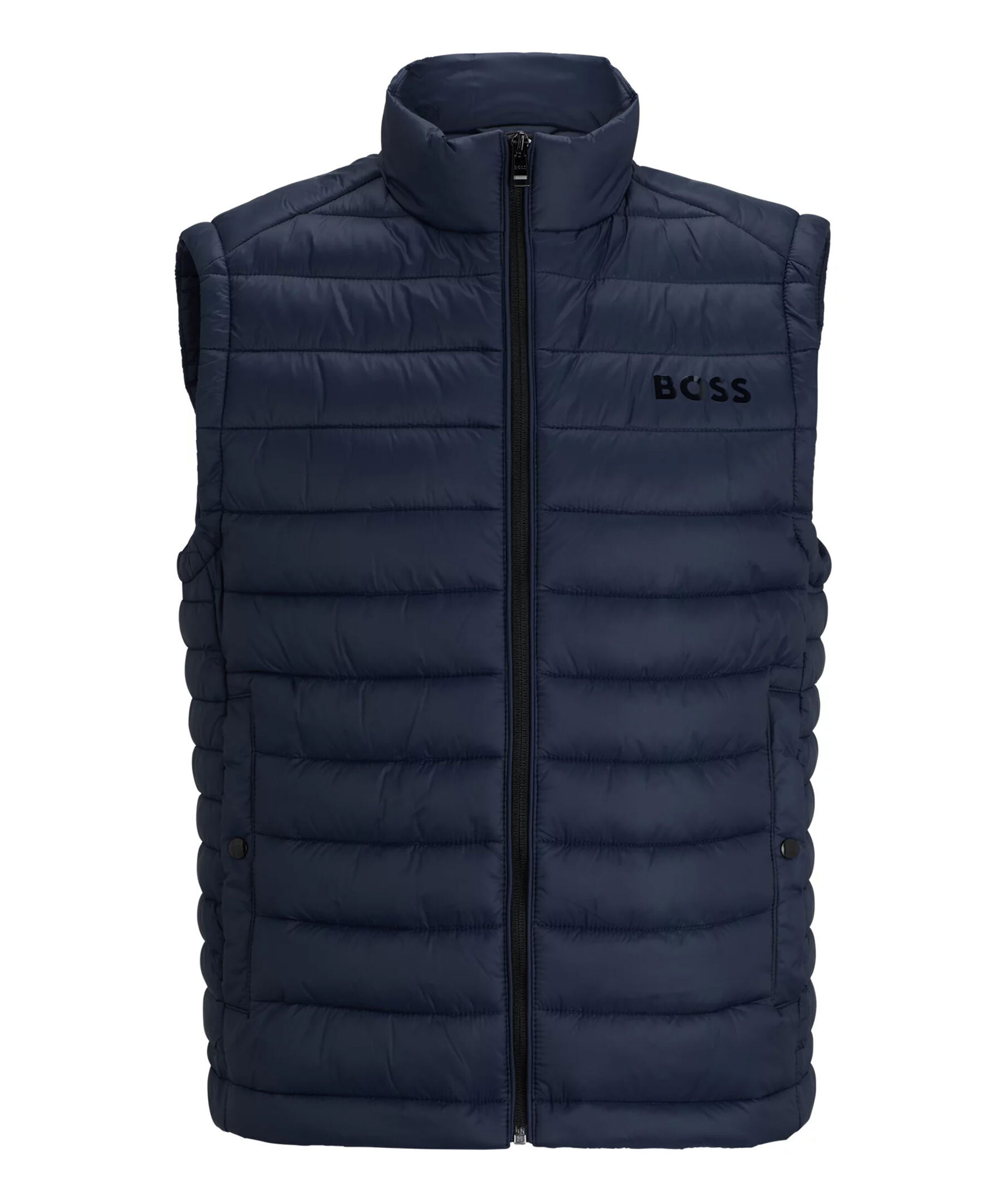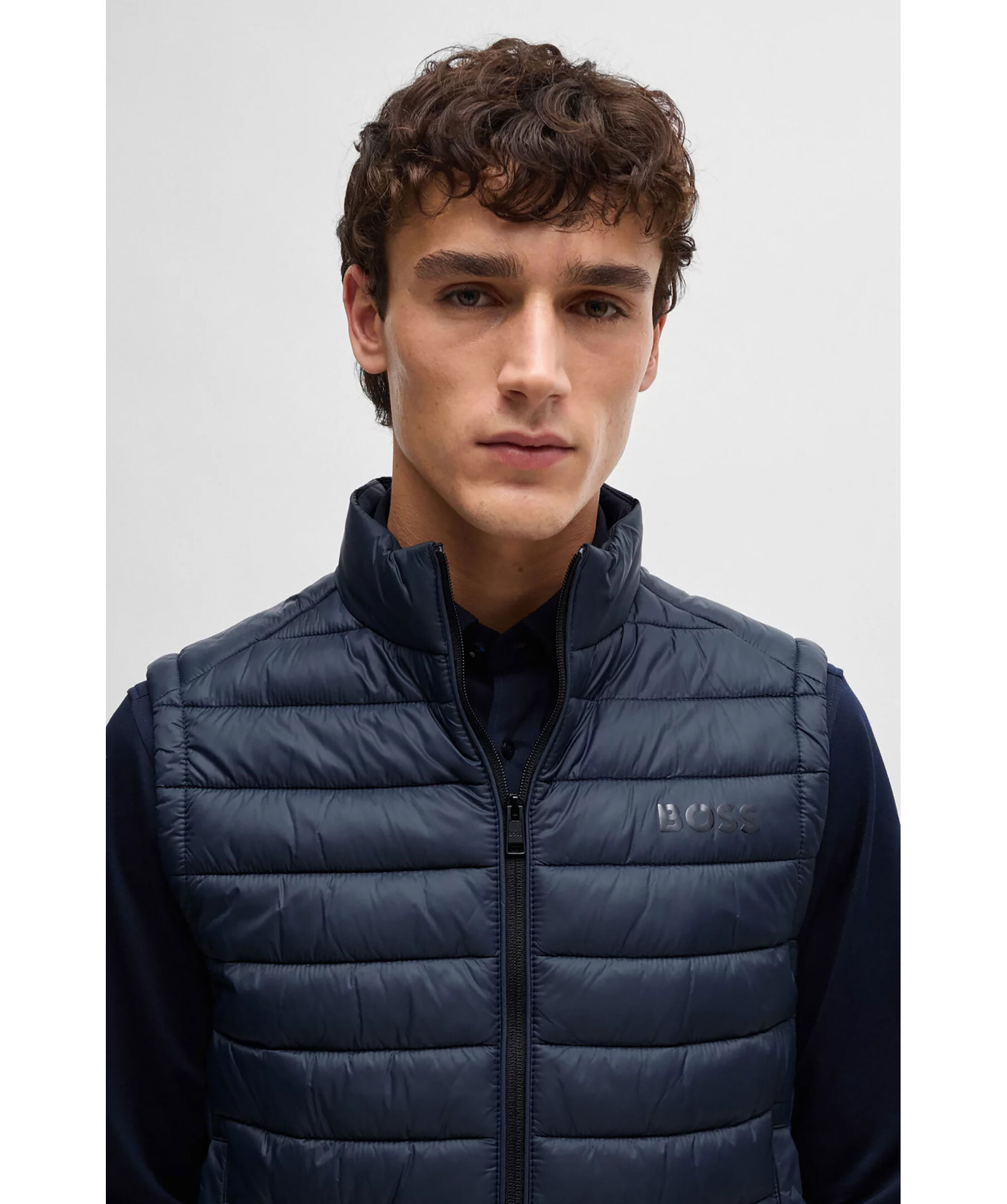 Mörkblå, ultralätt väst från BOSS Black. Västen är vattenavvisande, stängs med dragkedja och har två sidfickor. Tryckt med en BOSS-logga i en tonal effekt på vänster bröst. Tillverkad i polyamid.