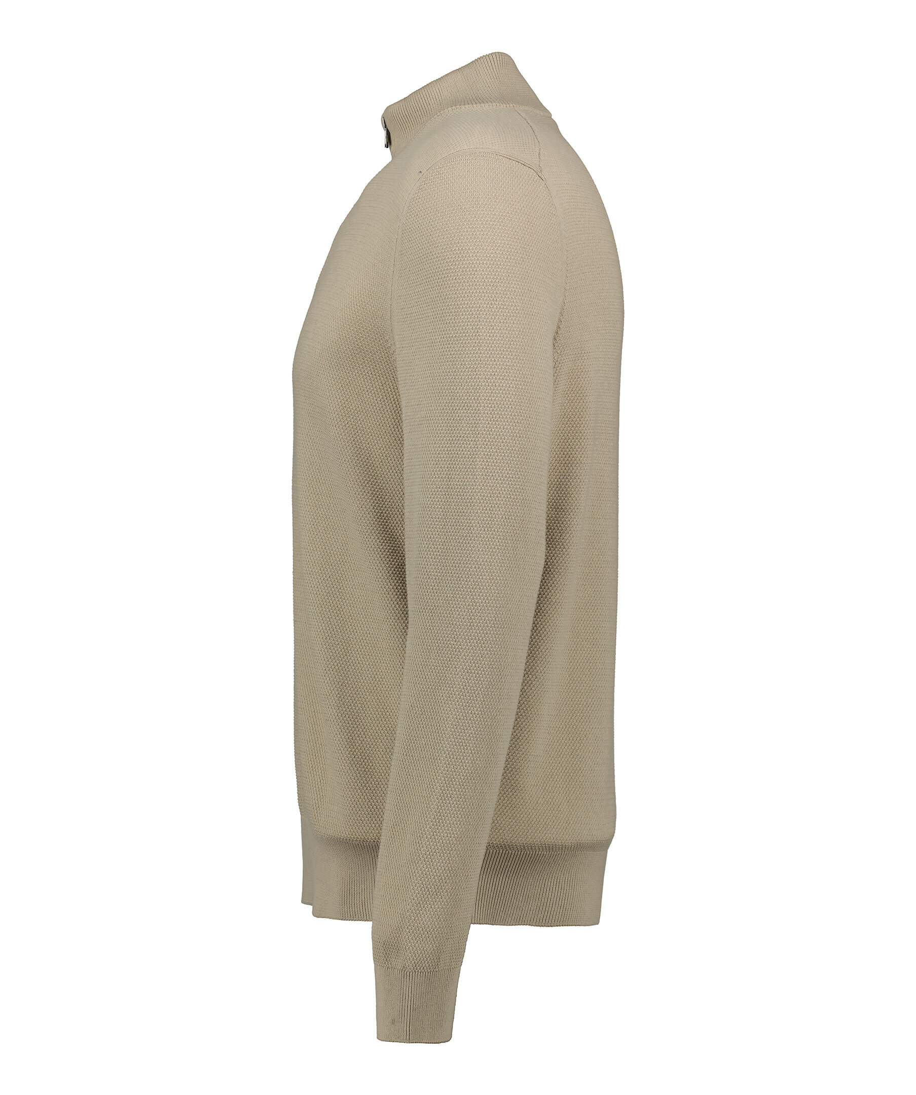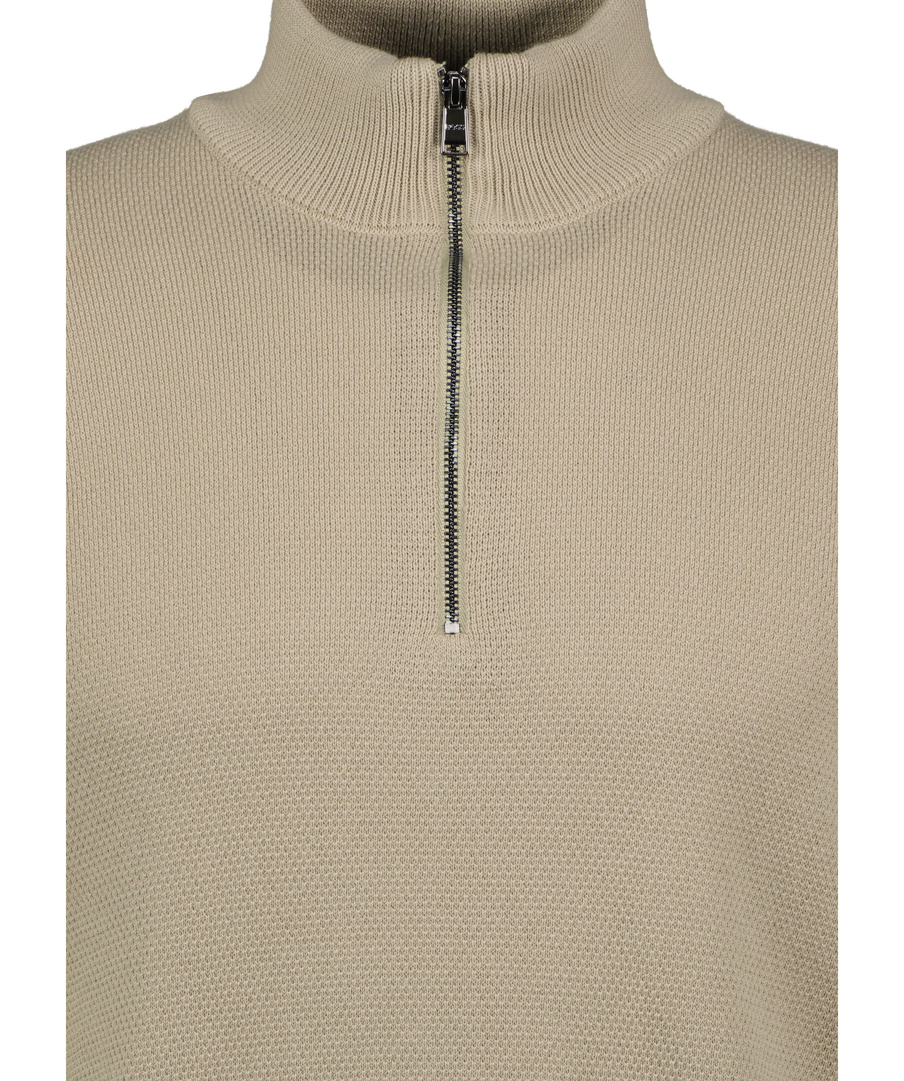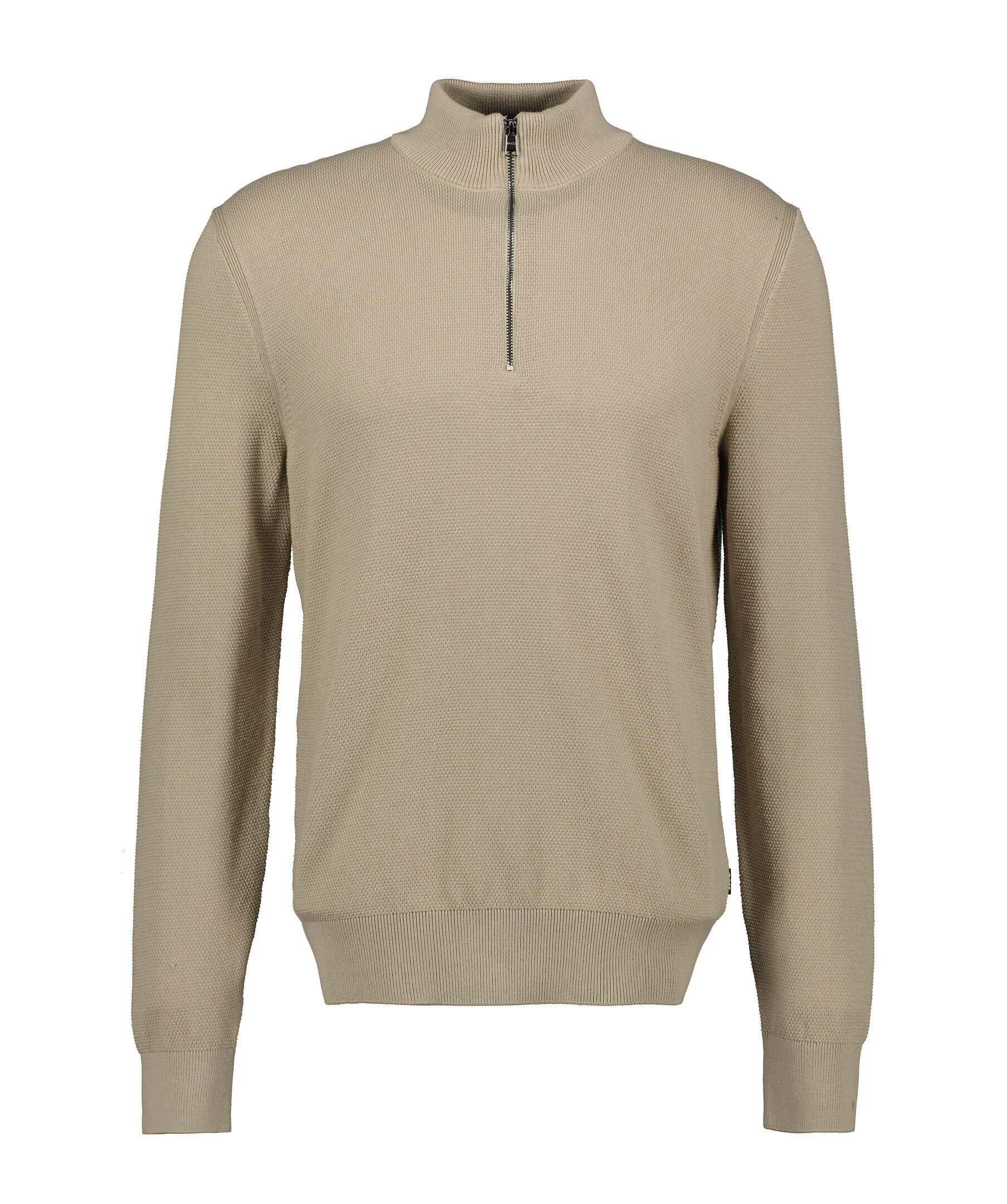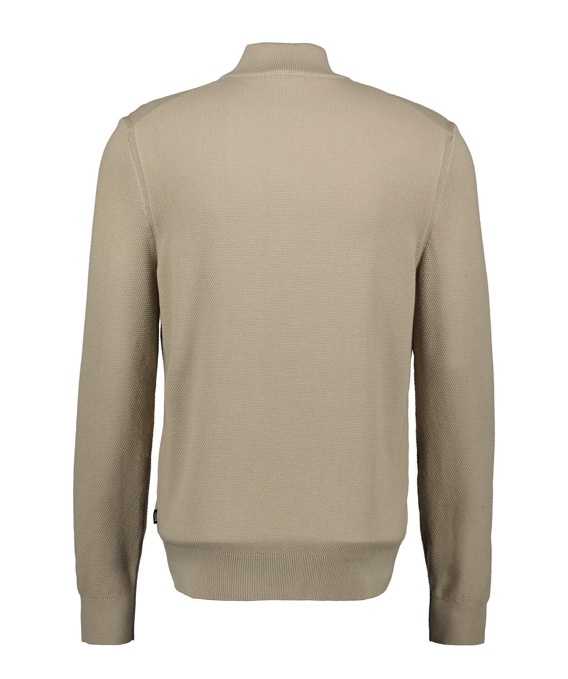 Beige stickad tröja från BOSS Black. Tröjan har en stickad mikrostruktur och blixtlåsförsedd halsringning med deras färger i innerkragen. Ribbade manschetter. Det här plagget är tillverkat av ekologisk bomull. Normal passform.