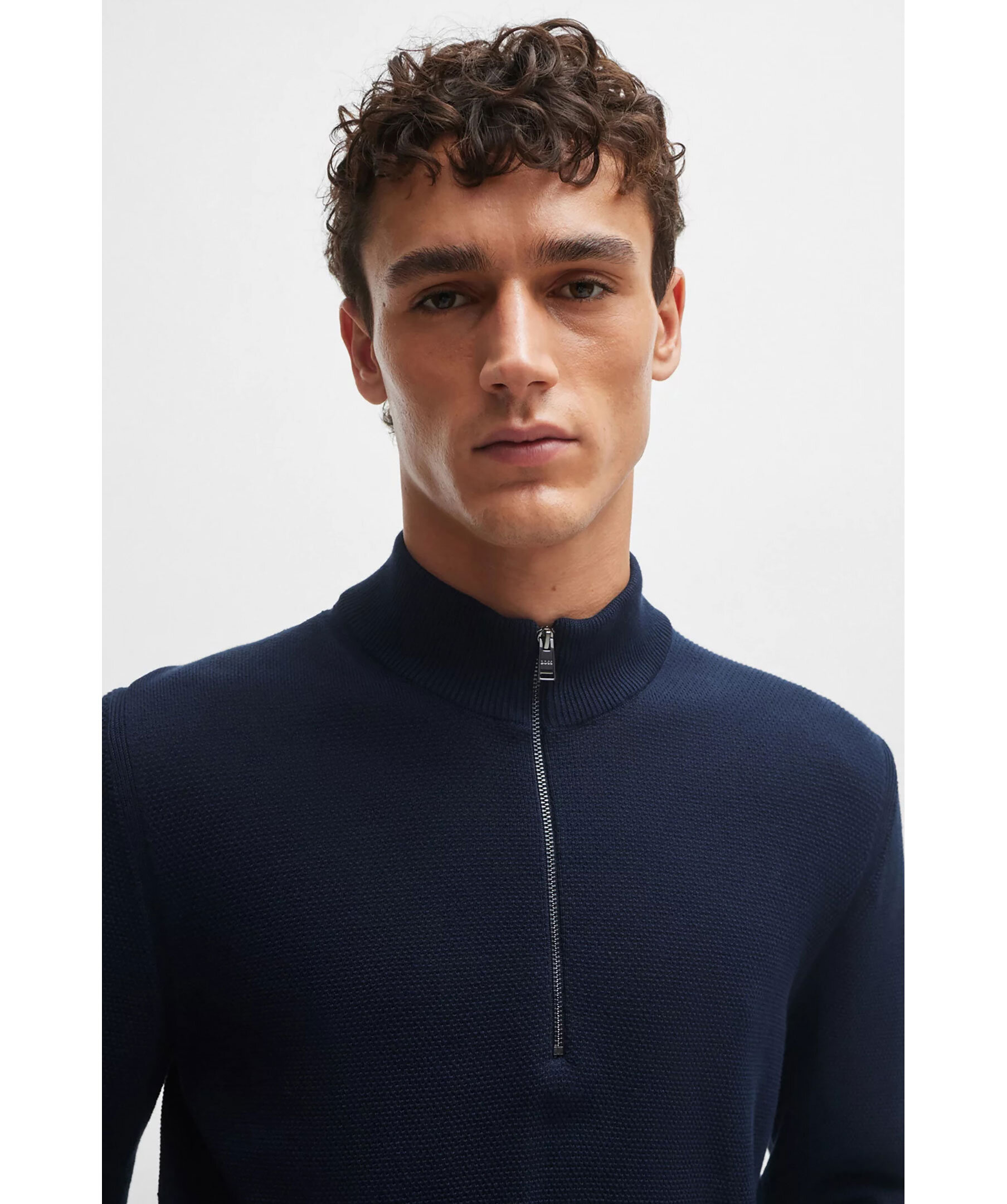 Marinblå stickad tröja från BOSS Black. Tröjan har en stickad mikrostruktur och blixtlåsförsedd halsringning med deras färger i innerkragen. Ribbade manschetter. Det här plagget är tillverkat av ekologisk bomull. Normal passform.