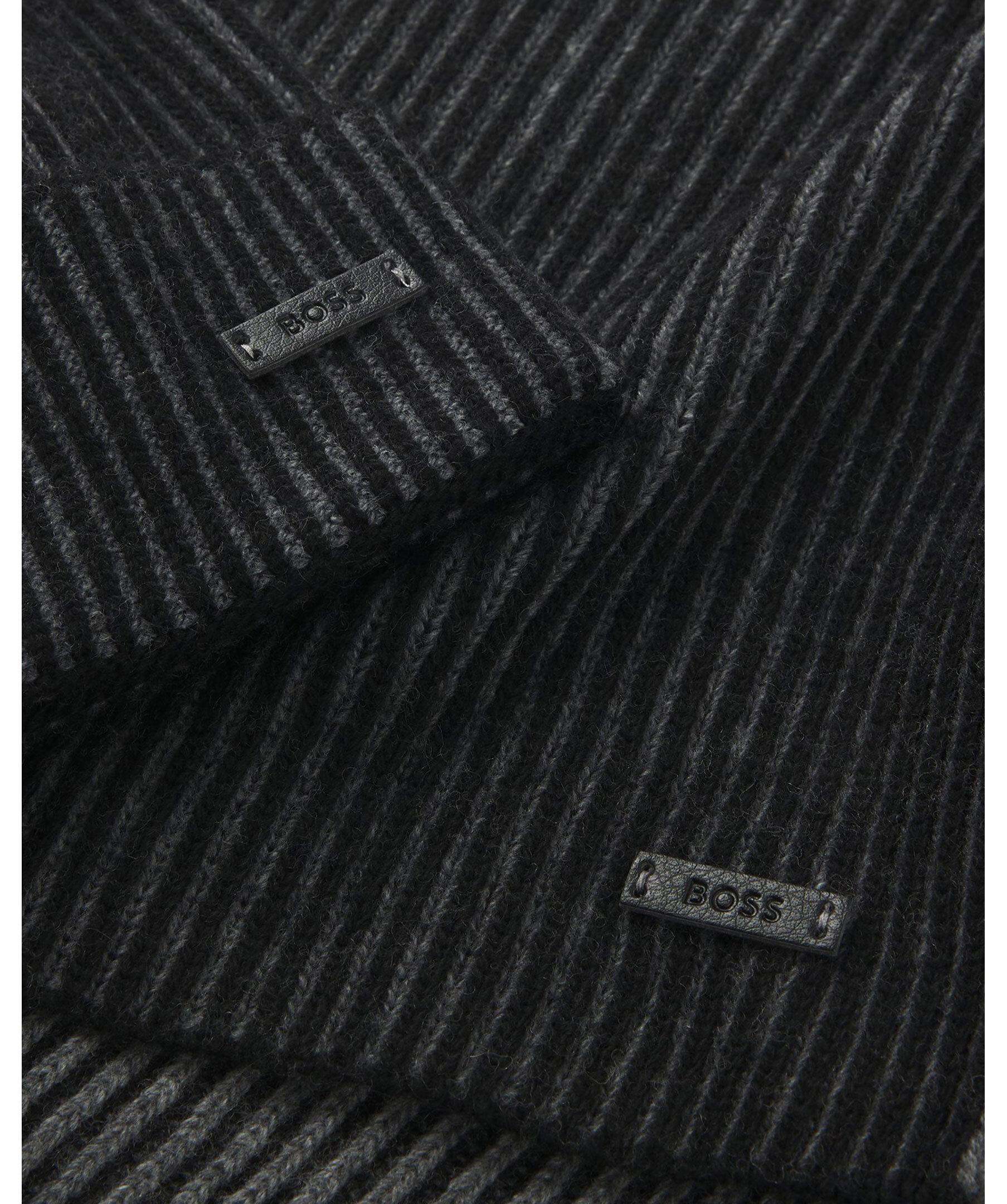 Detta set från BOSS innehåller en stickad mössa och en halsduk i två nyanser, båda tillverkade av en varm ullblandning med inslag av lyxig kashmir. Setet levereras i en elegant presentförpackning, vilket gör det till en utmärkt gåva. Mössan och halsduken är designade med subtila logodetaljer och har en mått på halsduken: 180 x 25 cm. Perfekt för att hålla värmen under kalla vinterdagar med stil.