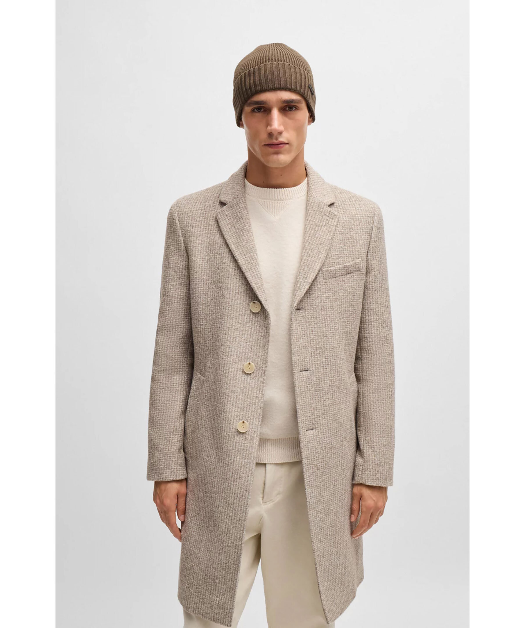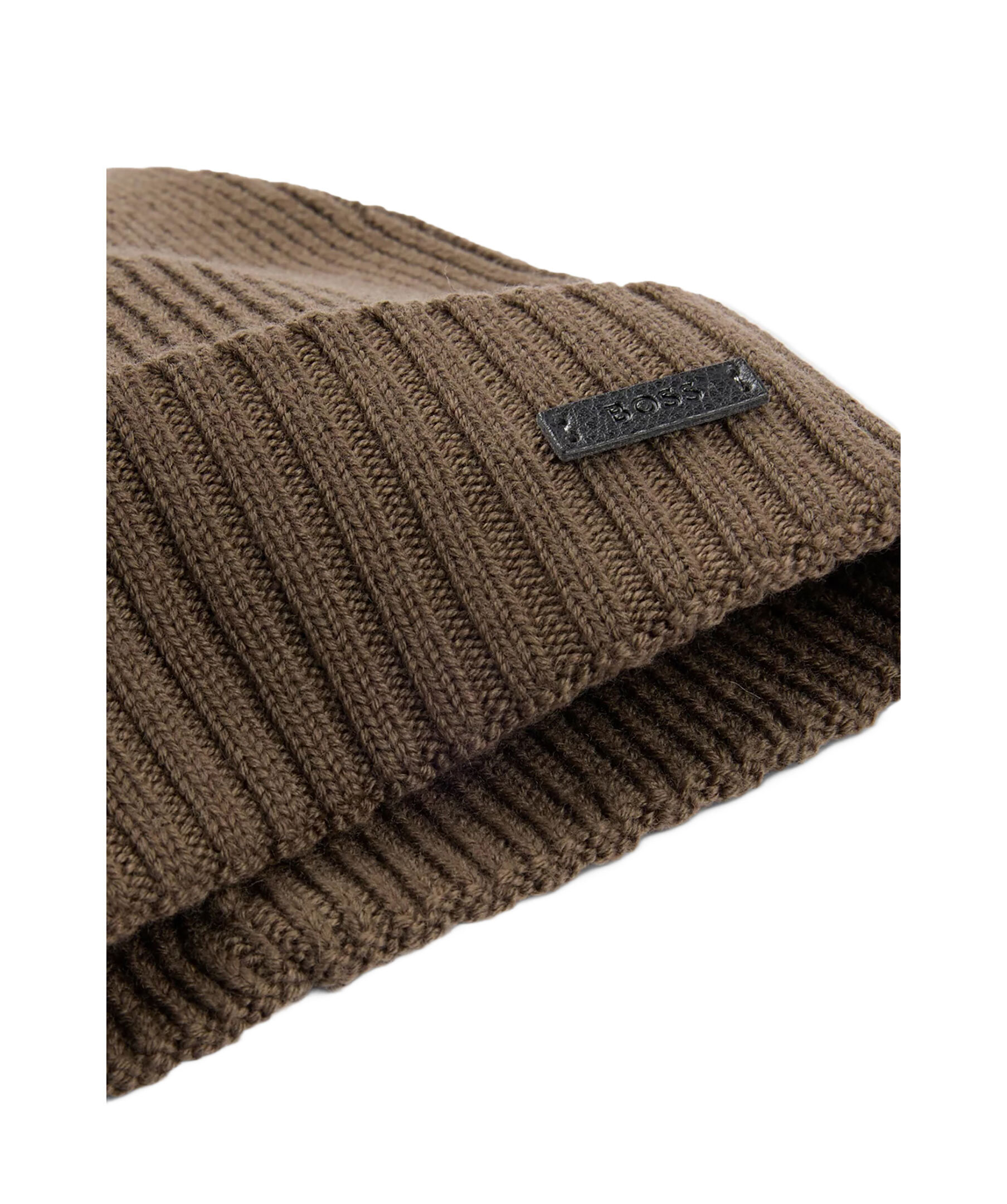 Stickad mössa från BOSS Black gjord i 100% ull. Uppvikt kant och en liten metall logotyp.