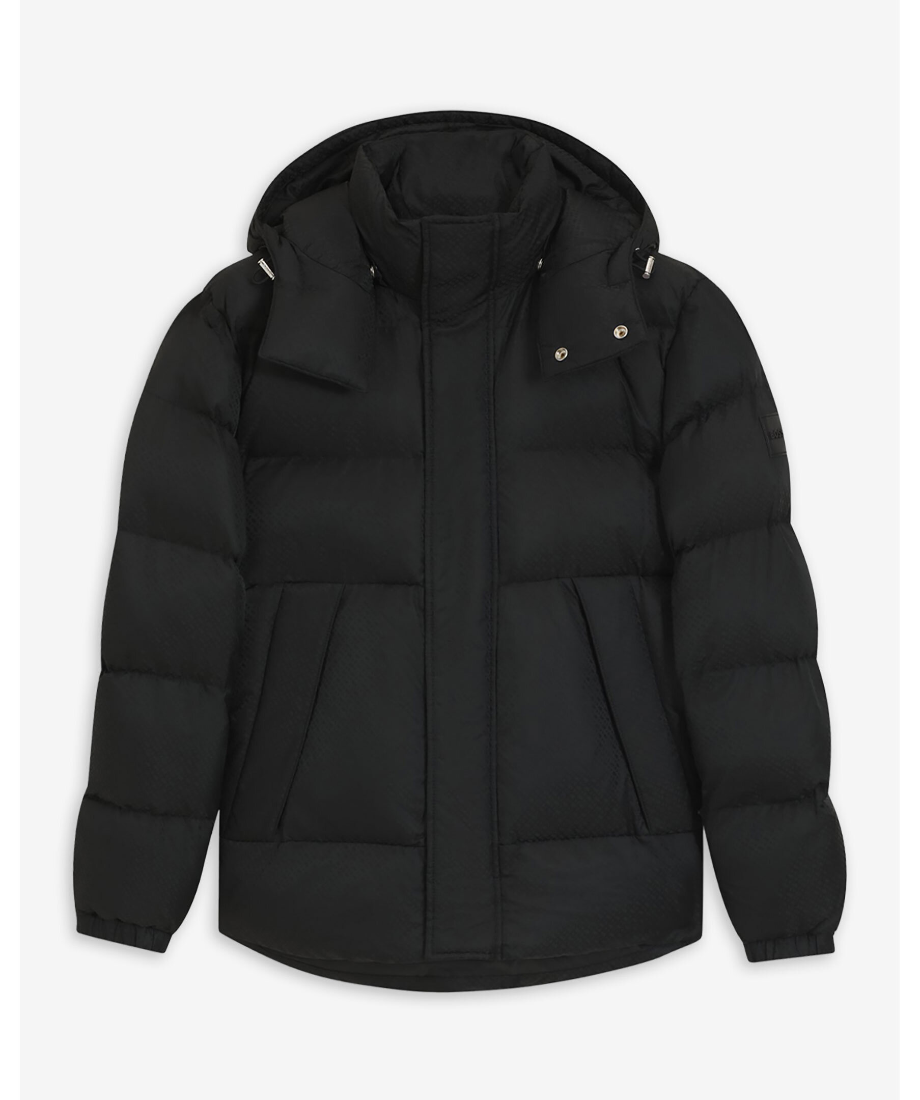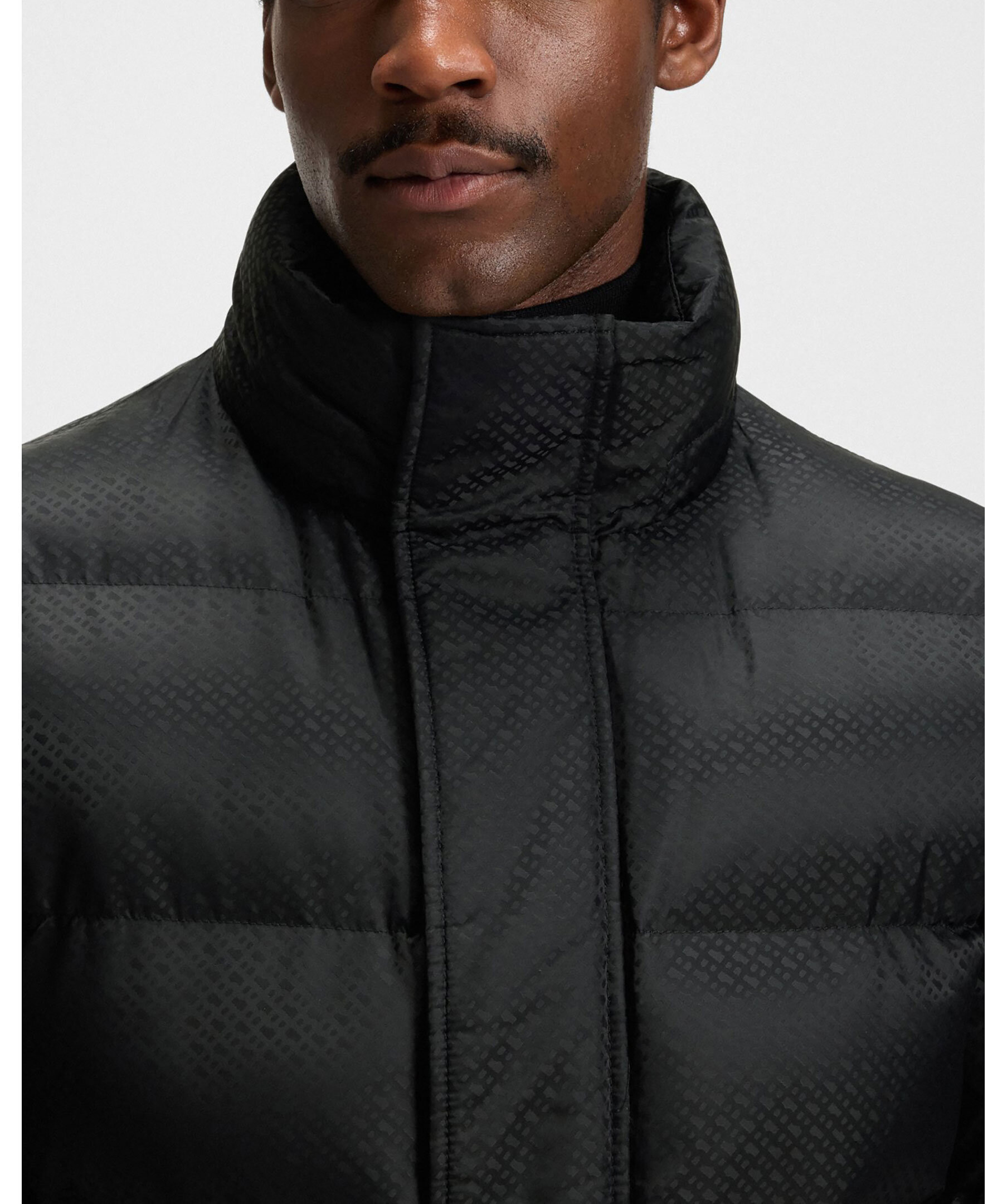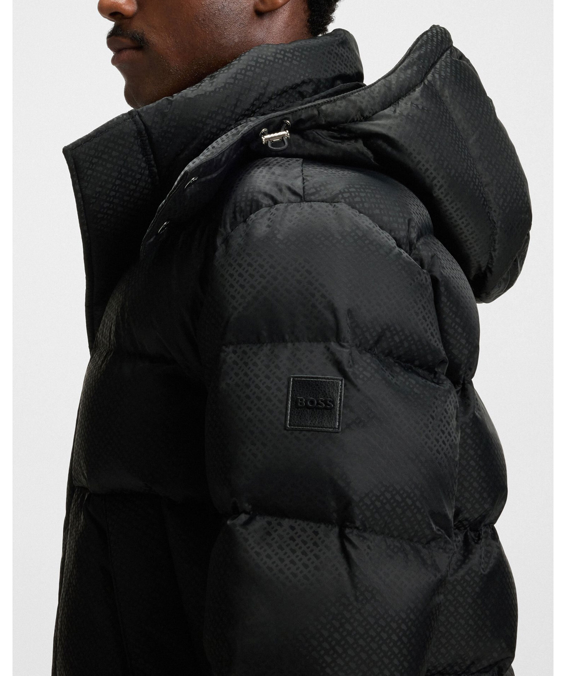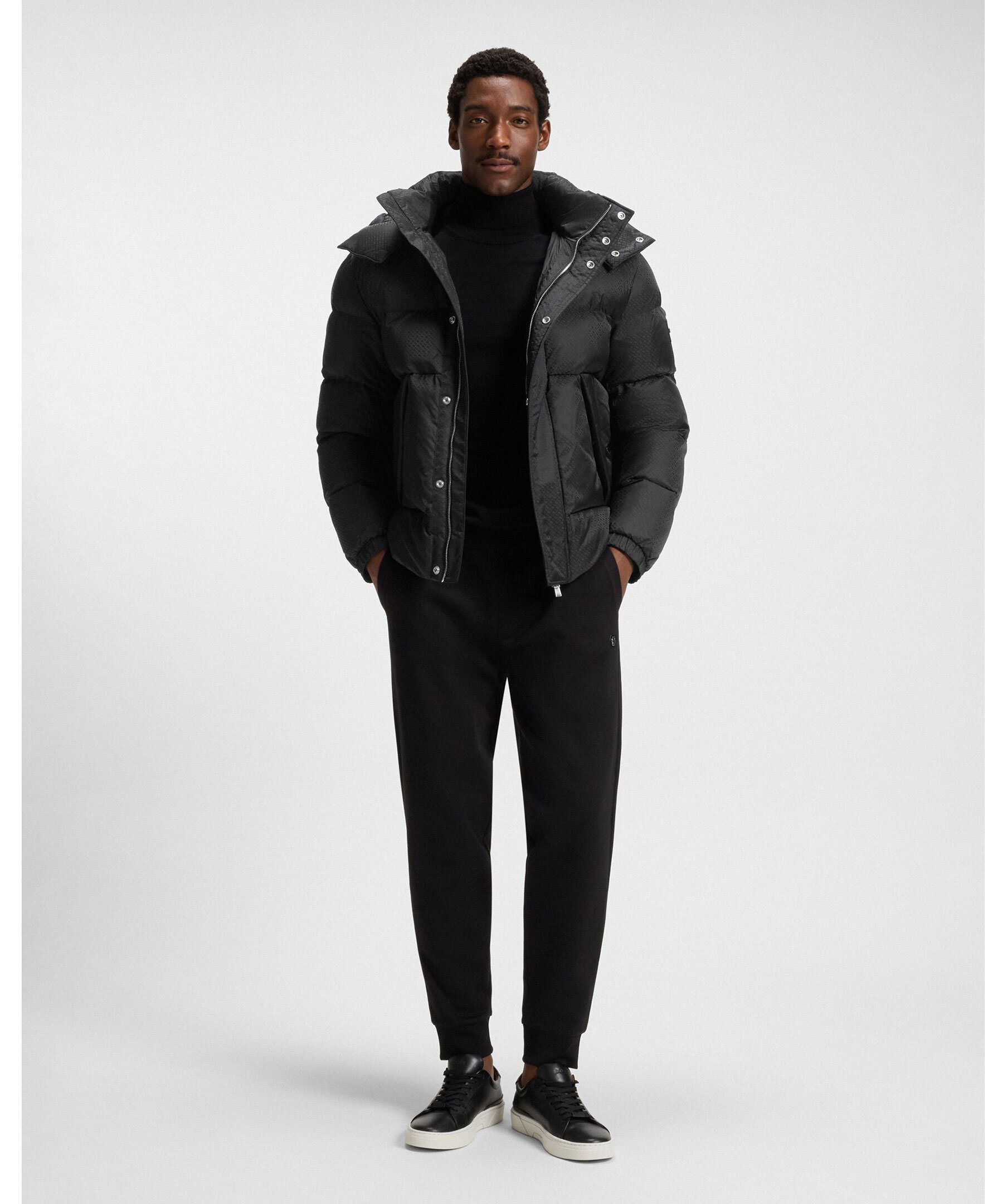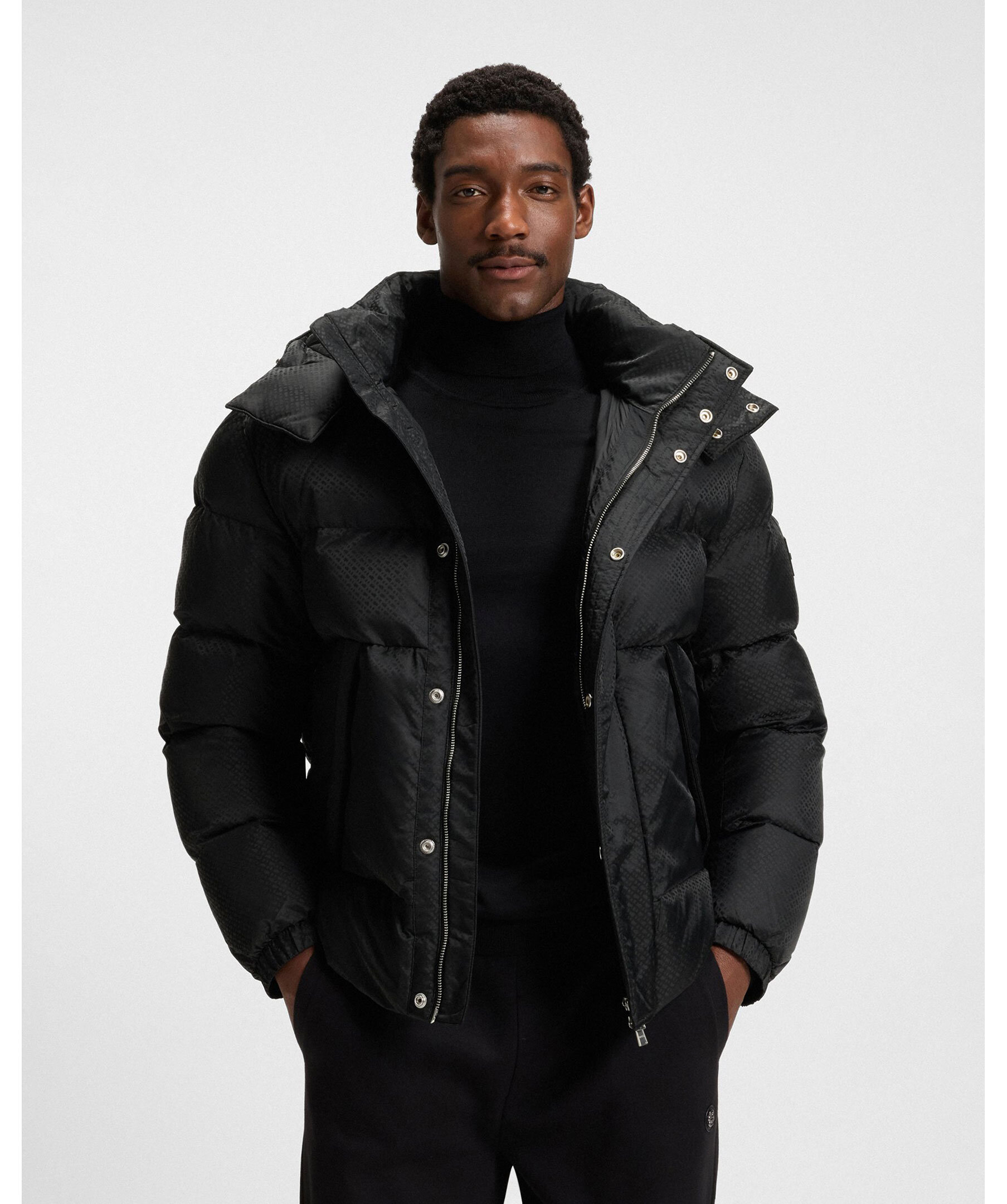 Svart vadderad puffer från BOSS. Vattenavvisande tyg med distinkta mikromonogram. Avtagbar luva, sneda framfickor och logga på vänster ärm.