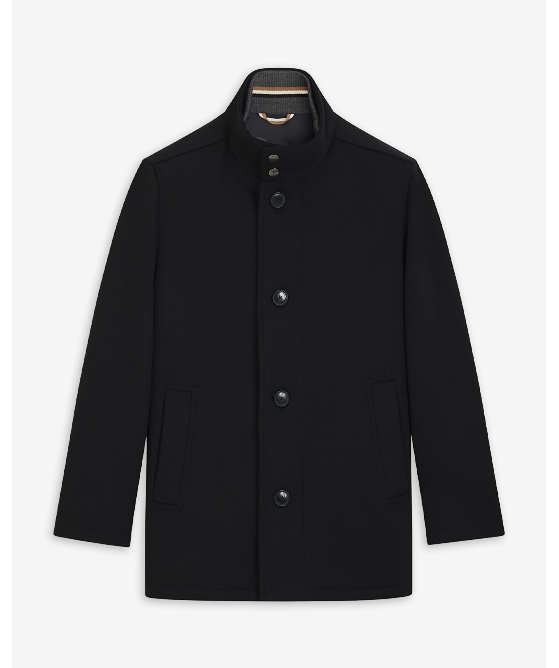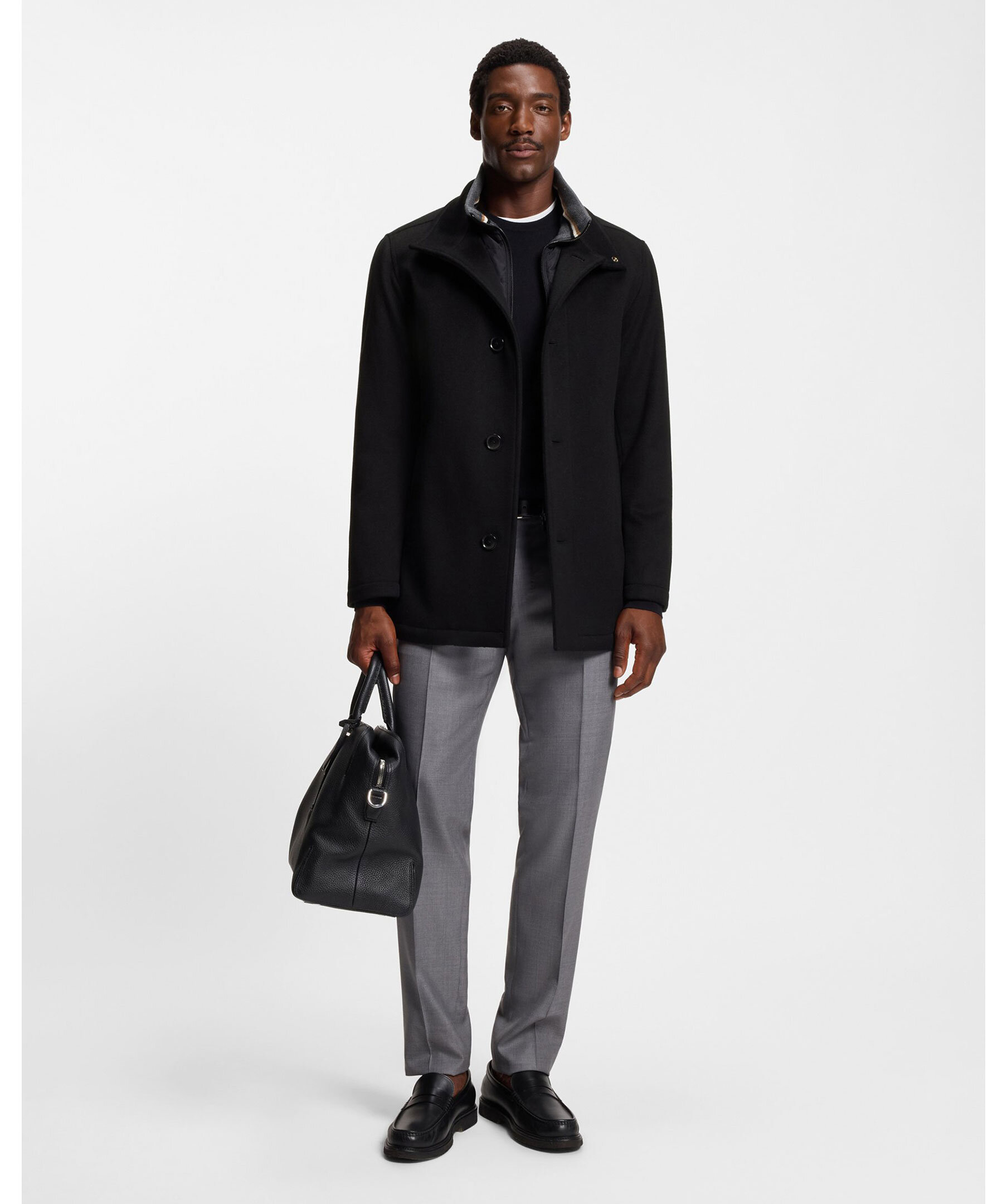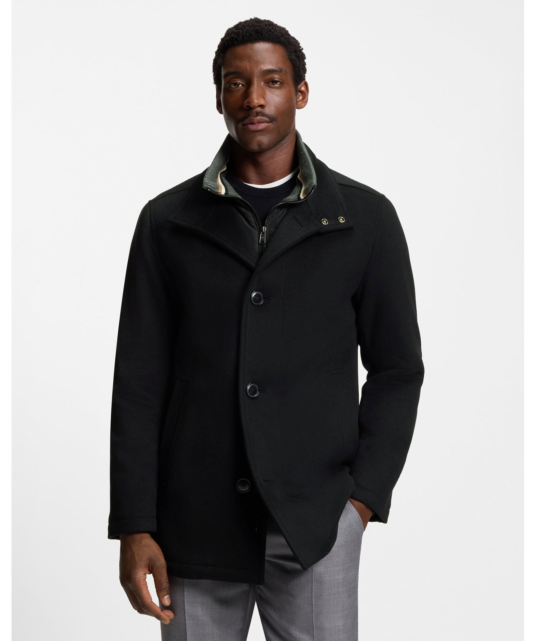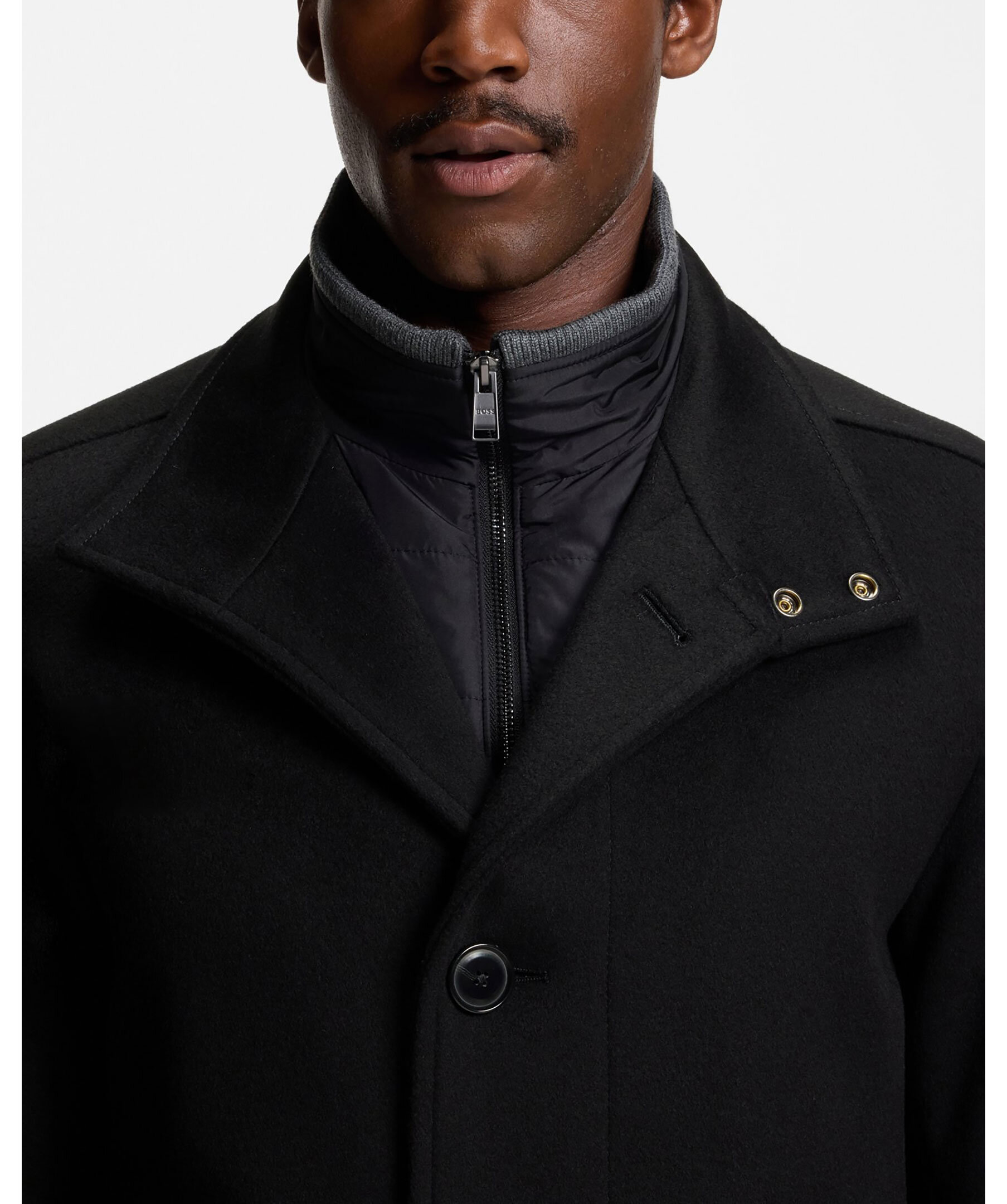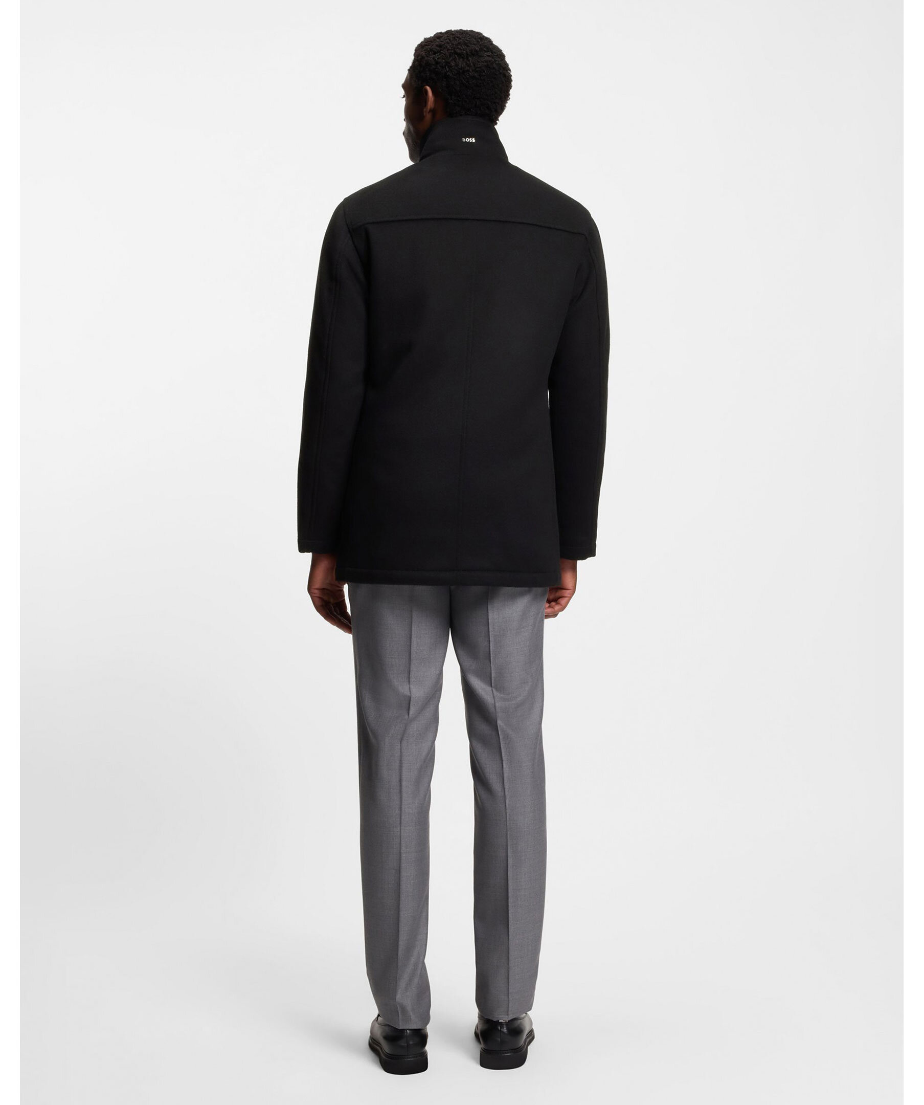 Svart rock i en blandning av ull och kashmir från BOSS Black. Avslappnad passform och har en inbyggd fodrad jacka. Hög krage, två framfickor och två innerfickor. Stängs med knappar framtill.
