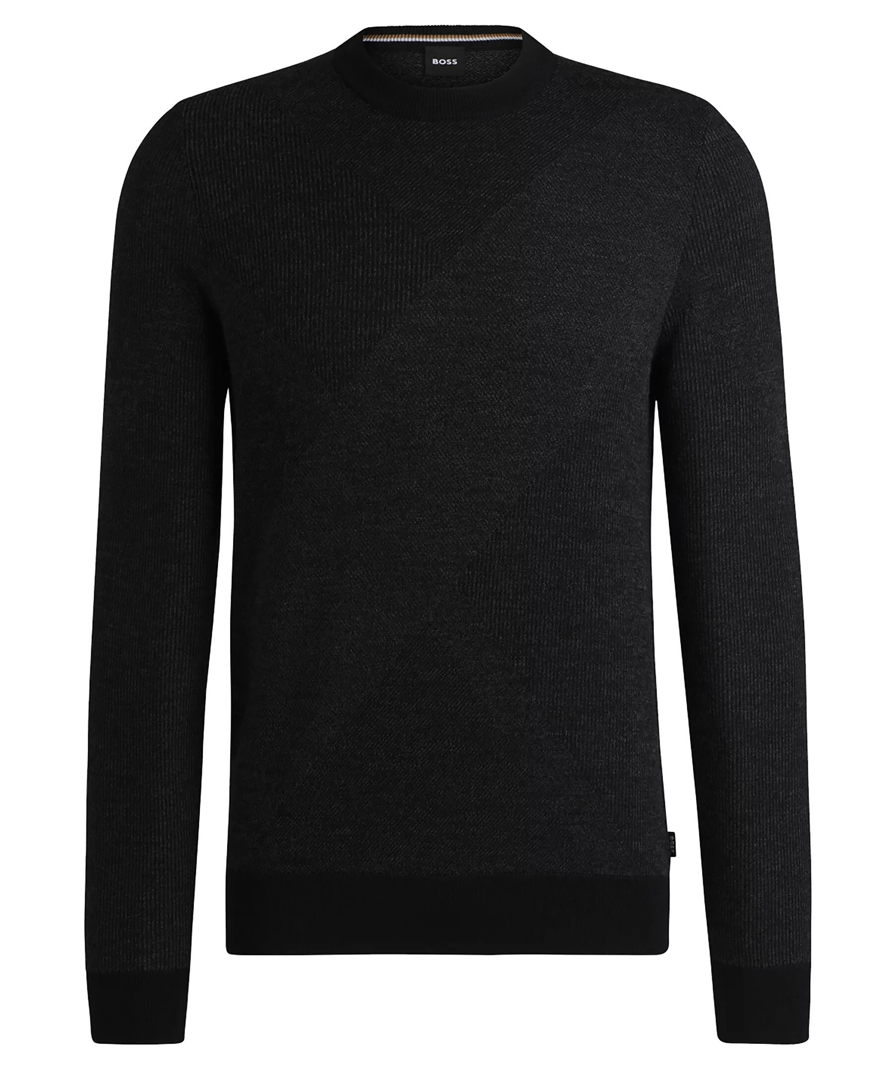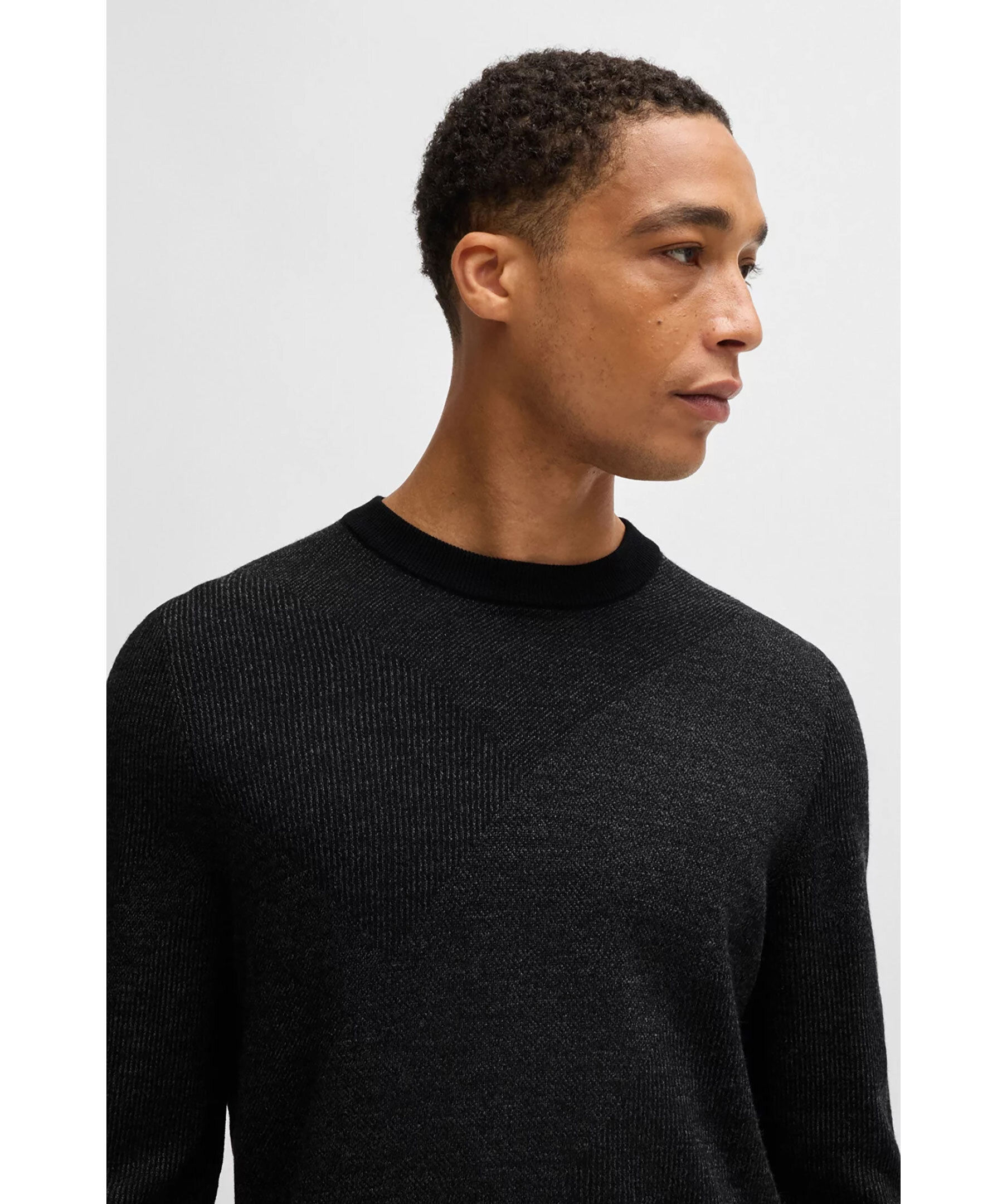 Svart stickad tröja från BOSS Black. Tröjan är stickad med både enfärgad och moulinégarn för en intressant textur. Denna regular-fit modell har ett tvåtonsmönster i jacquard över hela tröjan. Tillverkad i ull. Långa ärmar, ribbade ärmslut och standardlängd är den perfekt för en modern och bekväm stil!