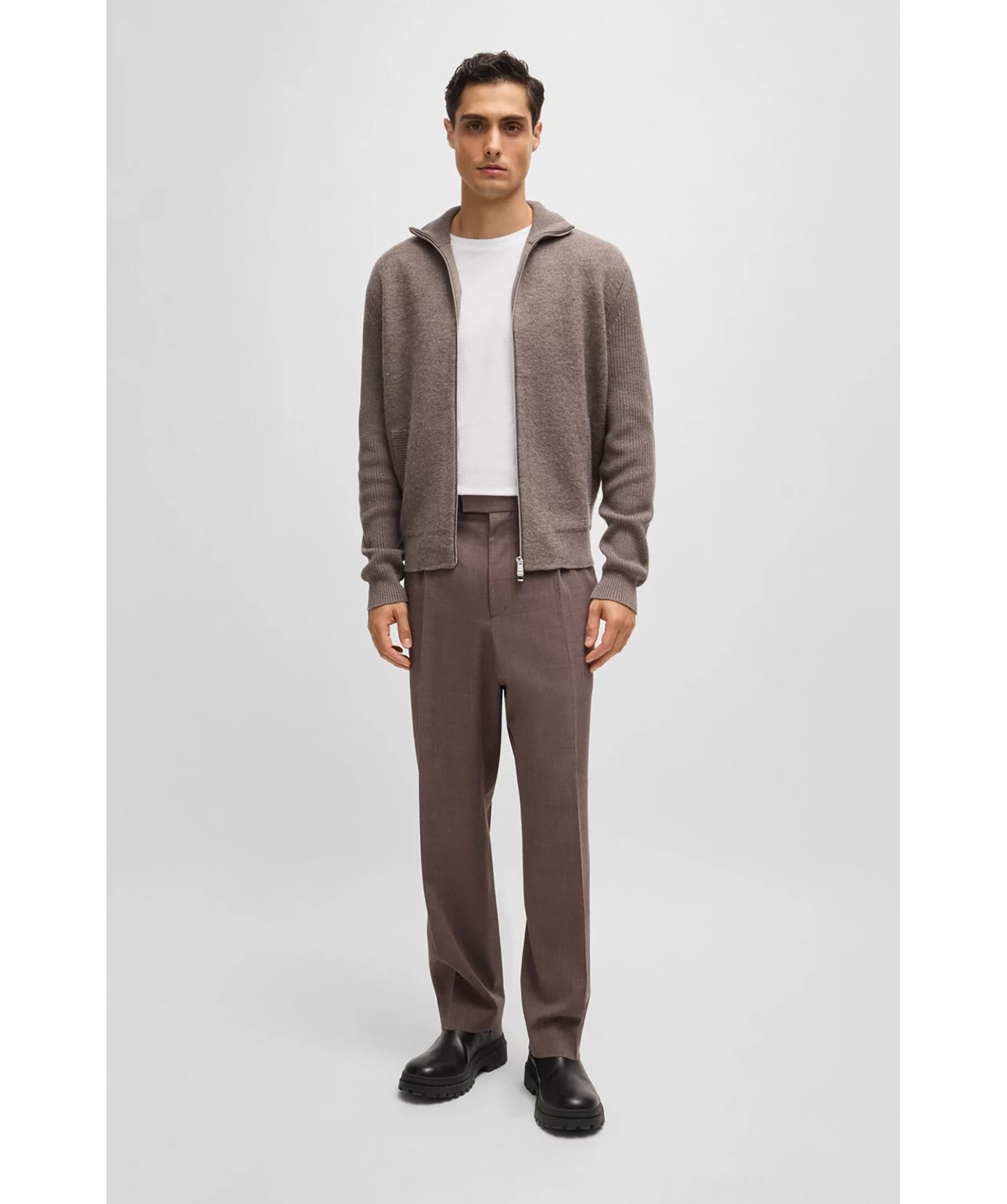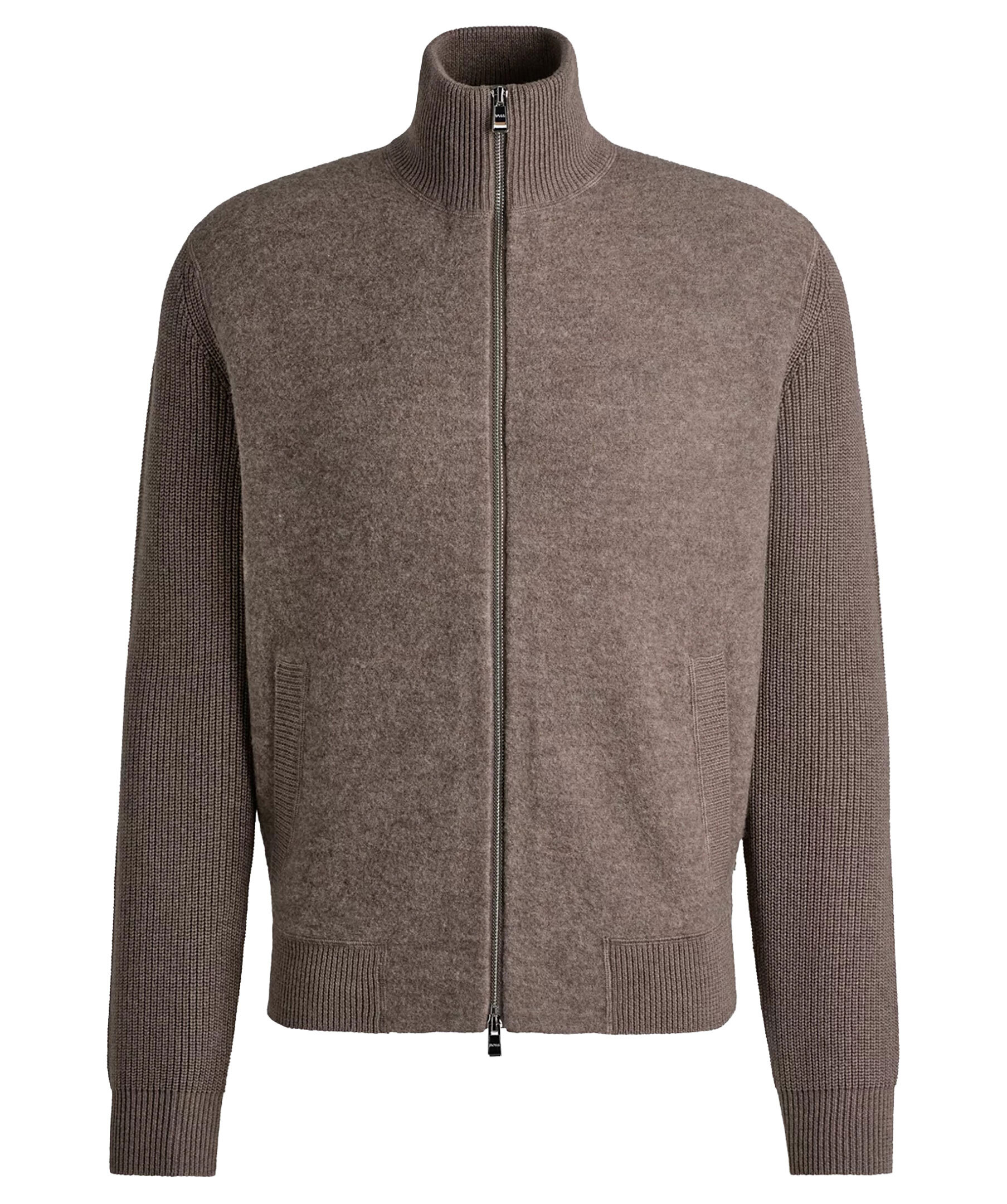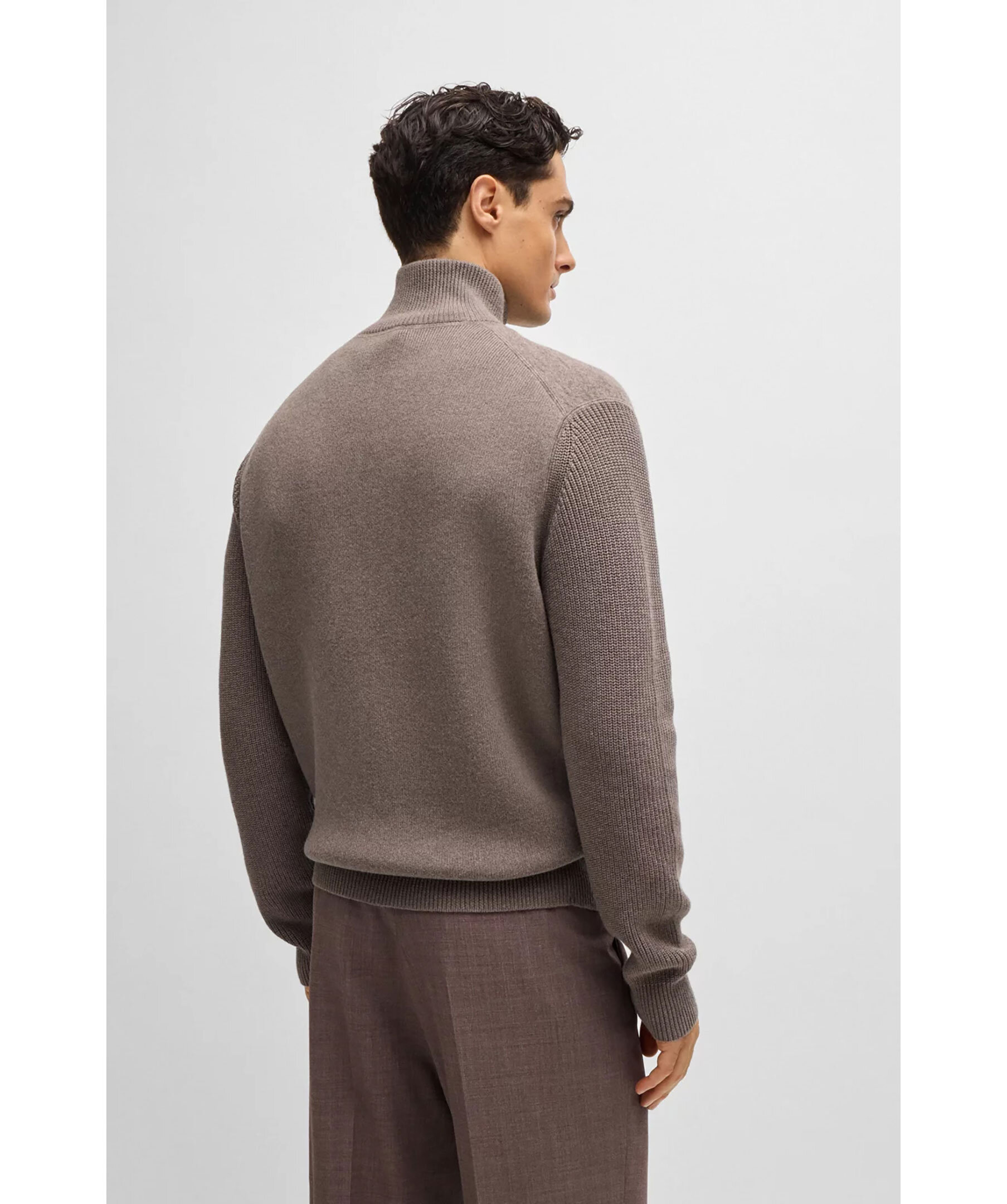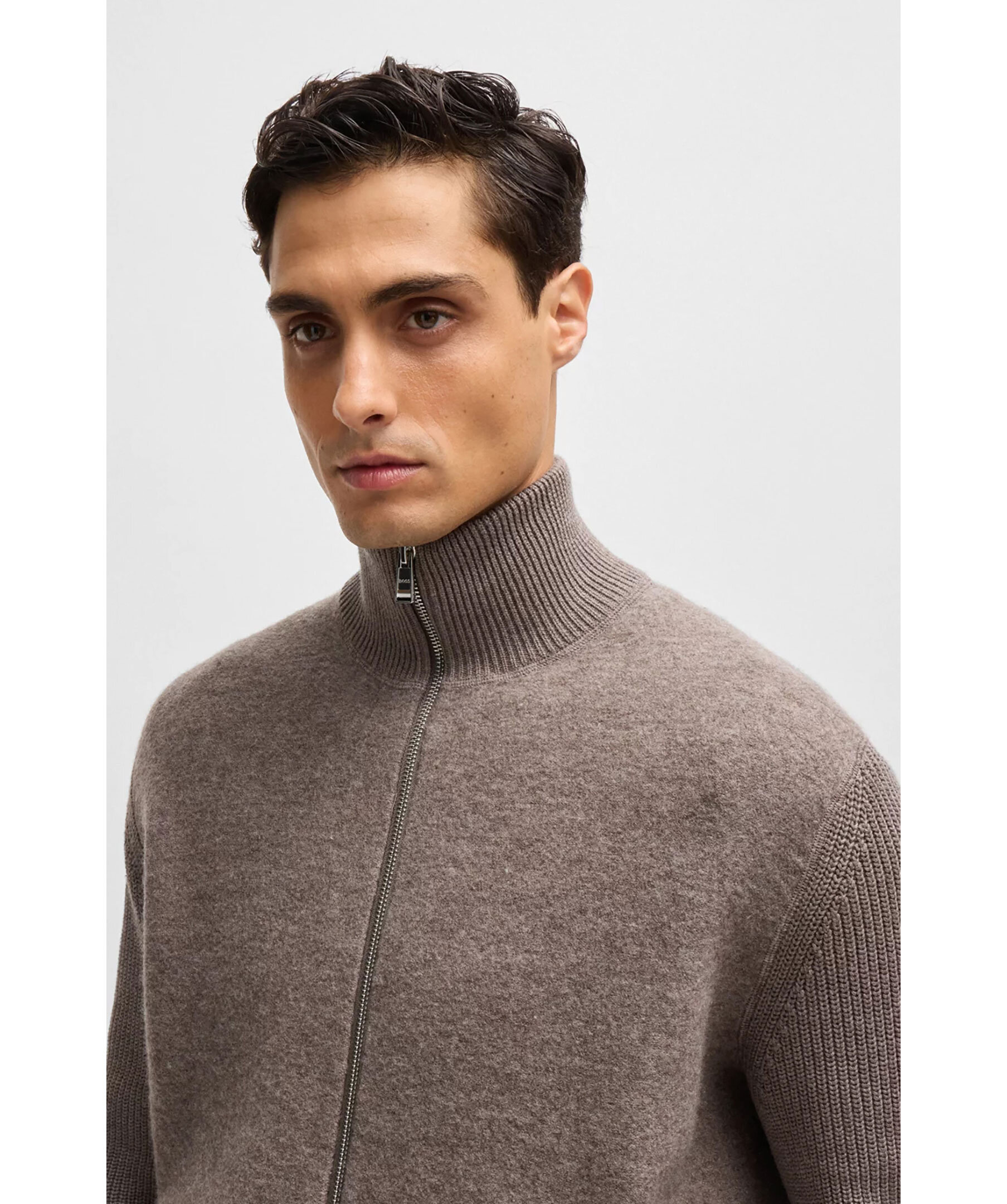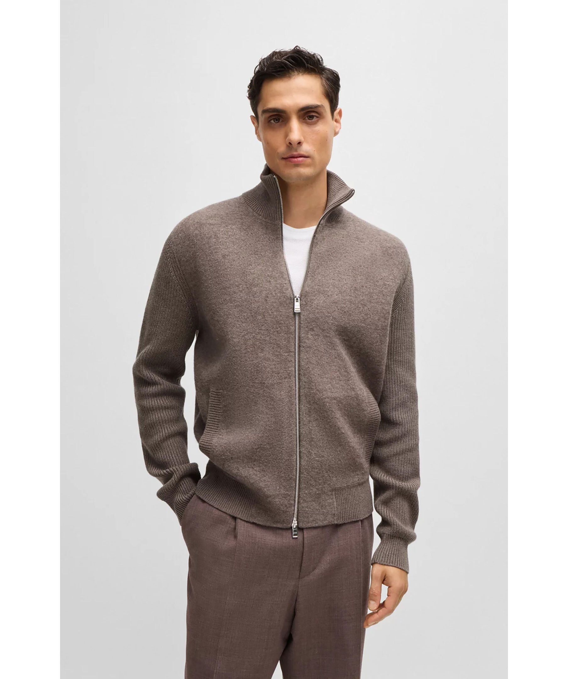 Ljusbrun stickad zip-up cardigan från BOSS Black. Stickad i olika strukturer och gjord i en ull och bomullsblandning. Hög krage, långa ärmar och praktiska fickor framtill.