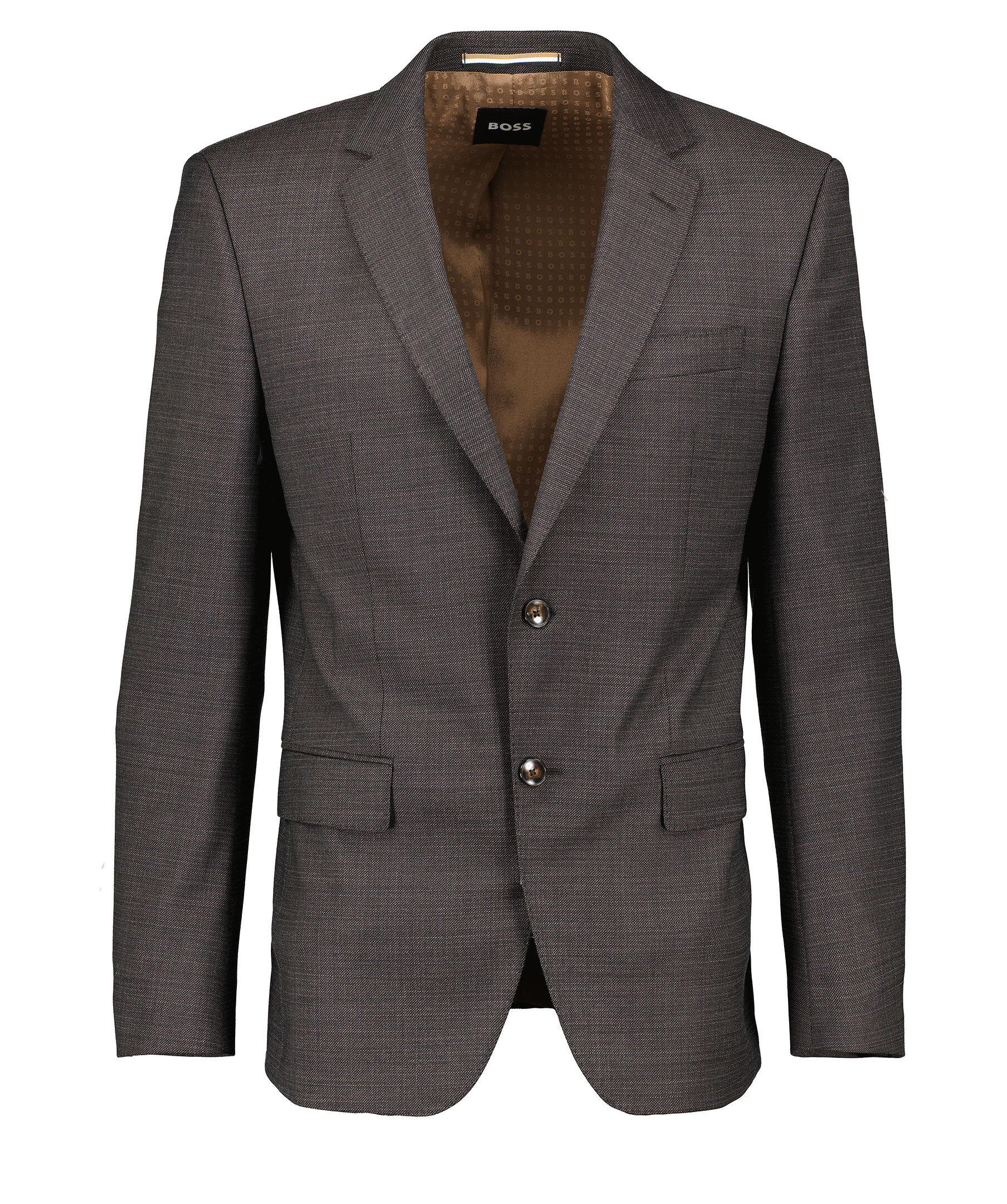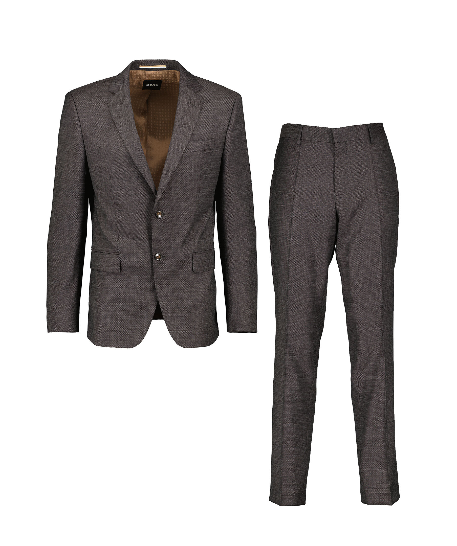 Mörkgrön kostym från BOSS Black. Kavajen stängs med två knappar framtill och har två fickor med lock samt en passpoalficka på bröstet. Byxorna har bälteshällor i midjan, två sidfickor samt två fickor baktill med knapp. Pressveck. Tillverkade i