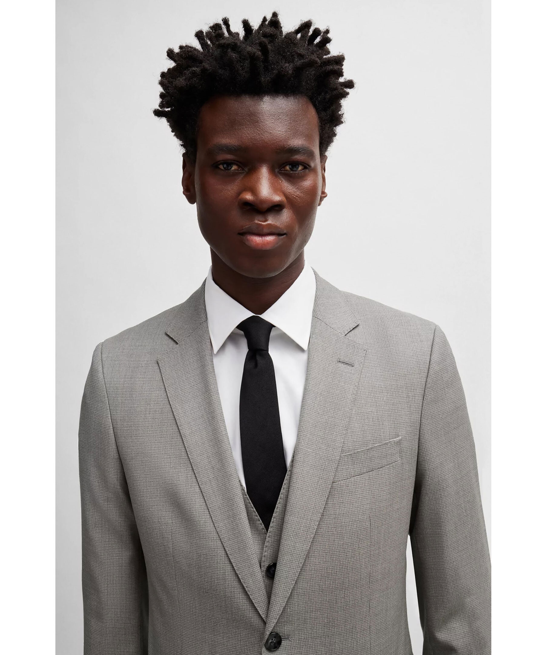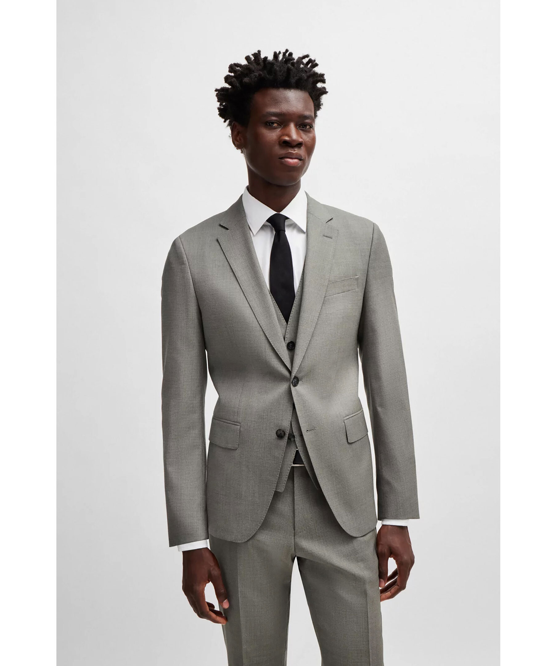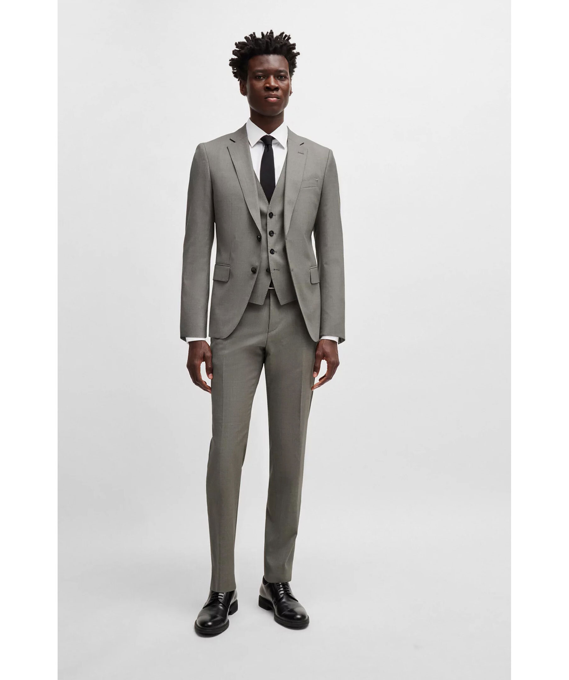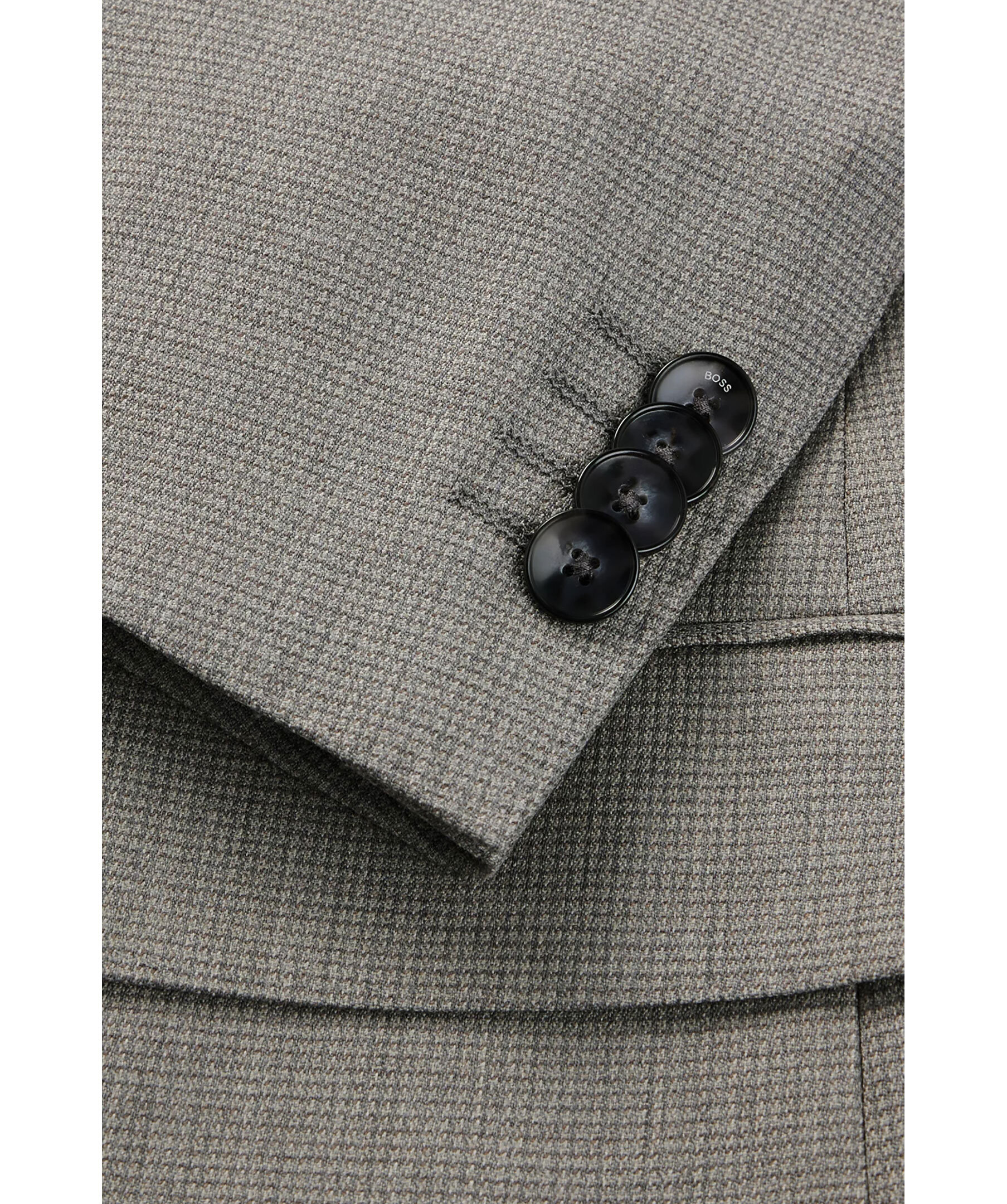 Grå kostym från BOSS Black. Kostymen har ett subtilt mönster. Kavajen är enkelknäppt, samt har naggade slag, två fickor och en bröstficka. Byxorna har bälteshällor i midjan, två sidfickor samt två passpoalfickor med knapp. Kostymväst med två passpoalfickor. Tillverkad i en ullblandning.