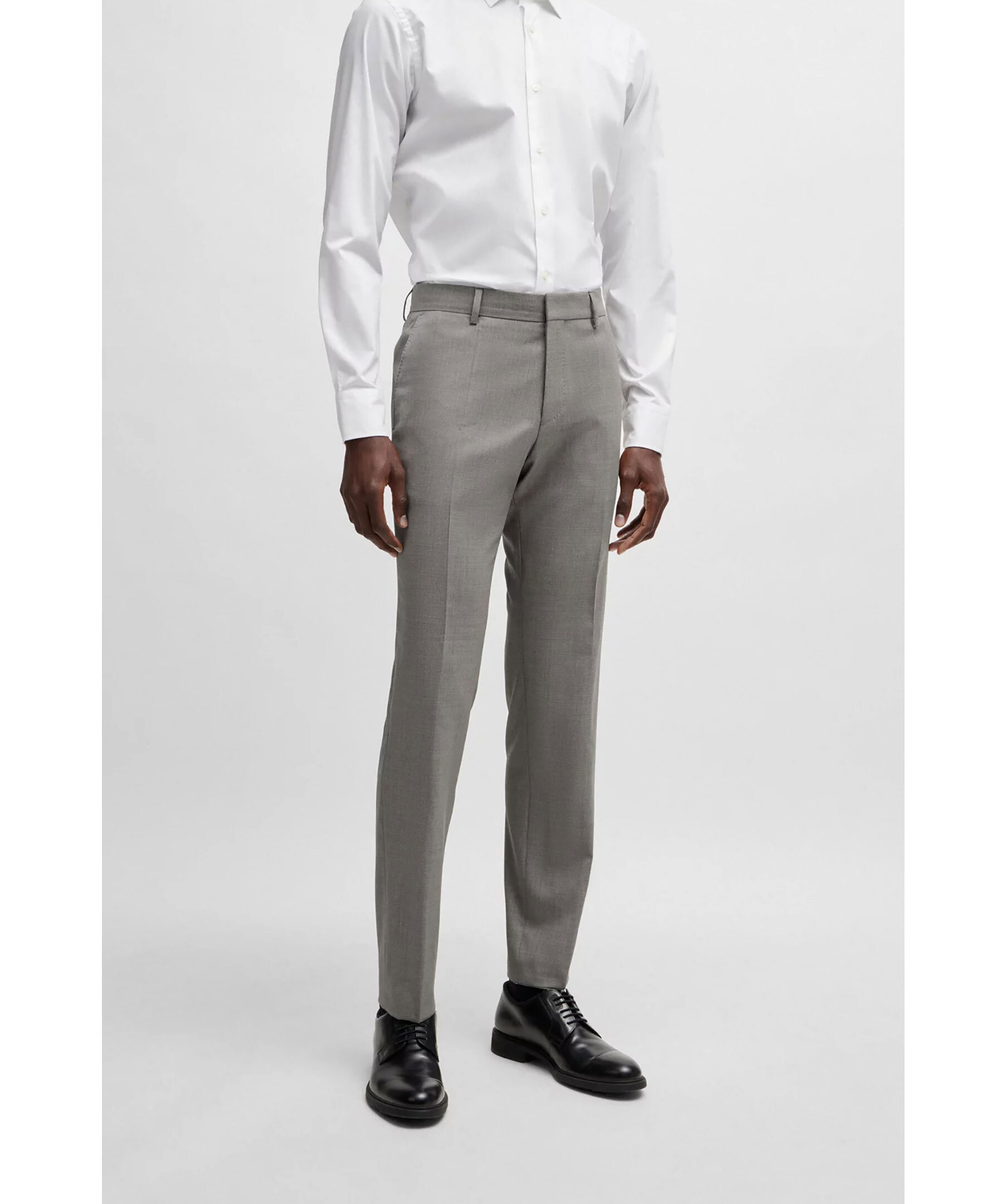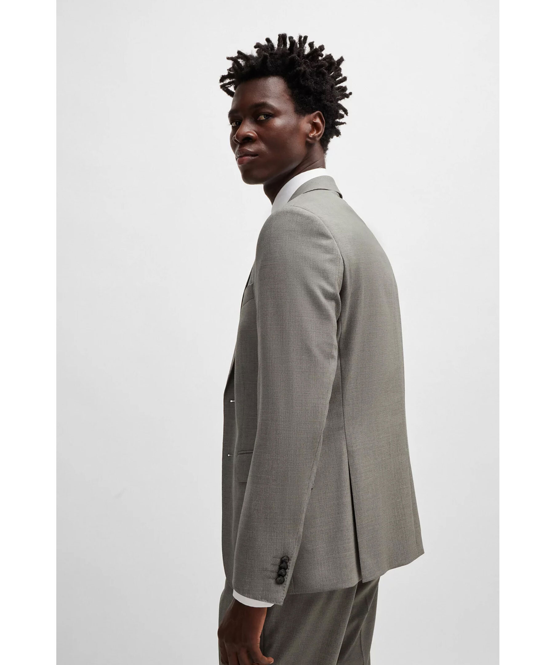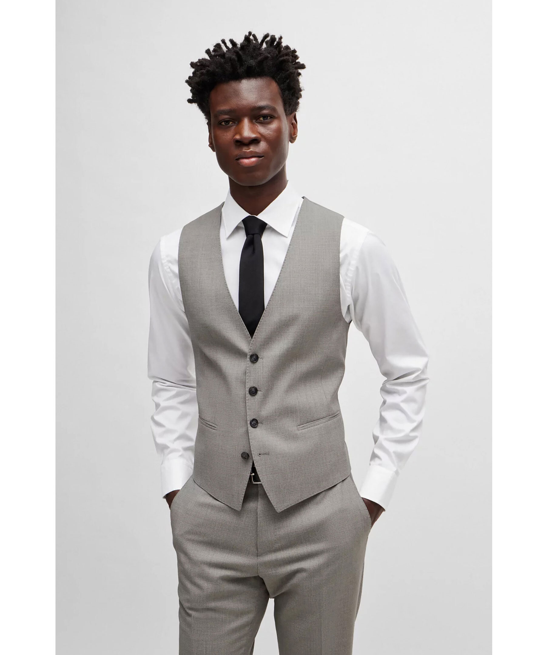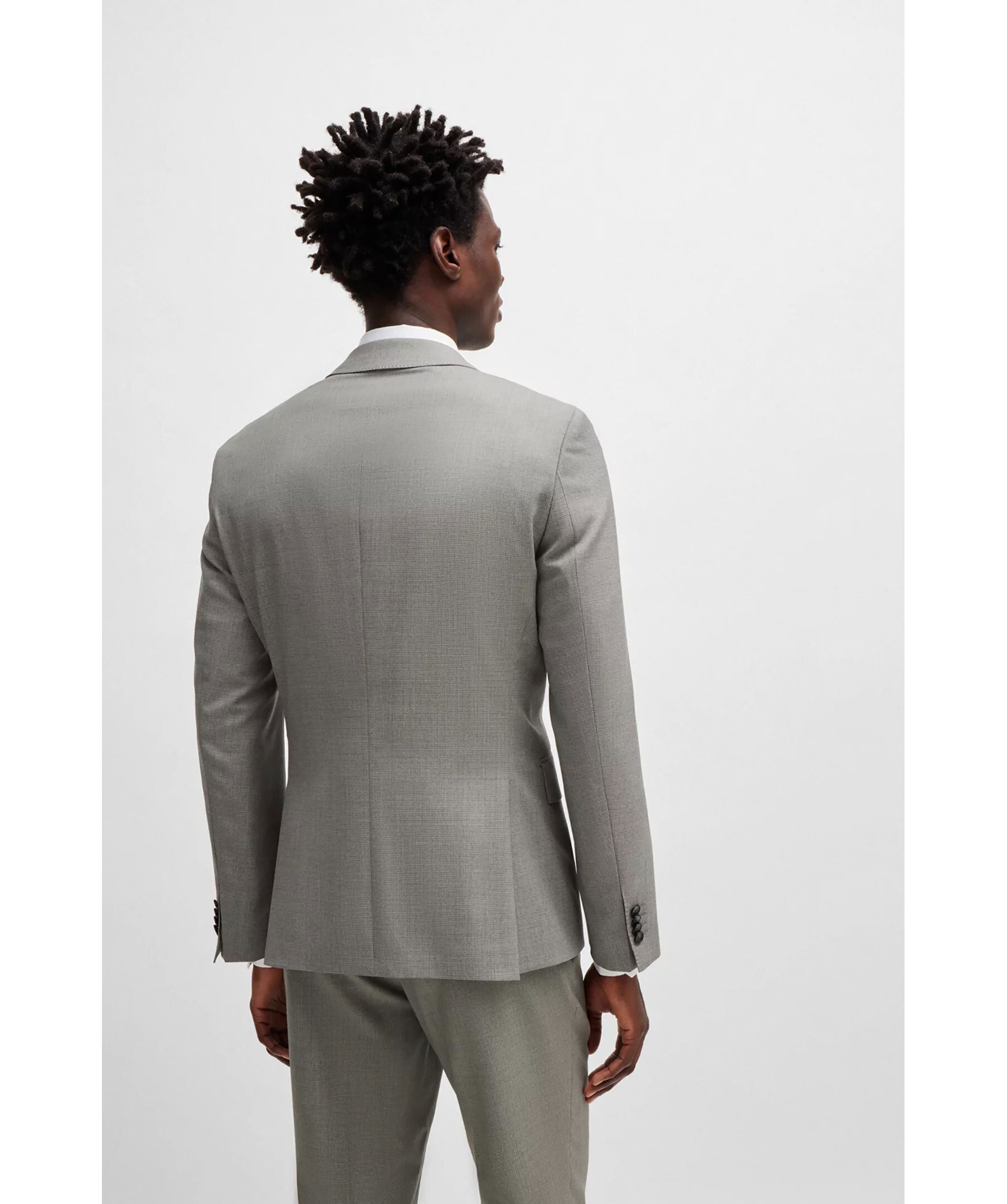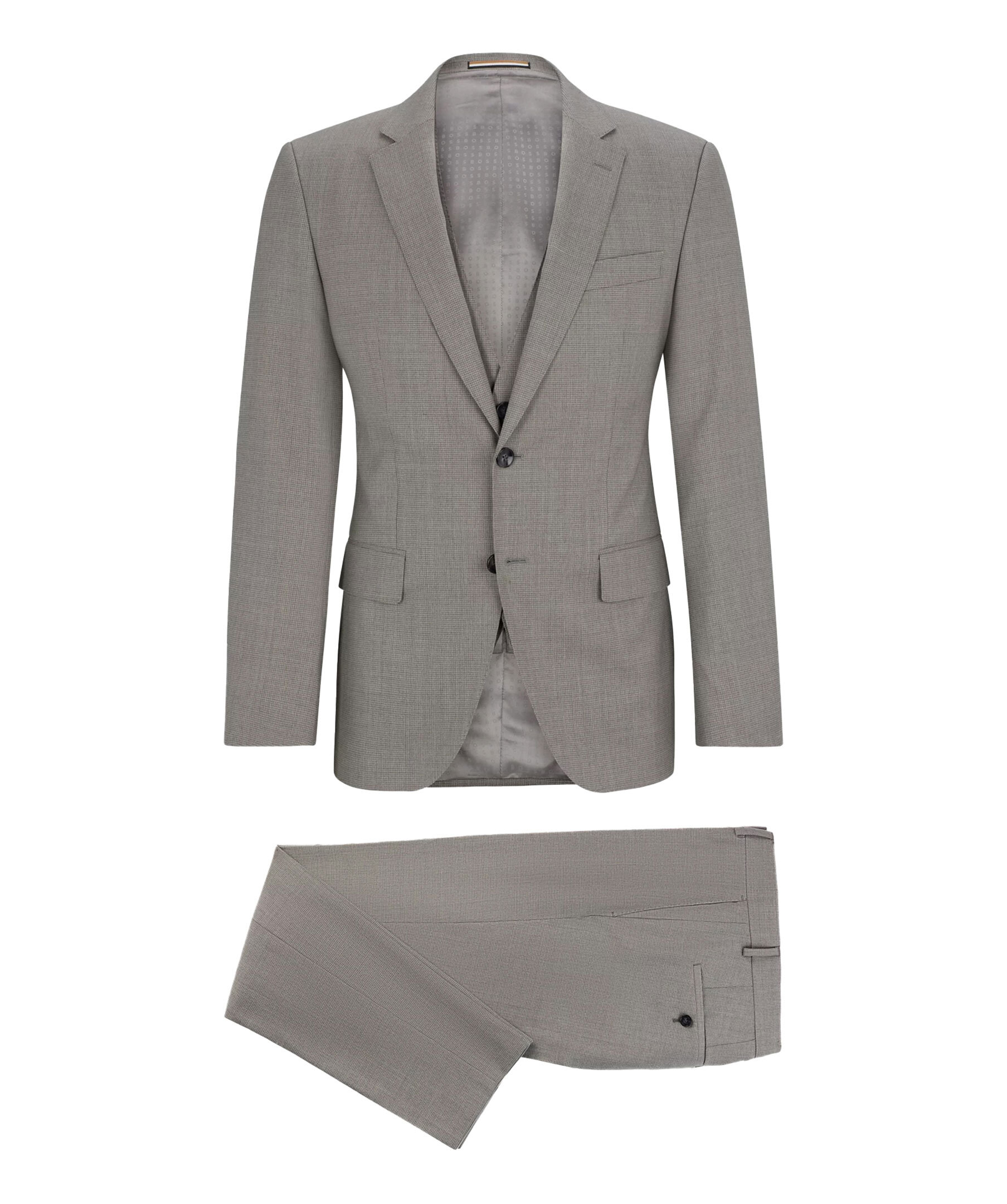Grå kostym från BOSS Black. Kostymen har ett subtilt mönster. Kavajen är enkelknäppt, samt har naggade slag, två fickor och en bröstficka. Byxorna har bälteshällor i midjan, två sidfickor samt två passpoalfickor med knapp. Kostymväst med två passpoalfickor. Tillverkad i en ullblandning.