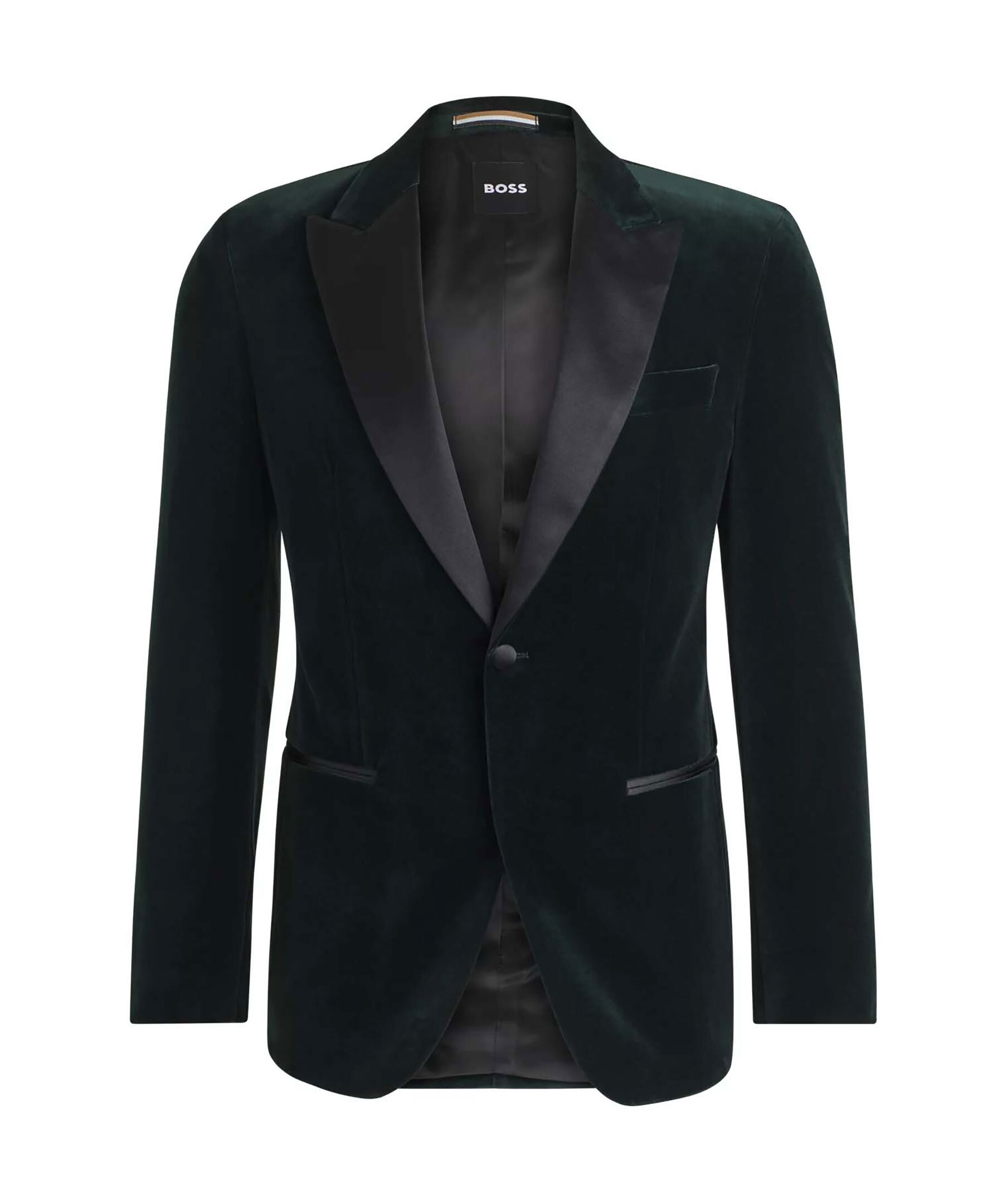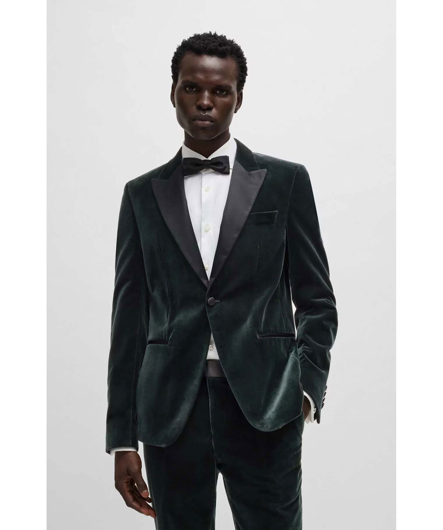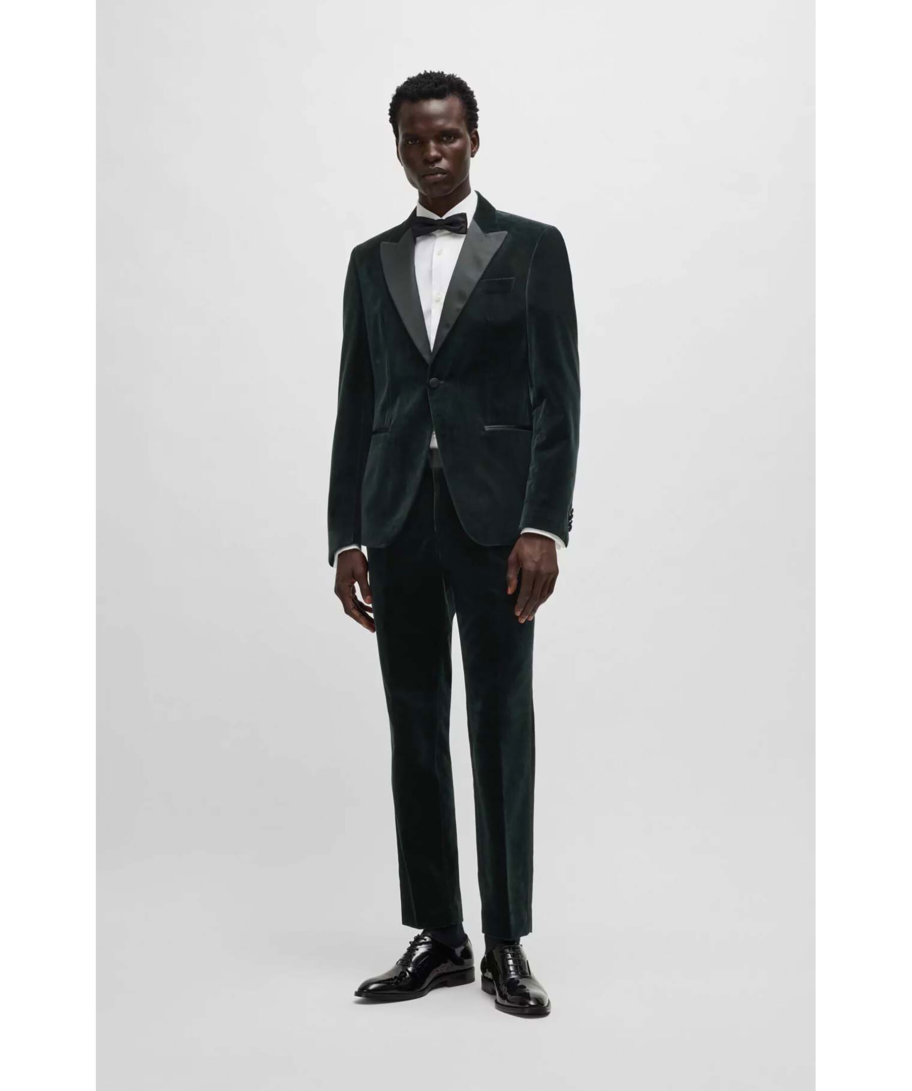 Grön smokingkavaj i mjuk sammet BOSS BLACK. Kavajen stängen med en enkelknappstängning och är gjord i bomull. Slim fit passform för ett figursytt utseende. Silkesblandade accenter.