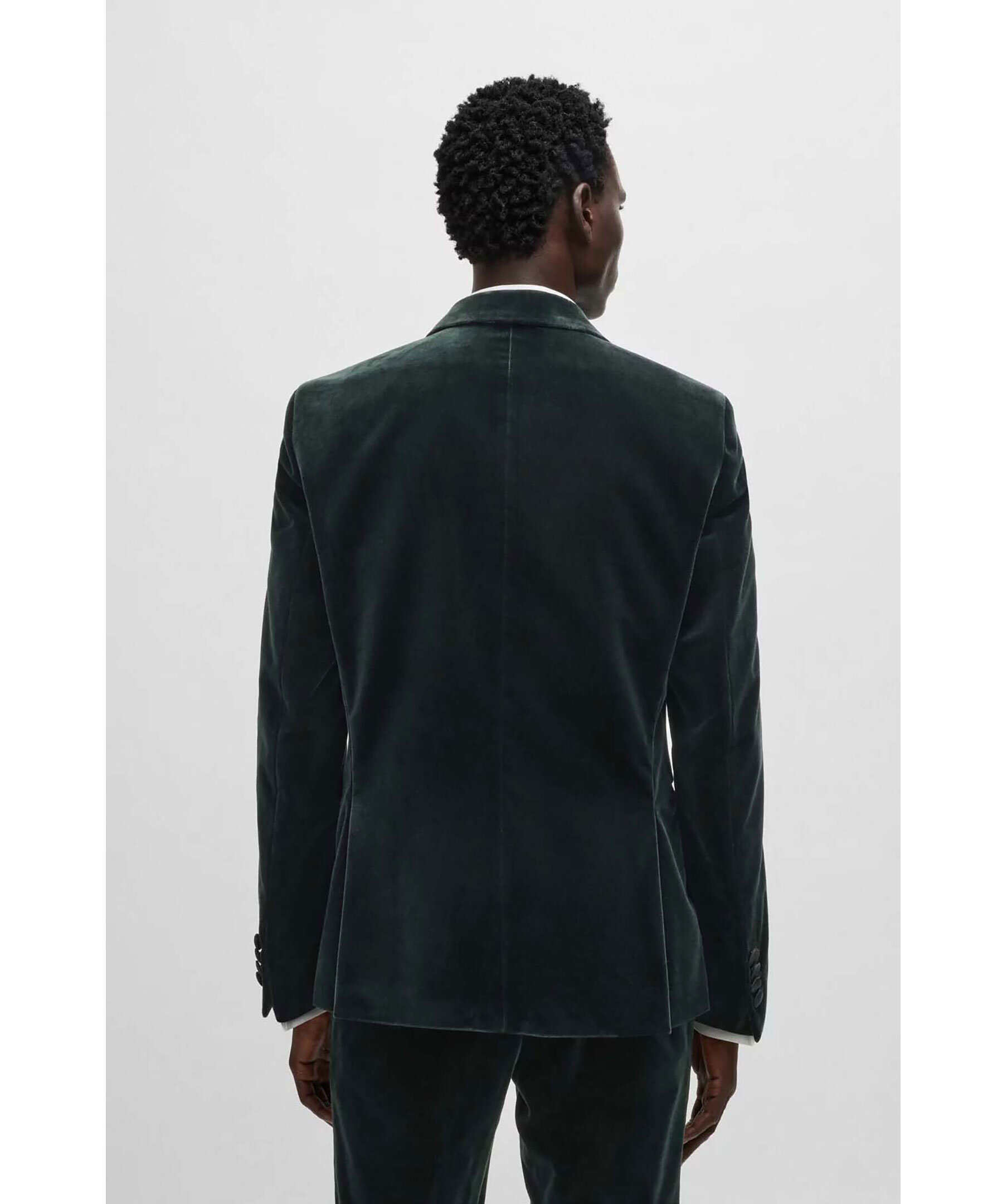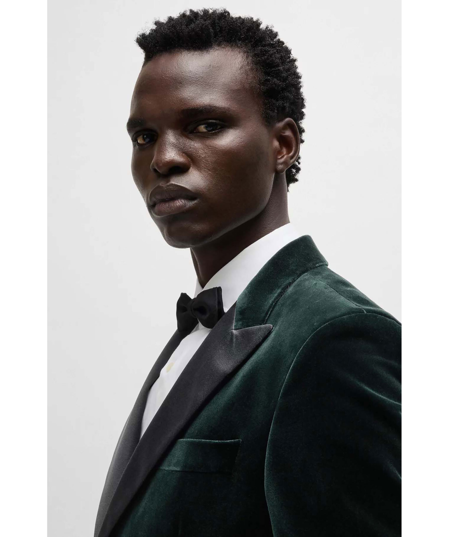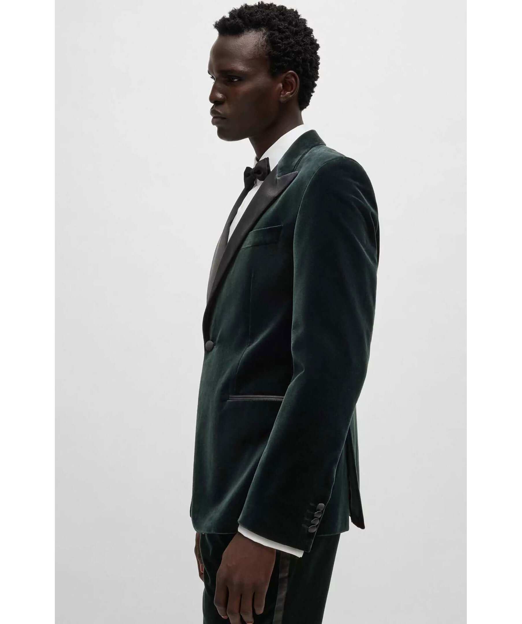 Grön smokingkavaj i mjuk sammet BOSS BLACK. Kavajen stängen med en enkelknappstängning och är gjord i bomull. Slim fit passform för ett figursytt utseende. Silkesblandade accenter.