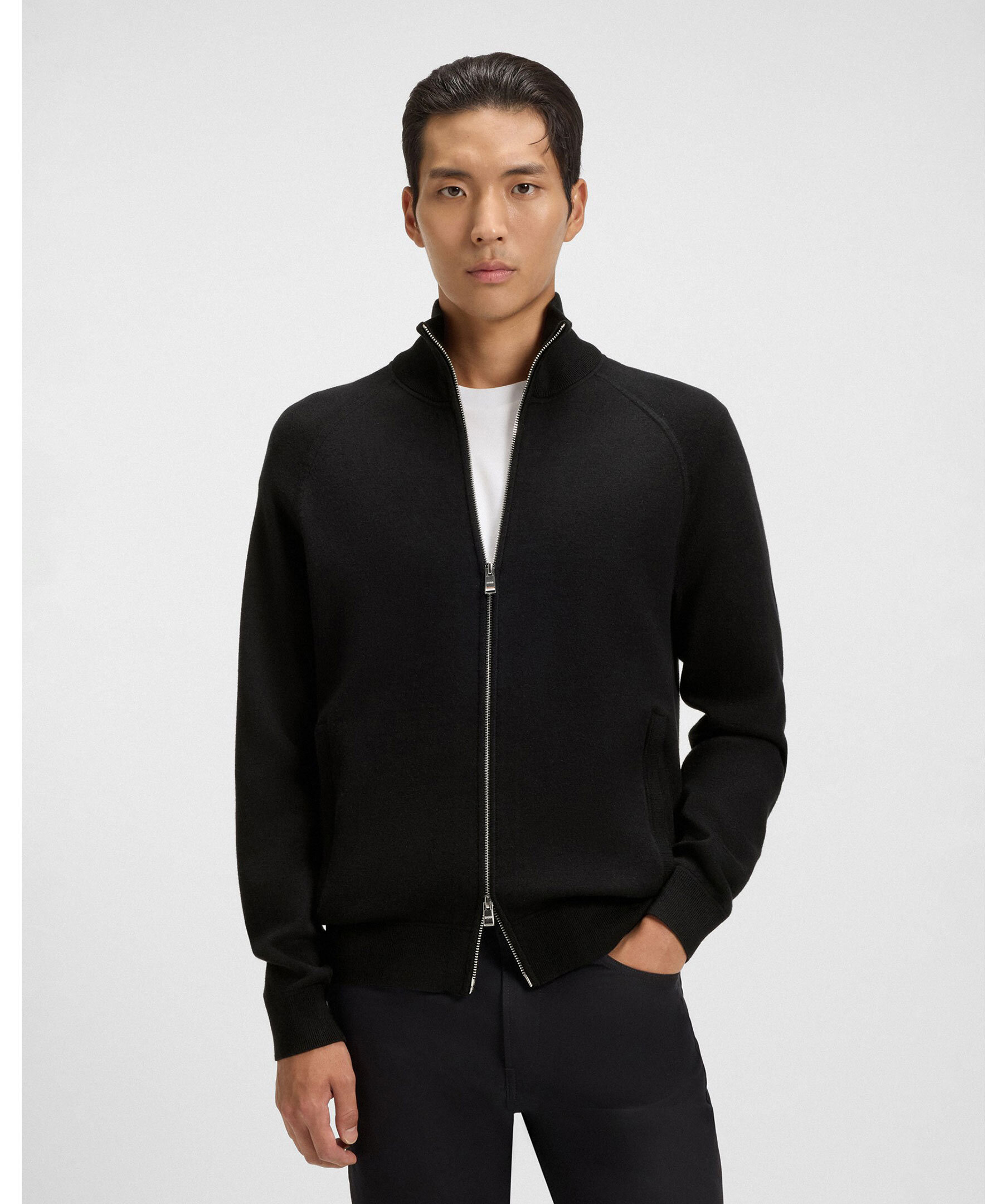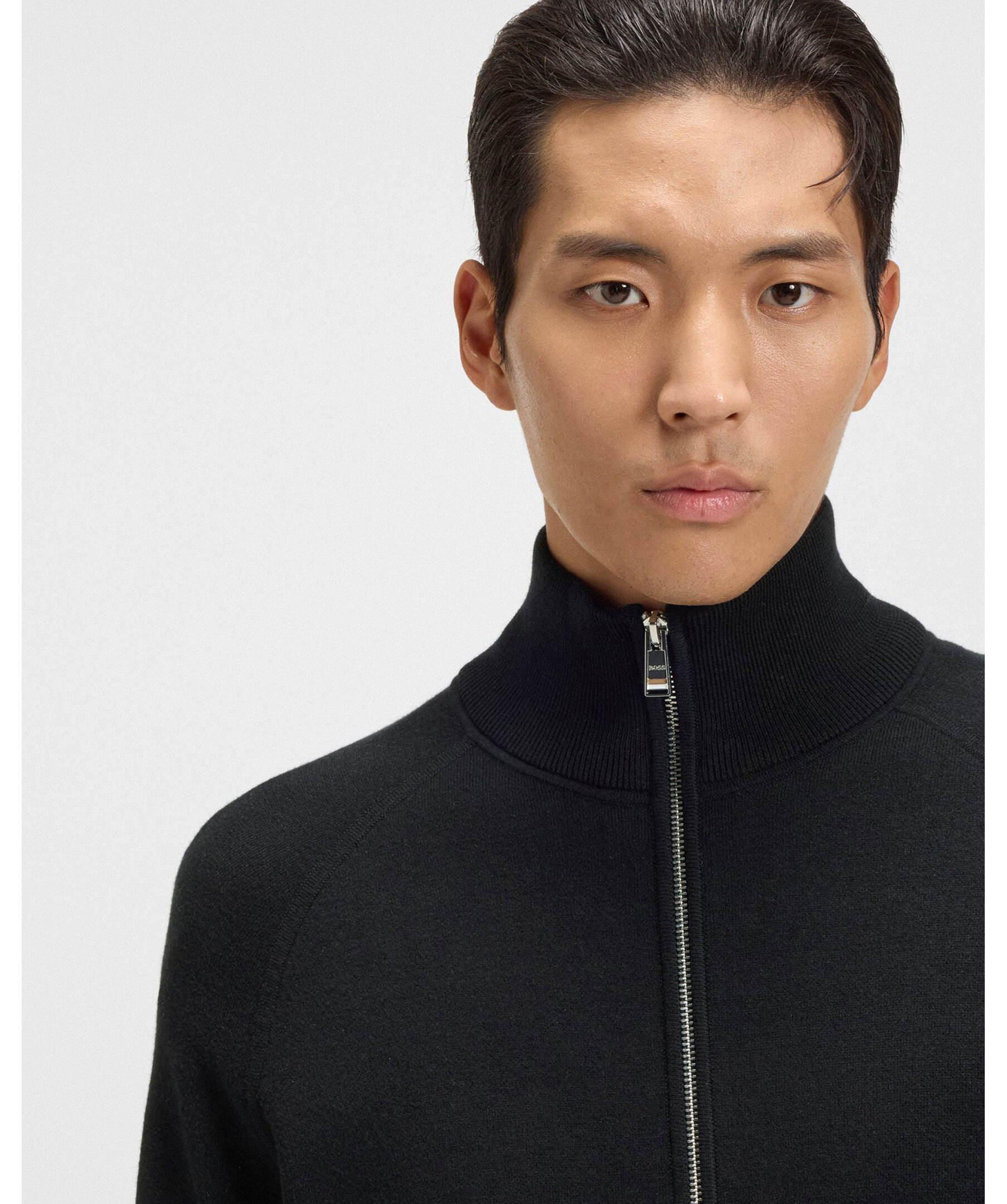 En stilren cardigan med hel dragkedja, tillverkad i en mjuk blandning av bomull och ull. Ribbstickade avslut och stilren design gör den lätt att bära både öppen och stängd.