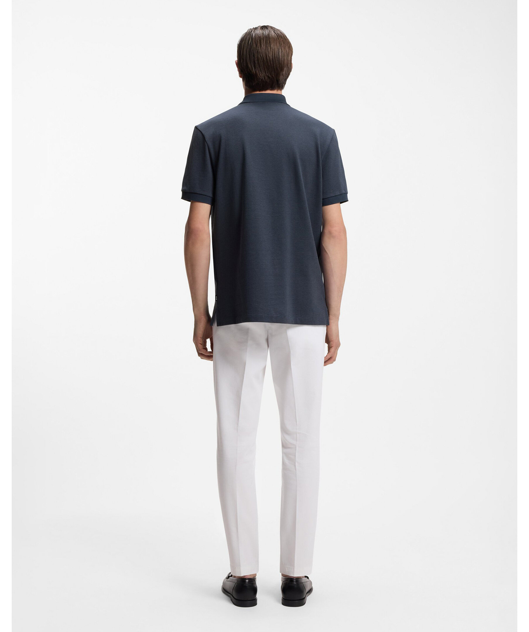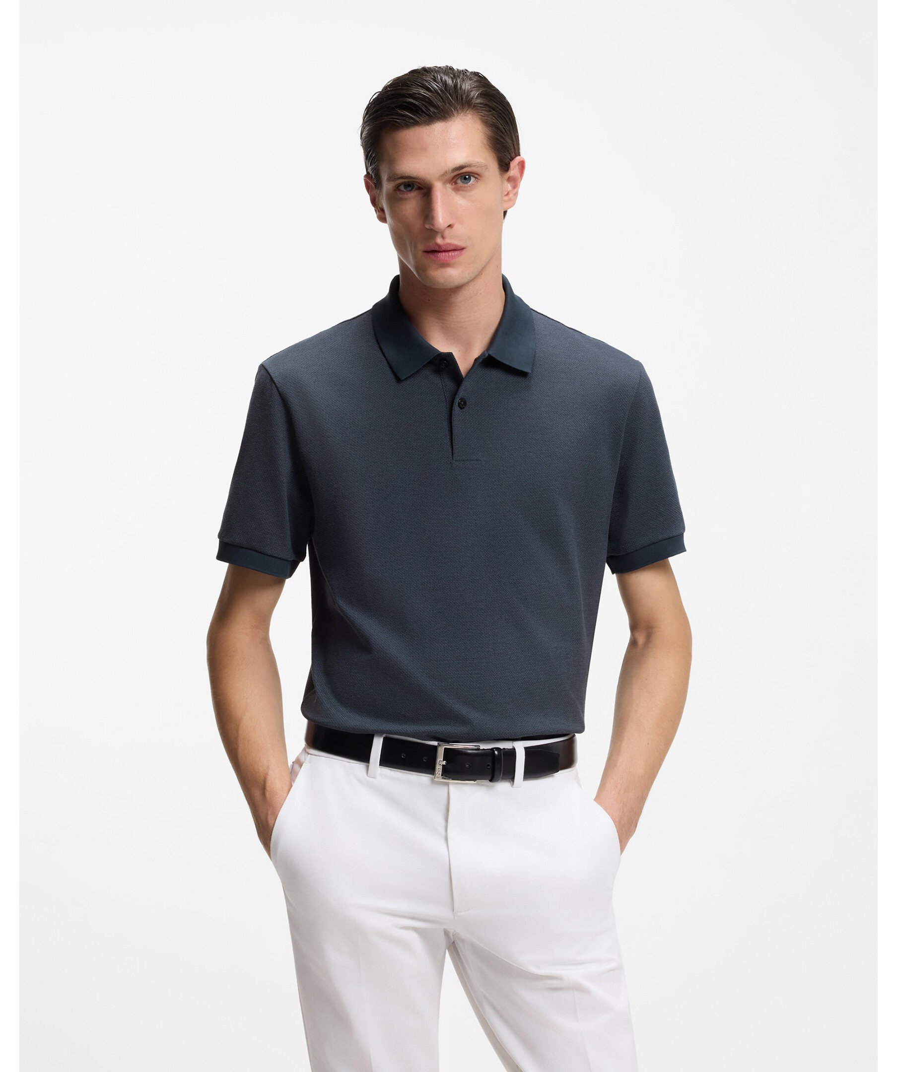 Mörkblå pikétröja från Hugo Boss i en unik bubble structure-textur som ger plagget en lekfull och modern twist på den klassiska pikétröjan. Tröjan har en regular fit som sitter bekvämt och elegant, kort ärm och klassisk pikékrage med knappslå - perfekt för både casual och lite mer dressade looks. Den texturerade ytan ger ett subtilt uttryck som lyfter basgarderoben.